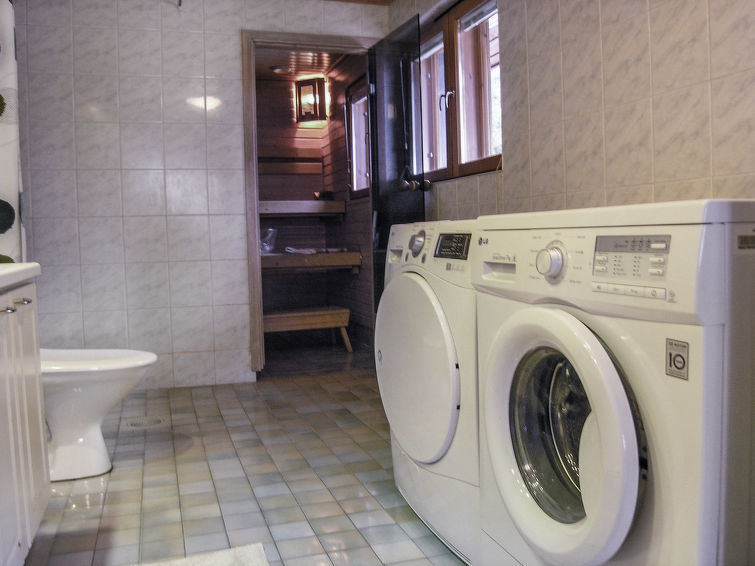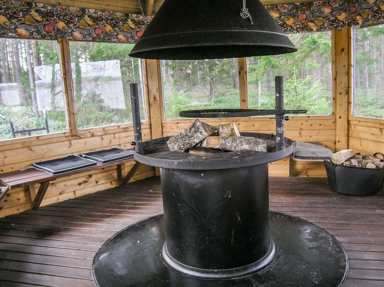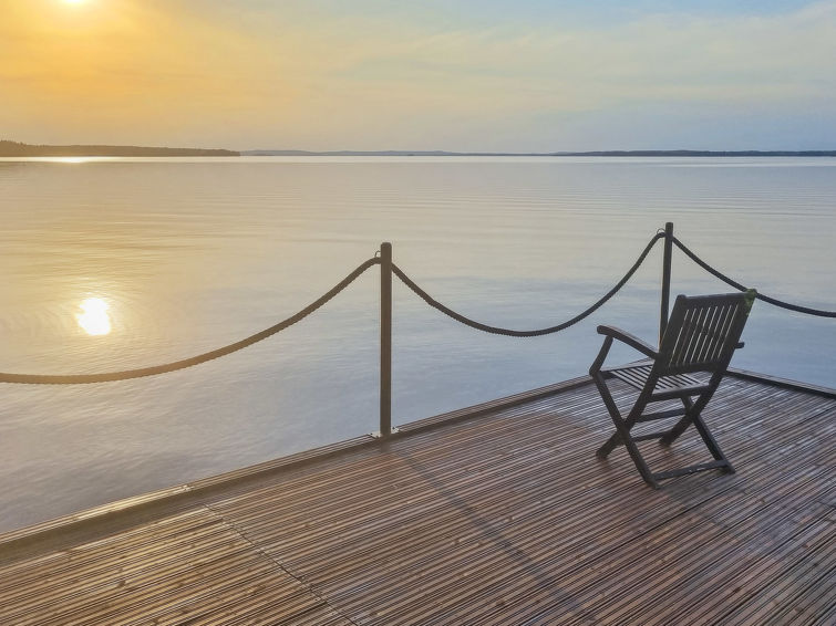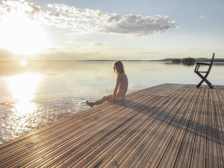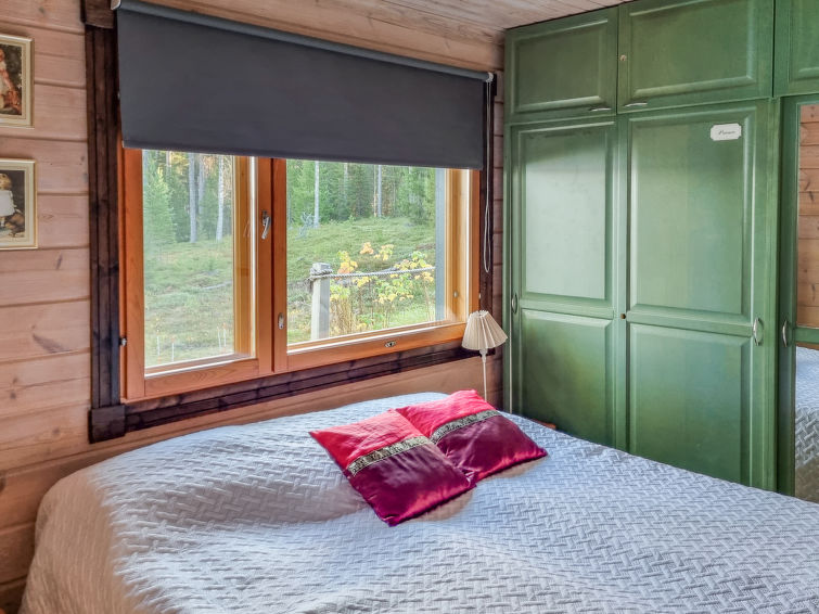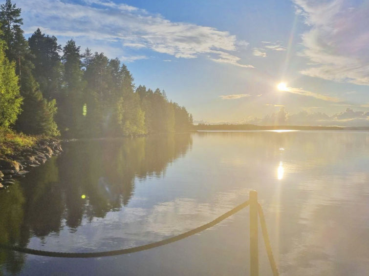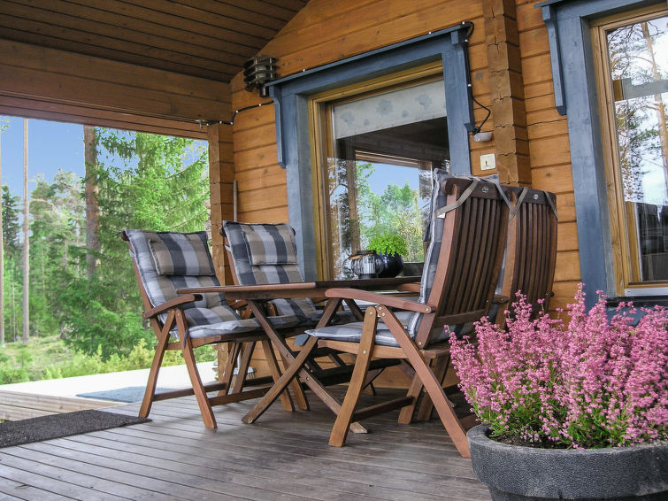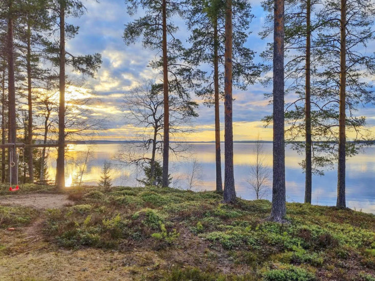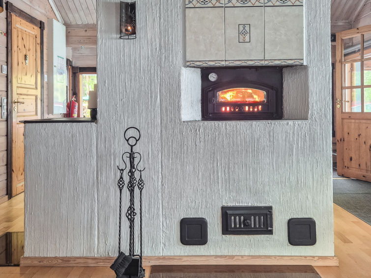 29 km east of Kajaani, Lake Nuasjärvi 30 m (length 30 km, width 5 km), fairly deep shore, hard moraine/ sand bottom, own boat. Log cottage 1999, living room/ kitchen, 2 bedrooms double bed in each, sleeping loft 2 beds, washroom, sauna (elec. stove), open porch. Lakeshore sauna (12 m²) with dressing room, sauna with elec. light, water must be carried to the lakeshore sauna from standpipe or from the bathroom of the main building during October-April. High quality, elegant cottage, with plenty of space in living room area. Located on shore of large waterway, opposite shore 5 km. Well maintained plot on slope, steps from lakeshore sauna to jetty. Peaceful location. Vuokatti 3.5 km and Katinkulta by boat 2 km, by road 6 km. Nuasjärvi is well stocked with fish. Neighbouring cottage is 8105.