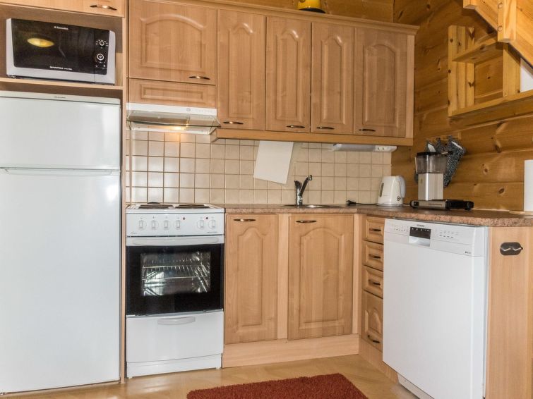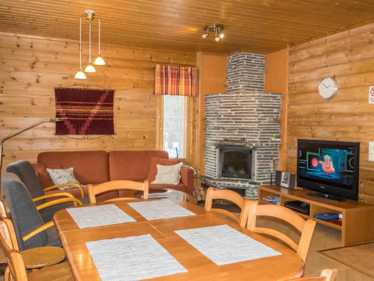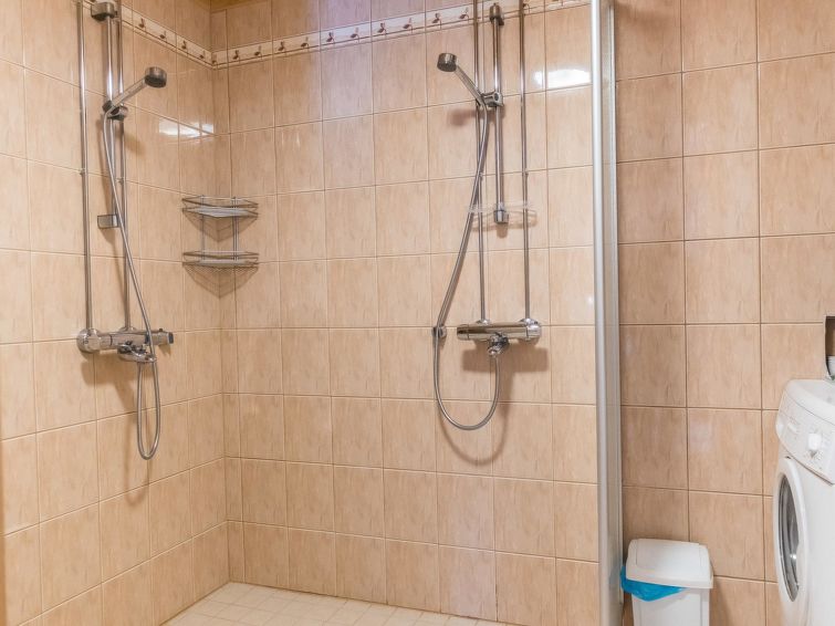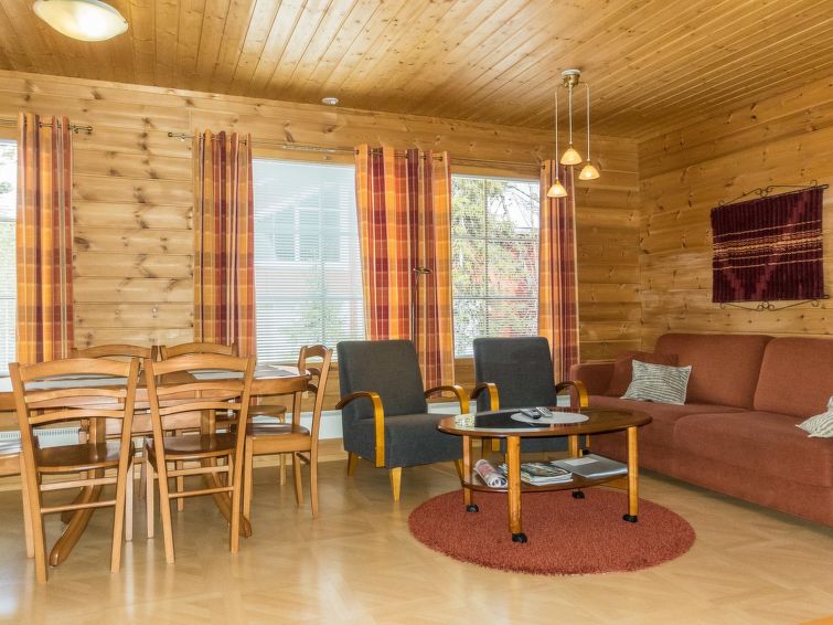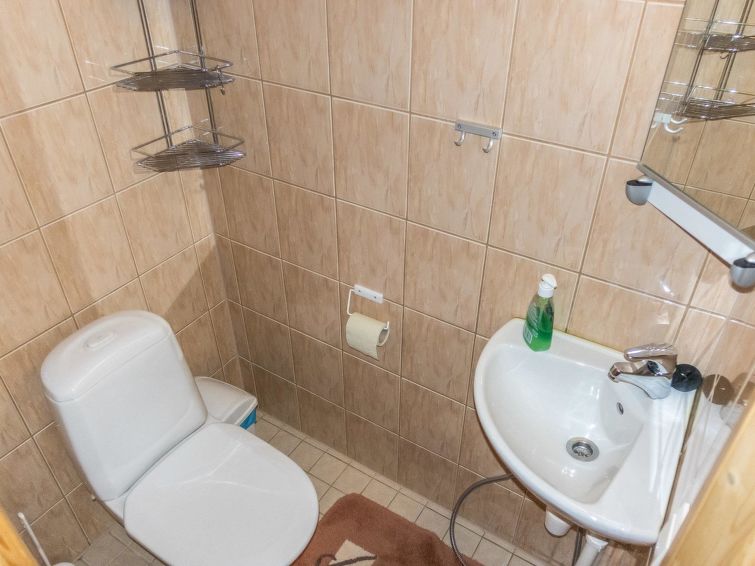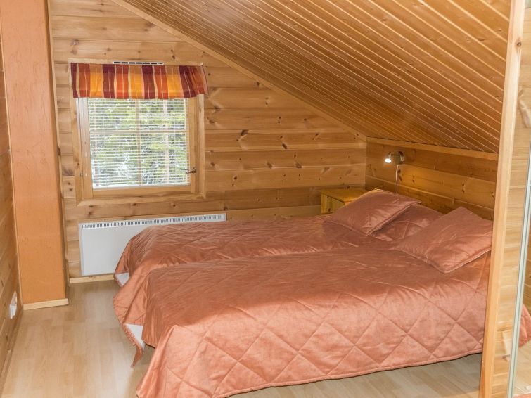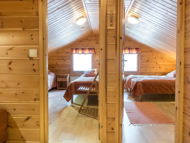 A semi-detached house, built in 2005, sauna is renovated in 2011. Ground floor: kitchen/livingroom, bedroom with 2 beds, sauna (electric stove), bathroom (2 showers), separate toilet, small open veranda. Upstairs: 2 bedrooms, both with 2 beds, bedrooms has sloping roofs, toilet also upstairs, lounge area. Radio/CD-player. Two TV's, one in the bedroom upstairs, TV in living room has PC interface. Steady stairs to upper floor (child safety gate at the top of the stairs).