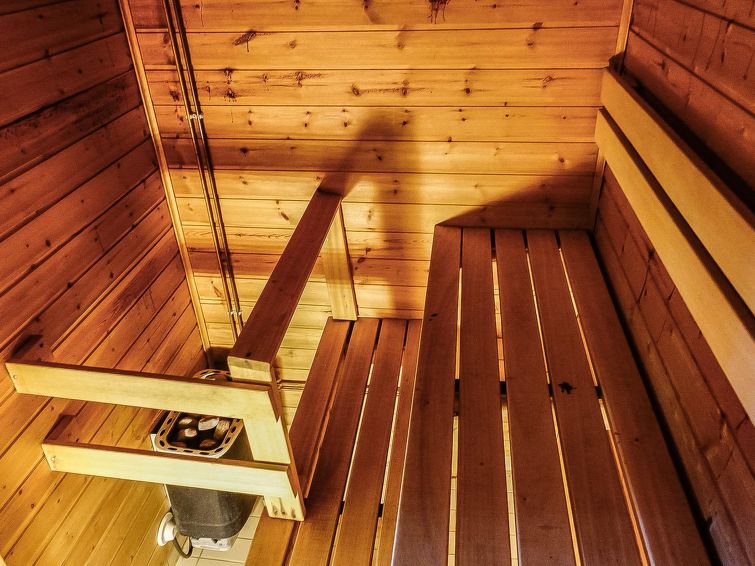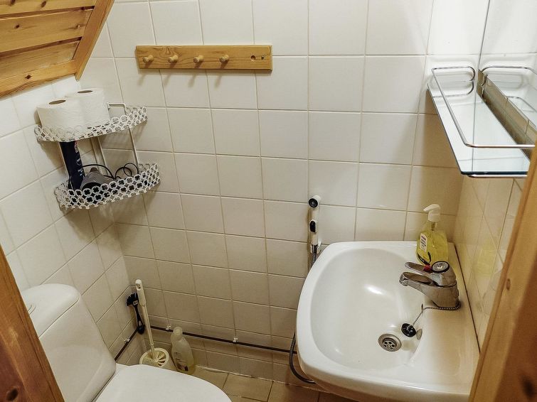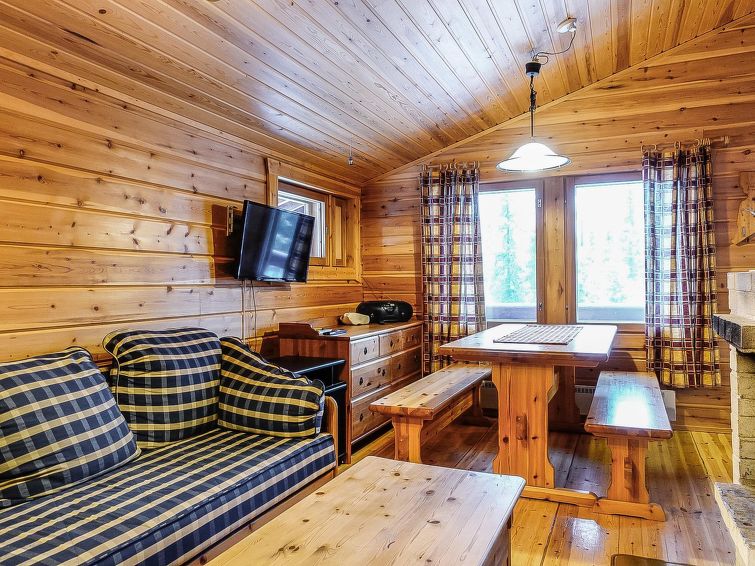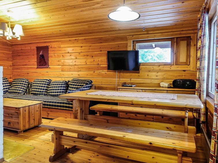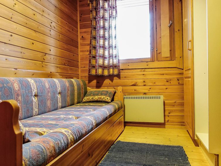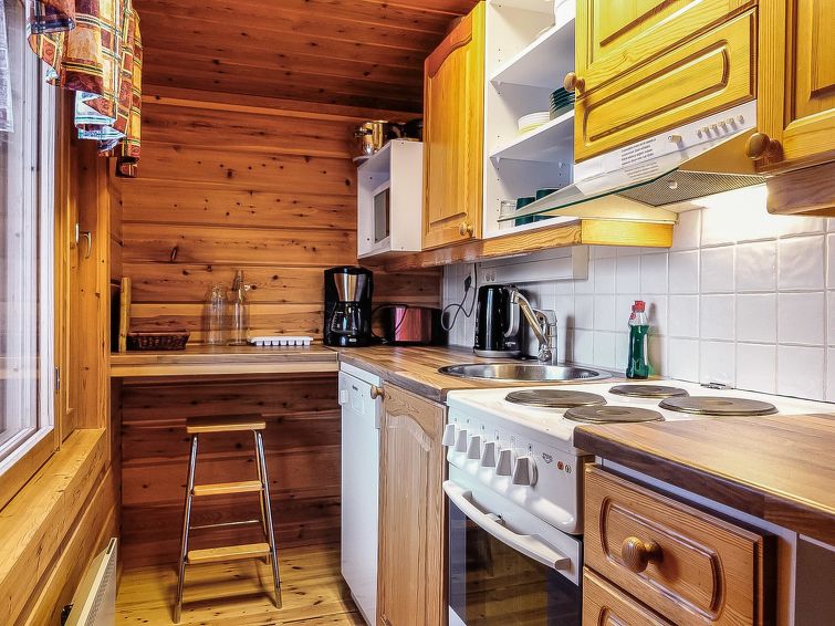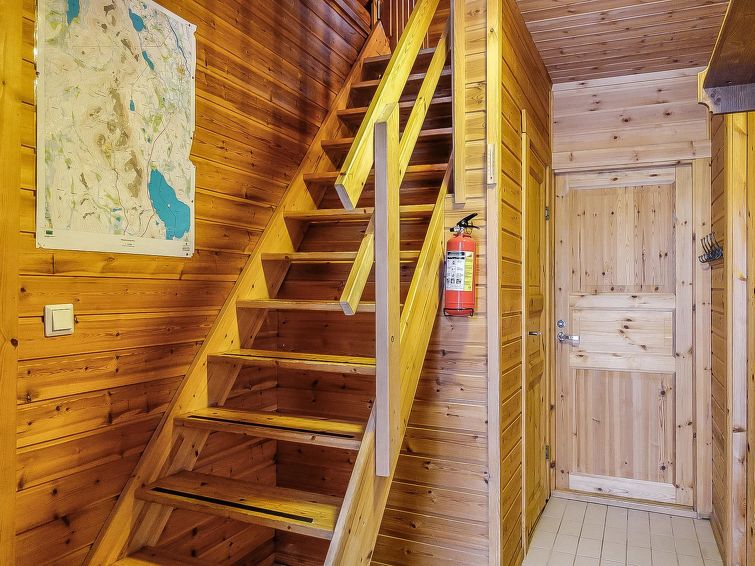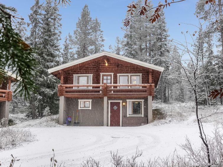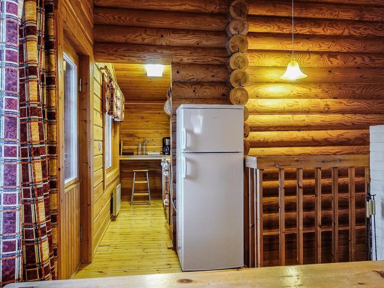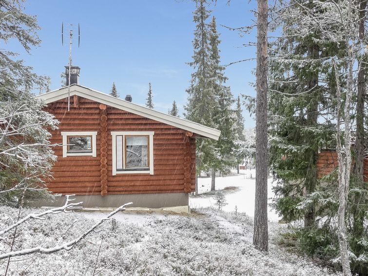 220 km north of Rovaniemi, Olostunturi tourism center. A log cabin, inside partially paneled, built in 1991. Upstairs: Living room with sofa bed, kitchenette, bedroom (no door) with 2 beds, a balcony. Ground floor: master bedroom with bunk bed, sauna (electric stove), bathroom, separate toilet. Quite steep stairs. A well-equipped cottage for active people in Olostunturi. Ski tracks and runs next door. The nearest neighbour cottage (5 m). Pallastunturi 25 km, Levi and Ylläs 55 km. Muonio center 6,5 km, border crossing to Sweden 8 km. Muonio River 8 km.