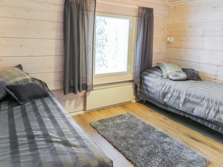 40 km north of Kolari, in Äkäslompolo, a log cottage, built 2016. 150 m², downstairs with 2 bedrooms, one with double bed and other with 2 separate beds, livingroom/kitchen, spacious sauna (electric heated), washroom, toilet. Upstairs with 2 bedrooms, one with double bed, other with 2 separate beds, toilet, shower, hydro massage bath. Other: Internet USB modem, warm storage with ski waxing table.
