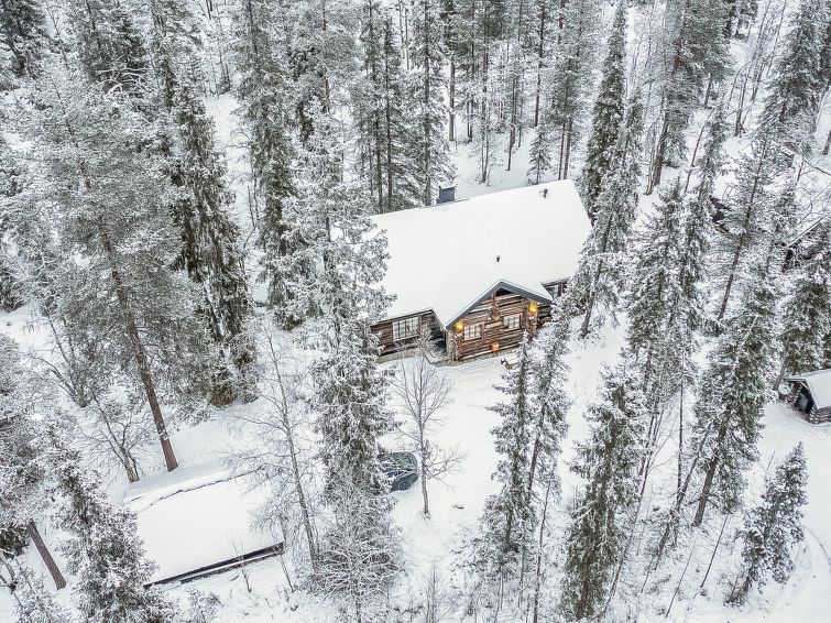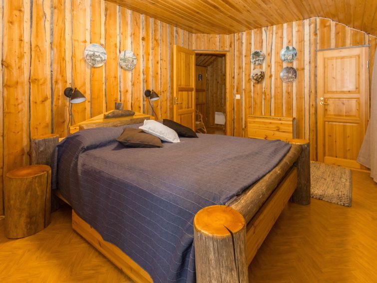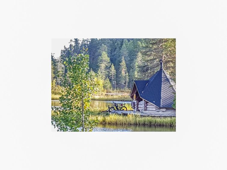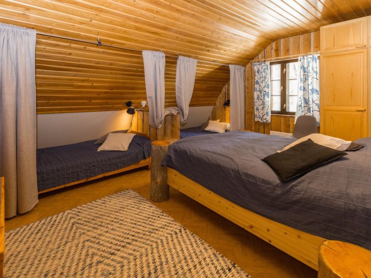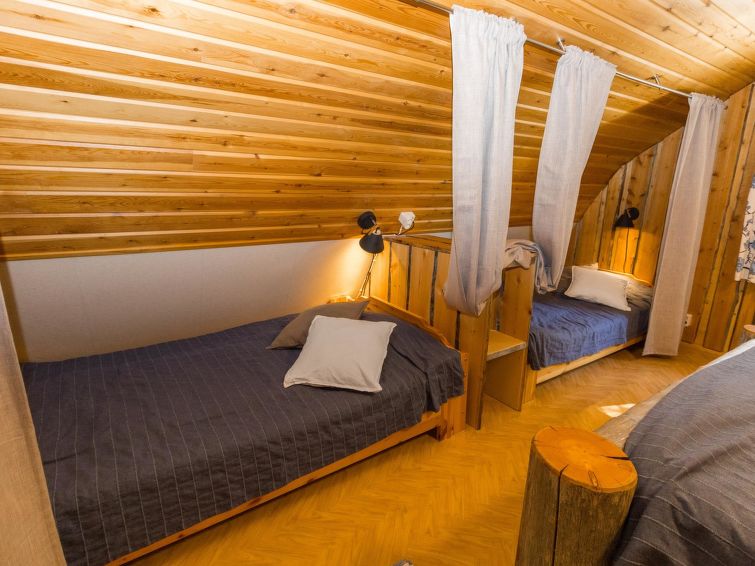 75 km east of Kemijärvi, in Sallatunturi Tourist Centre. One half (apartment) of silverlog semi-detached house unit 1991, living room/kitchen convertible sofa/bed, bedroom double bed; upstairs bedroom double bed, bedroom double bed and 2 beds (width of both beds 120 cm), sauna, washroom, WC also upstairs, balcony. As alternative extra beds 4 mattresses are provided.