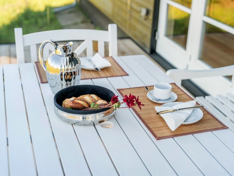 Enmannsbolig, bygget i 2014. 450 m fra sjøen. Privat: uberørt tomt 800 m2. Terrasse (60 m2). I huset: badstu, vaskemaskin, tørketrommel. Parkering ved hbrukt. Daglivarehandel 550 m. Golfbane 6 km. Eieren godtar ikke noen ungdomsgrupper.