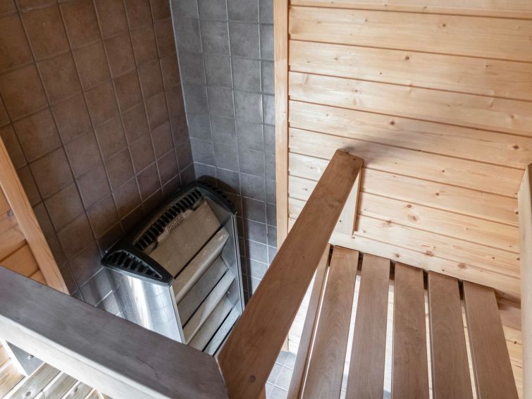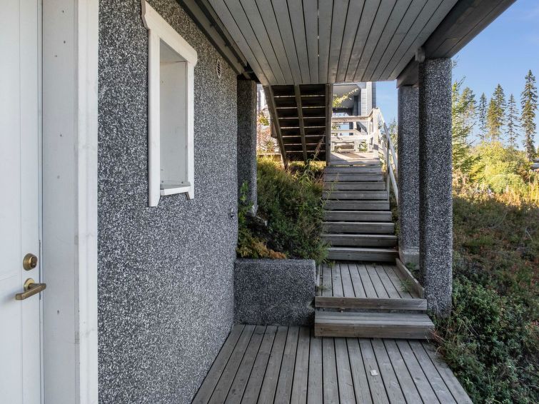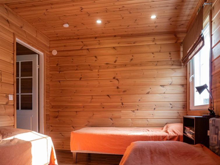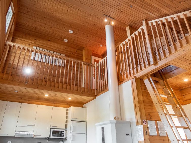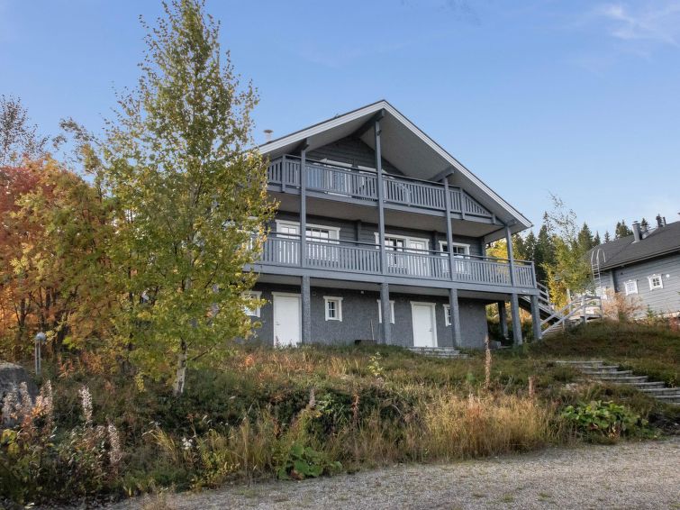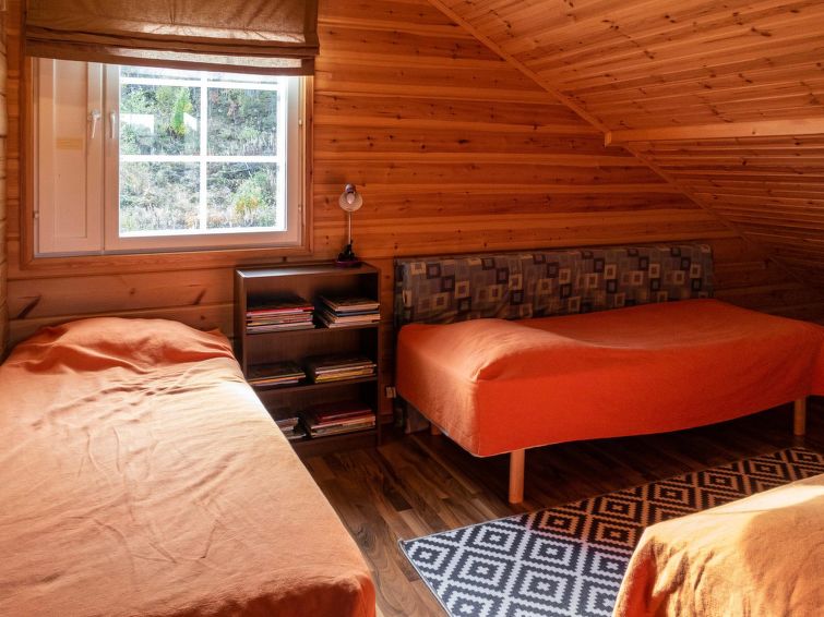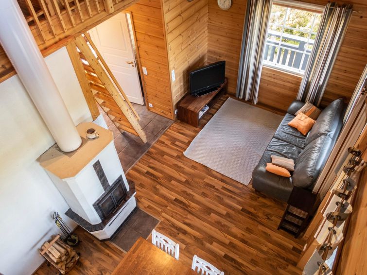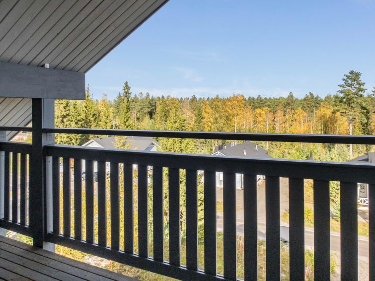This apartment in semi-detached house, located in Vuokatti ski centre, was completed in 2008. Floor area 67,5 m² (loft 27 m²). Three floors in this house, apartment in floors 2 and 3, steps to apartment. Both floors with terrace. In the first floor a warm storage. On the ground floor in apartment there is combined living room & kitchen, a bedroom with twin bed, sauna (electric heating), washroom and toilet. Upstairs in the loft there is one bedroom with three separated beds and a child´s bed. Kajaani 35 km, Sotkamo 7 km, Vuokatti ski slope 100 m, cross country track 100 m. Beach 2 km. Cleaning and linen NOT included.