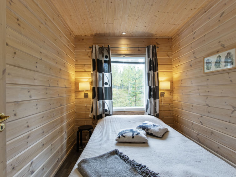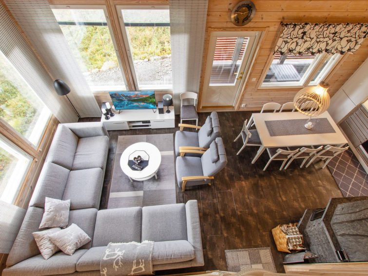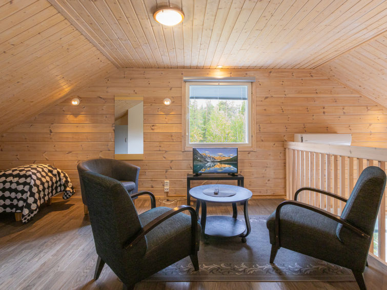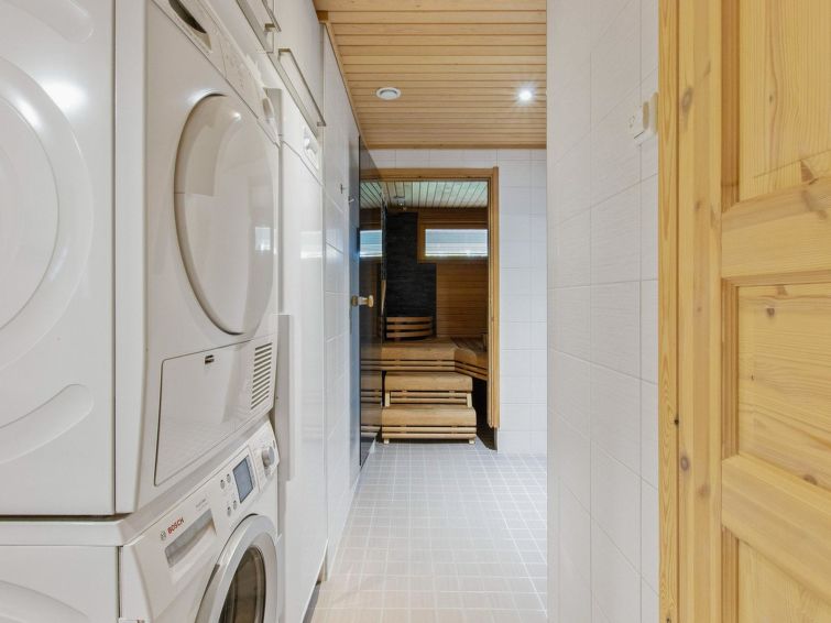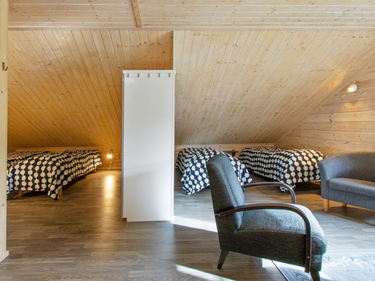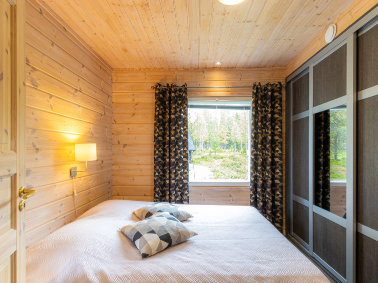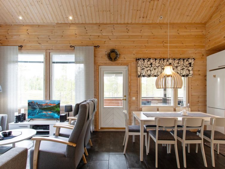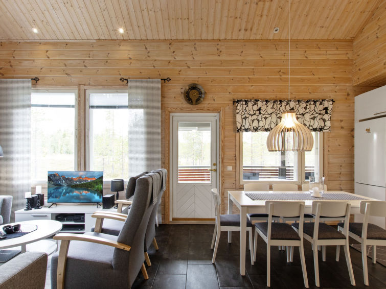 A semi-detached house apartment located 40 km north of Kolari in the Äkäslompolo village Maahinen area, build 2013. Area 88 m² + loft 23 m². Three bedrooms downstairs, two with two beds (90 x 200 cm and 80 x 200 cm) and one with double bed (width 140 cm), loft with 4 beds (80 x 200 cm), livingroom/kitchen, 3 toilets, wash room, sauna (electric), drying cupboard for clothes, washing machine, tumble-dryer, second TV on the loft. Walk-in shower also in the toilet in the loft. Baby bed, travel cot (incl. duvet and pillow), high chair, potty, plastic snow sledges and a kick sled. Wi-Fi. Mechanical ventilation. Shared ski maintenance room. Solar panels installed in the spring of 2023. Homey, spacious apartmen in the Äkäslompolo village Maahinen area. No pets allowed. Prices included final cleaning, bed linen are available for rent.