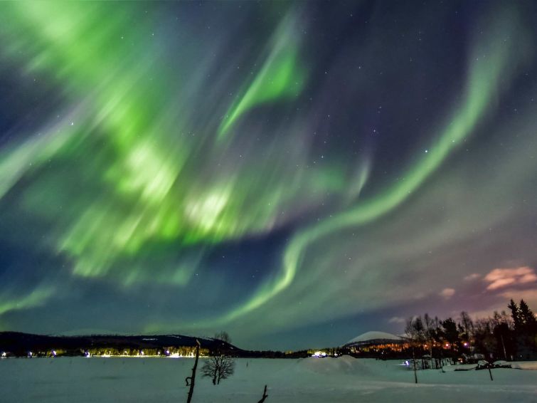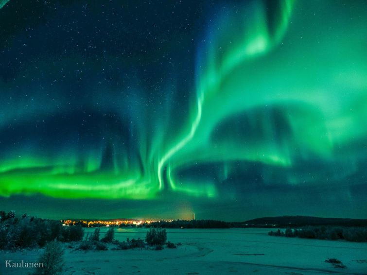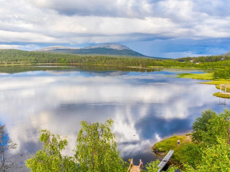 200 km north of Rovaniemi, L. Äkäslompolojärvi 220 m (length 1 km, width 2 km), shallow and deep shore, hard clay bottom, public beach, boats shared. Wooden flat 1970, renovated 2002, at other end ski care room for cottage village, living room/kitchen, bedroom 2 beds, bedroom double bed +1 bed, washroom, sauna (elec. stove ), porch. Fireplace is special, one made of metal. Free Wi-fi and Northern Lights alarm. By arrangement also lakeshore sauna, distance 220 m. Roofed grill shared, distance 20 m.