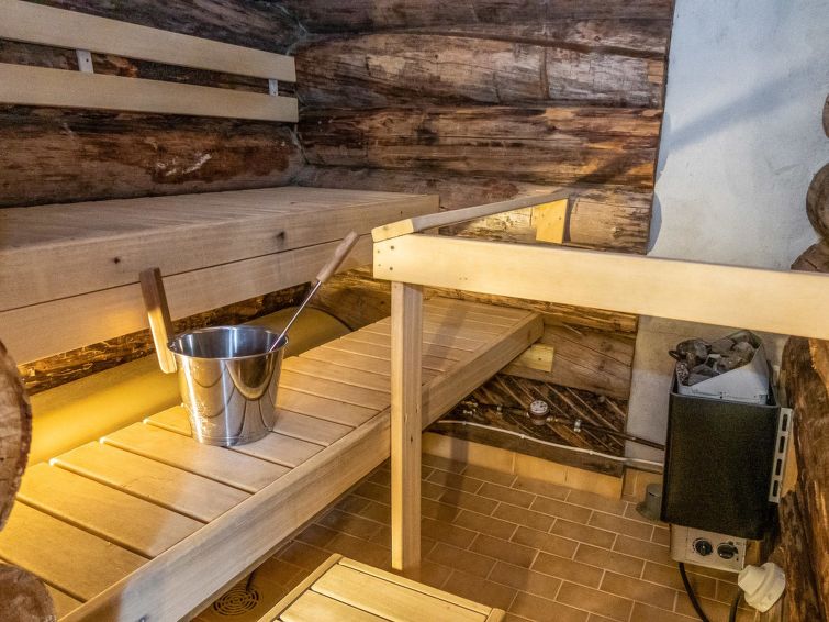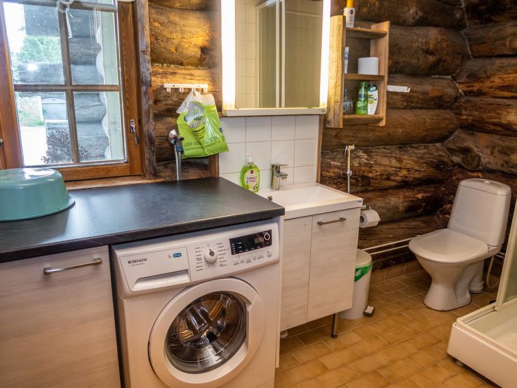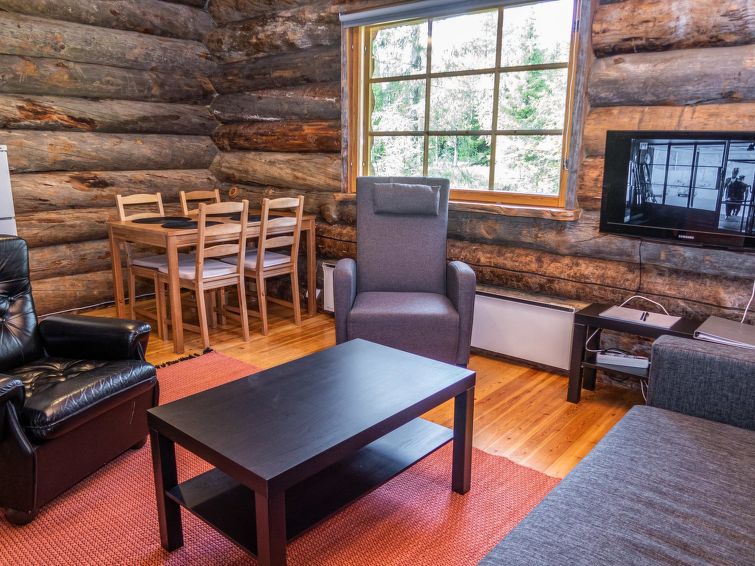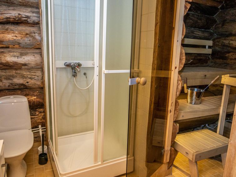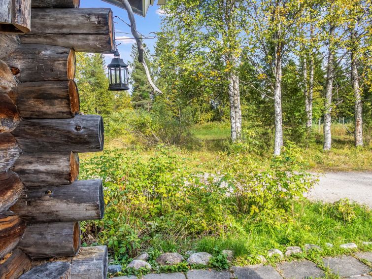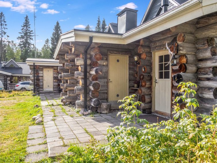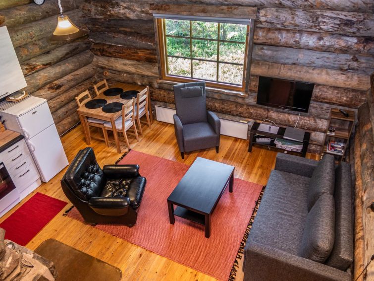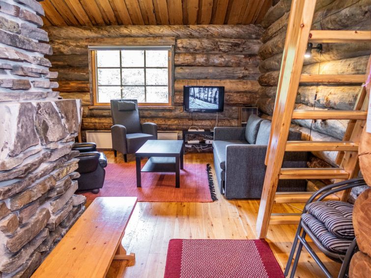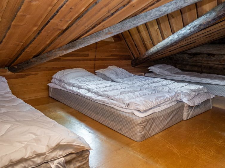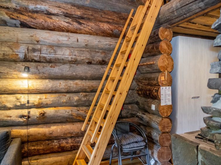 23 km north of Kuusamo, Ruka Village (Western Ruka) 3,7 km, Lake Rukajärvi 60 m (length 4 km, width 1.5 km), shallow shore, hard sand bottom, shore shared. End apartment in a silverlog row house (terraced house), living room/kitchen: sofa bed for 2. Sleeping loft (13 m², sloping ceilings, low room height, steep stairs) 4 mattresses, sauna, washroom (shower cubicle). Neat silverlog apartment on lake shore close to Ruka Ski Resort services. Ruka Centre 3.7 km, Kuusamon Tropiikki spa 19 km. Camp fire place in shared use. Skibus-route in 150 m distance.