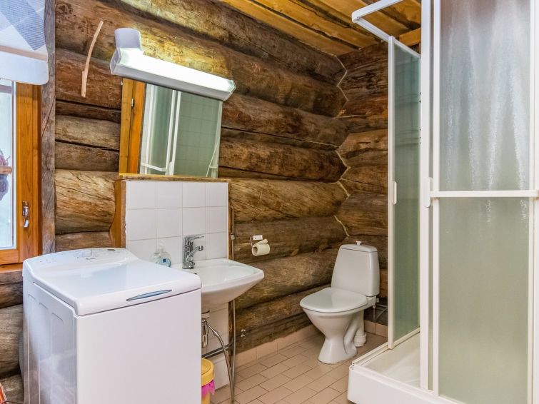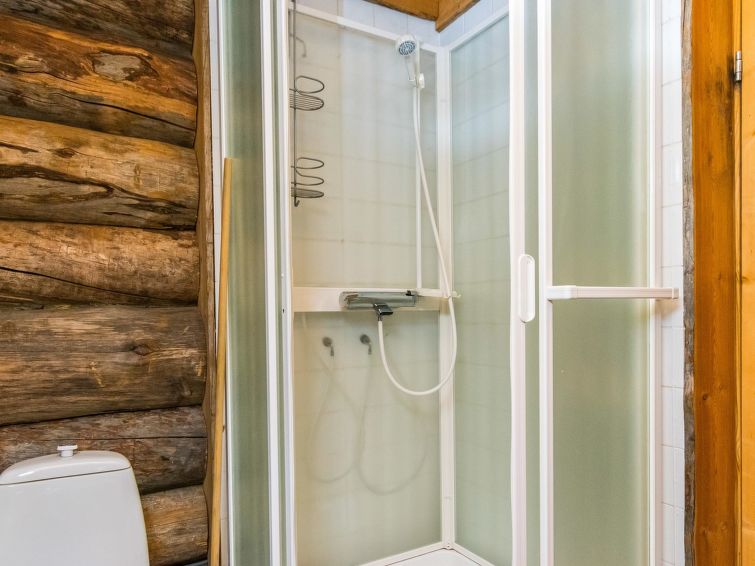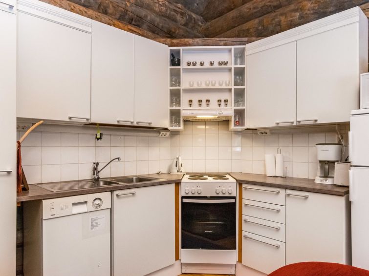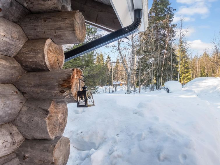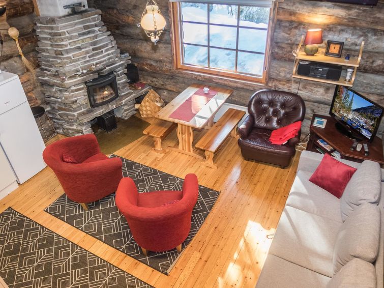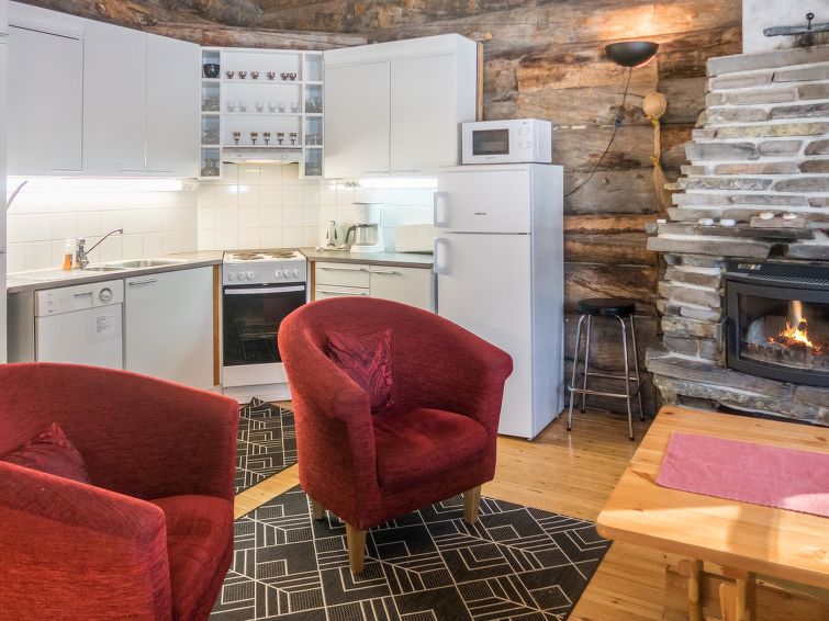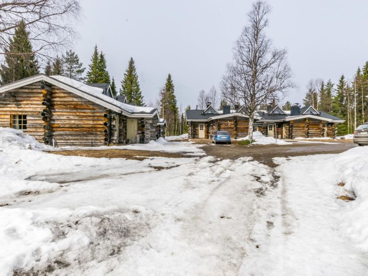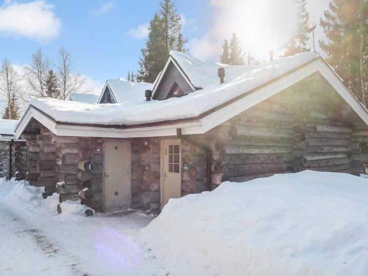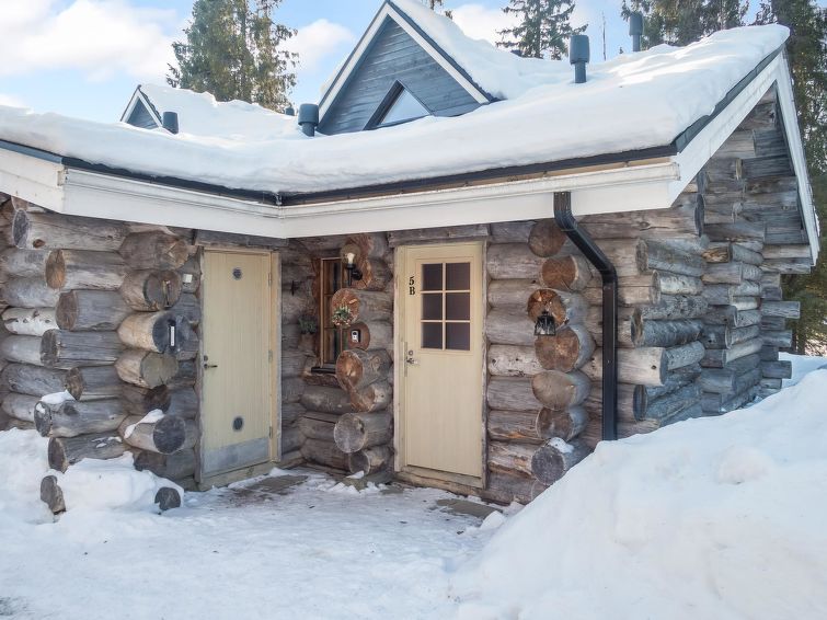 End apartment in silver log row house in the south side of Ruka fell, living room (convertible sofa for two), open plan kitchen, shower room, sauna, low, sloping roof loft: mattresses for four. Steep stairs to the loft. Silverlog apartment on lake shore close to Ruka Ski Resort services. Ruka Centre 3.7 km, Kuusamon Tropiikki Spa 19 km. Camp fire place in shared use. Skibus-route in 150 m distance.