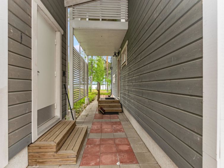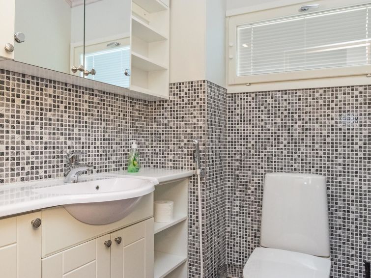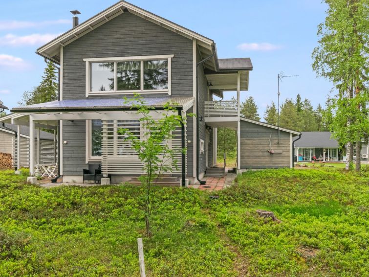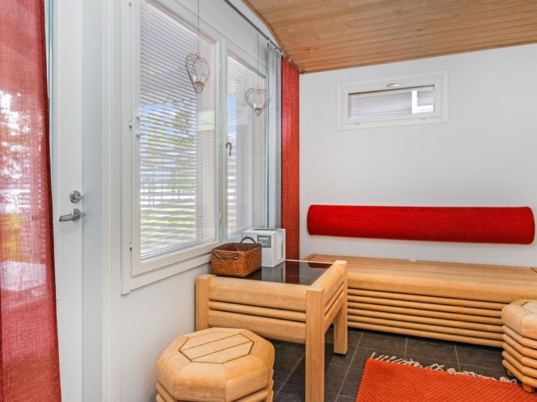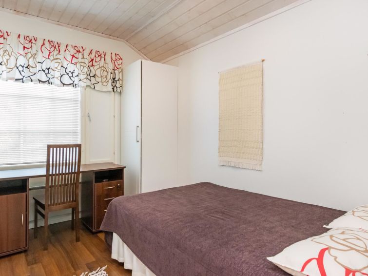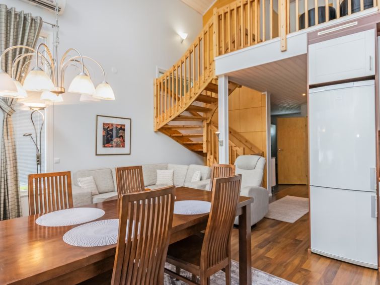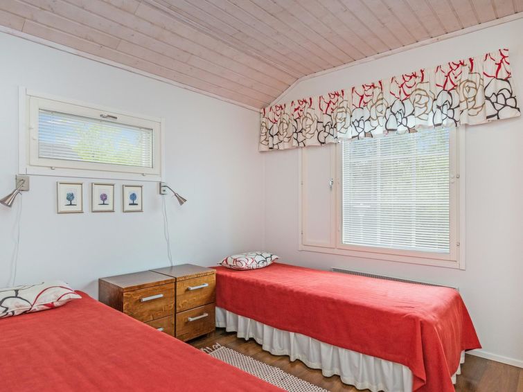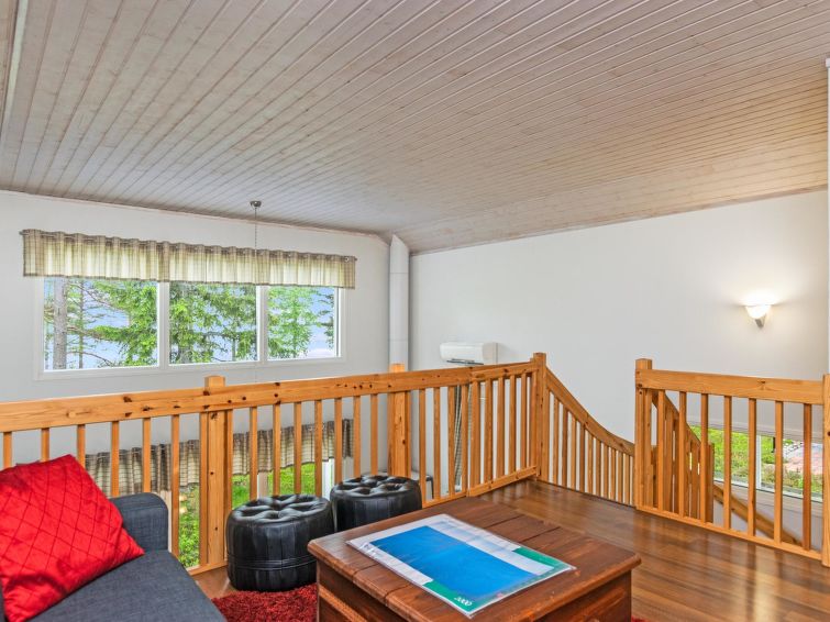 A two storey wooden house, built in 2010. Lowest floor: kitchen, bedroom with double bed (140cm wide), sauna (electric stove), bathroom with 2 showers, dressing room, toilet, terrace. Upstairs: bedroom with 2 beds, bedroom with a bed (120 cm wide), loft with a sofa bed, toilet, balcony.