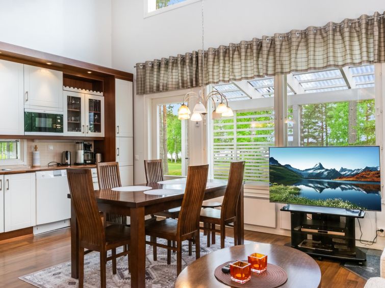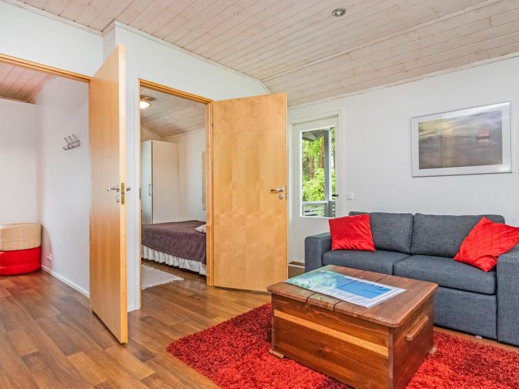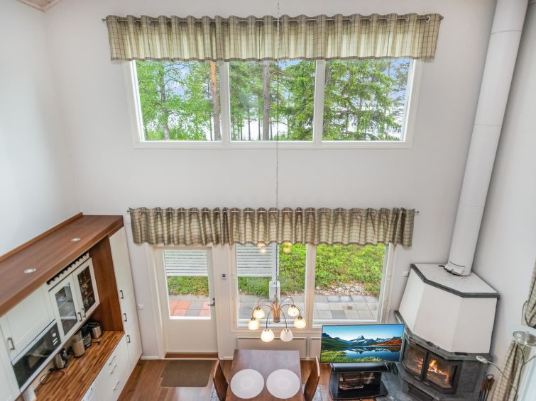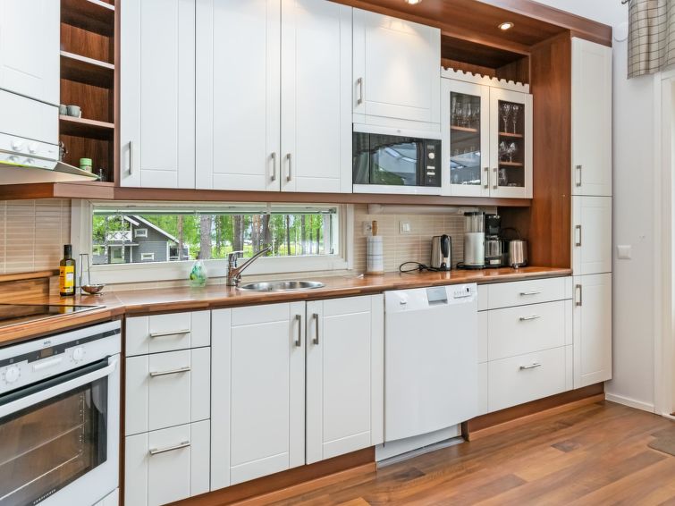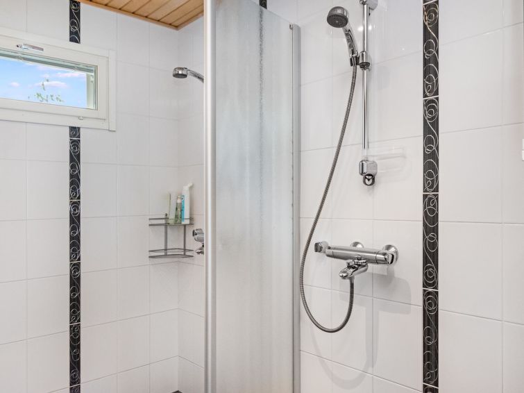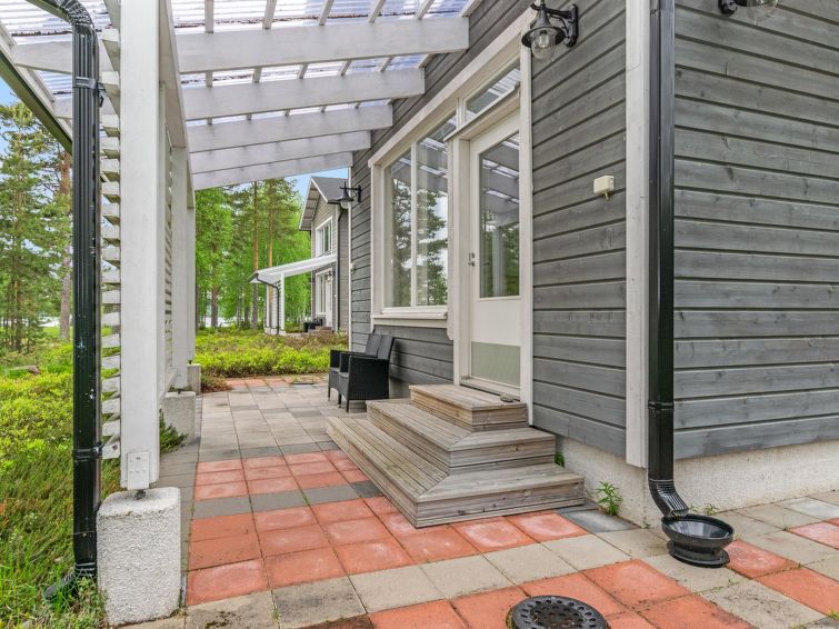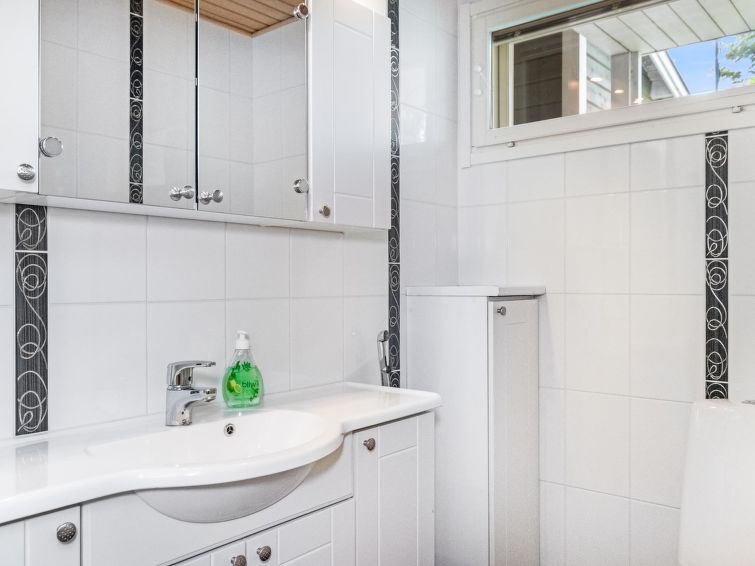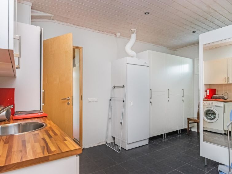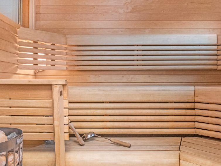 A two storey wooden house, built in 2010. Lowest floor: kitchen, bedroom with double bed (140cm wide), sauna (electric stove), bathroom with 2 showers, dressing room, toilet, terrace. Upstairs: bedroom with 2 beds, bedroom with a bed (120 cm wide), loft with a sofa bed, toilet, balcony.