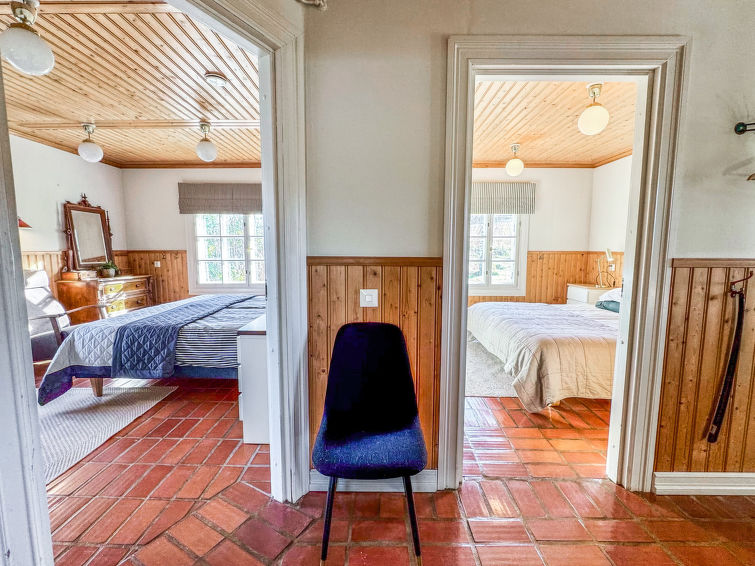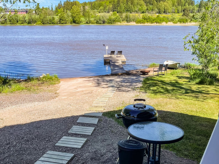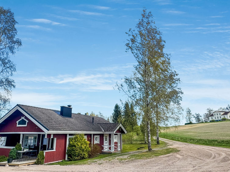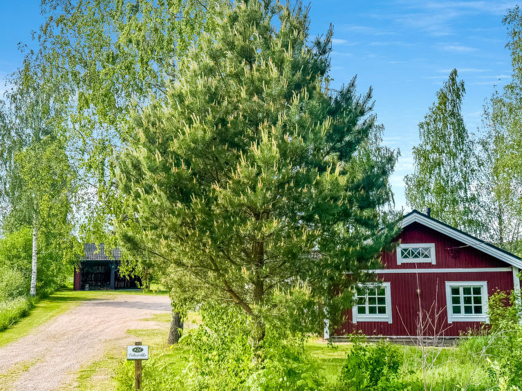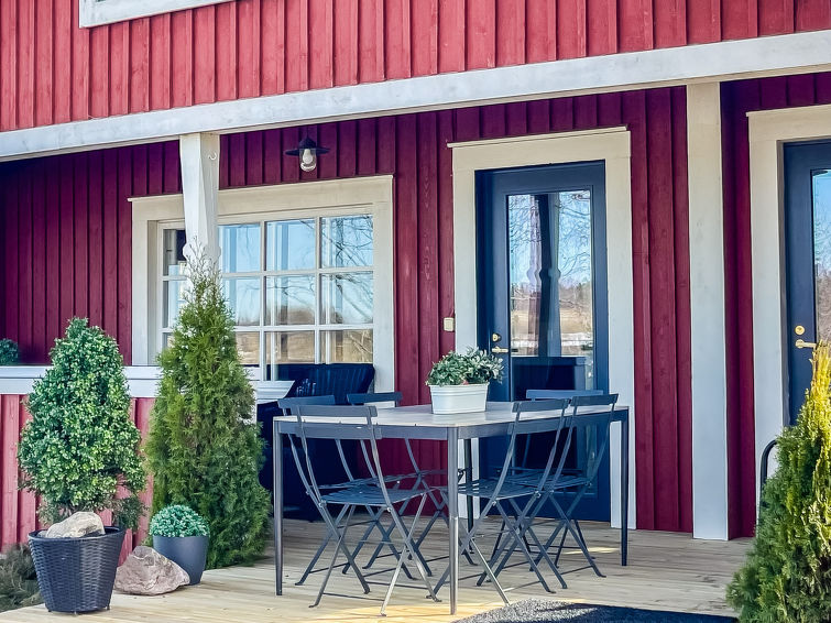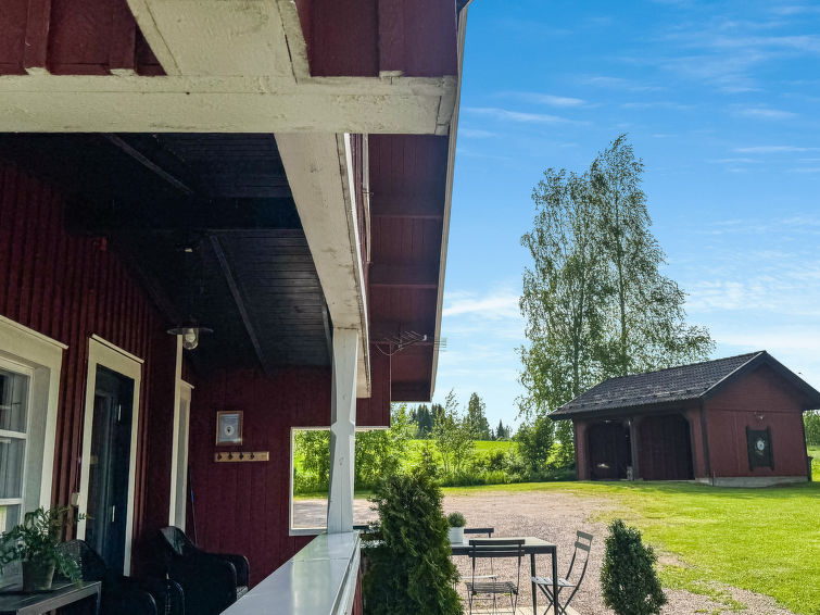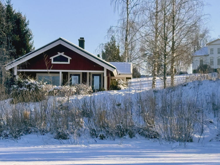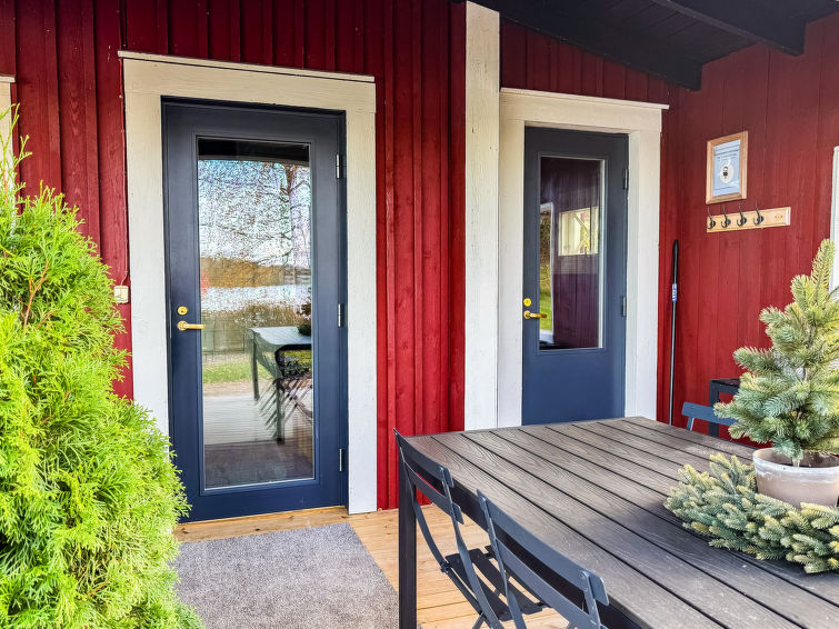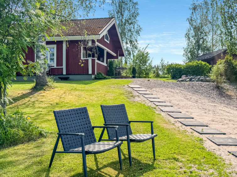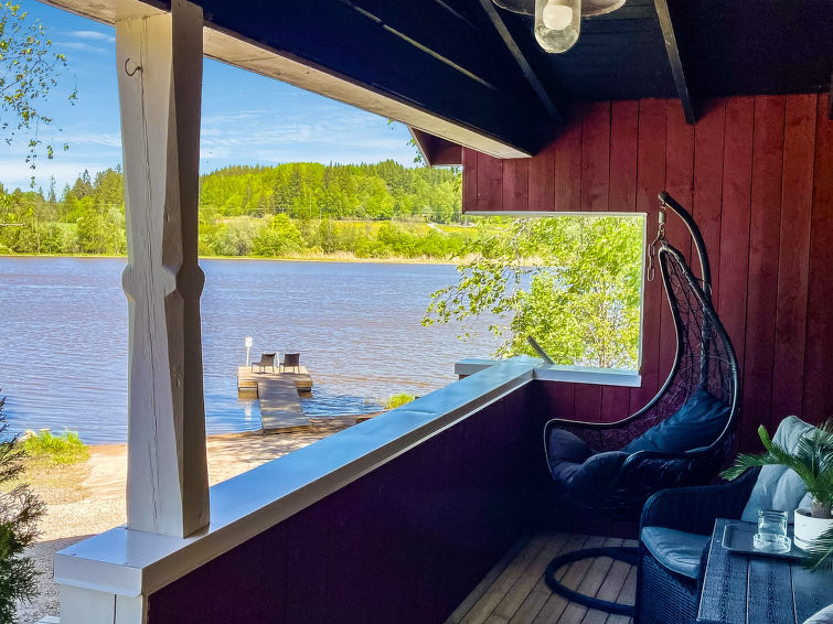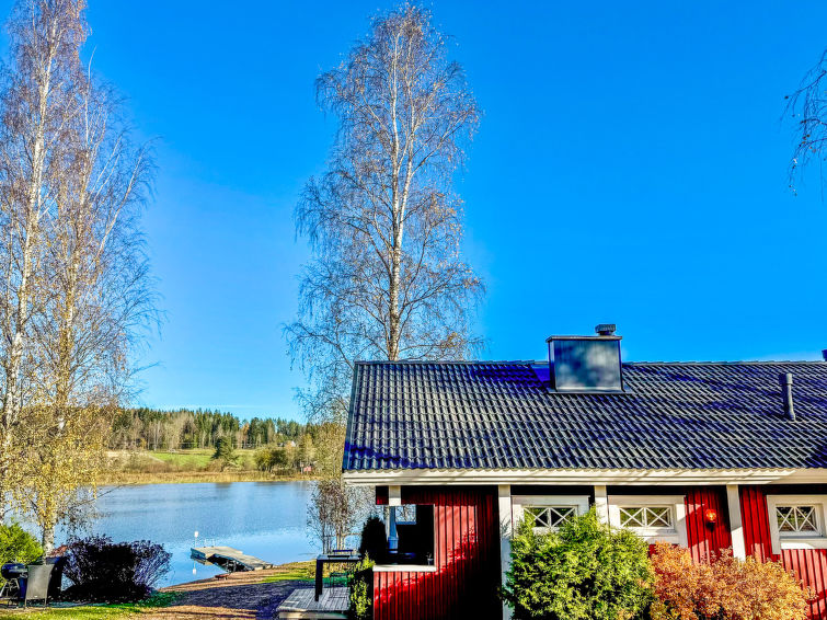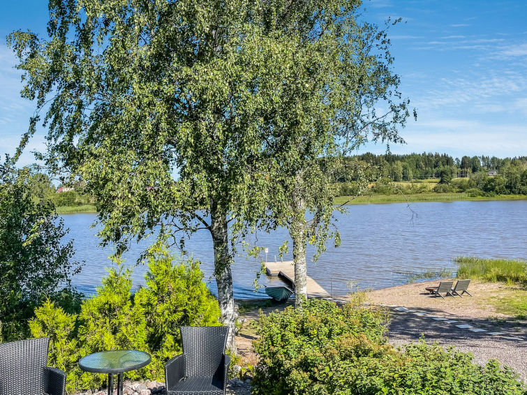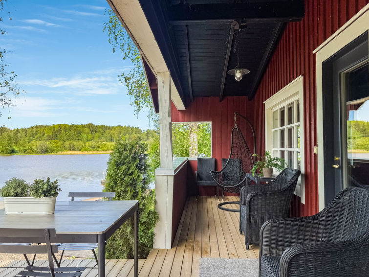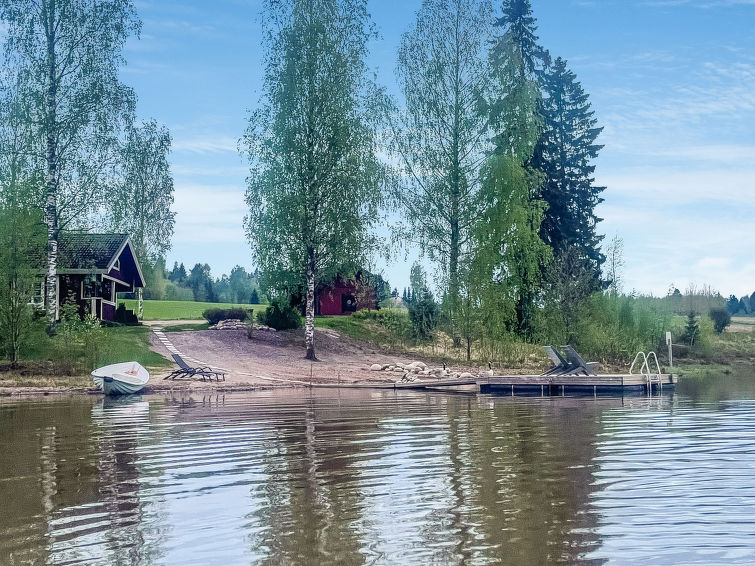 Red and white villa right on the lake shore, the villa is situated on the end of the road! There is a spacious courtyard with arable landscape. Spacious for 4 people, extra beds for up to 6 people. Covered terrace with lake landscape.
