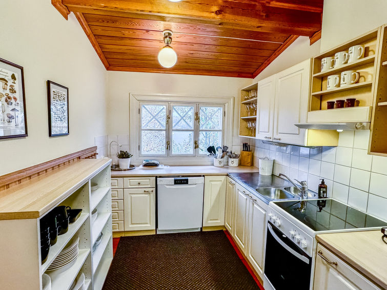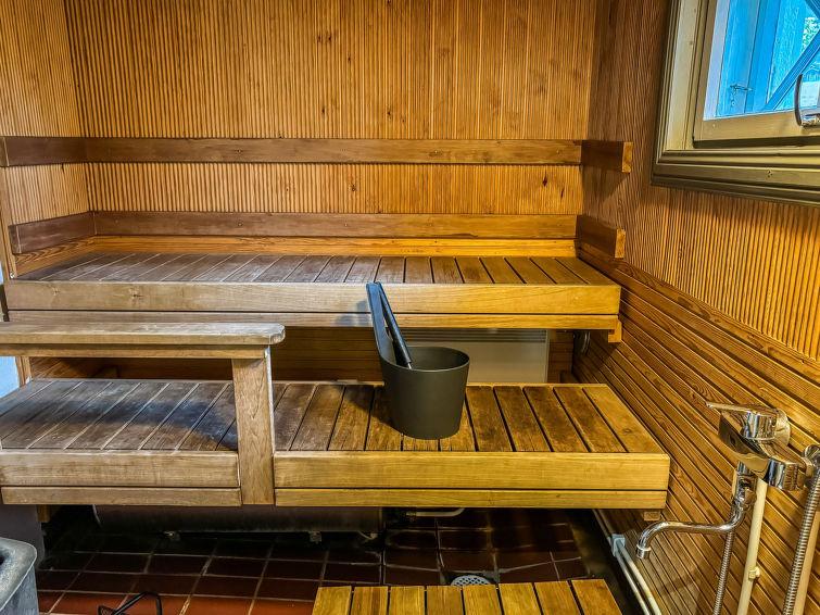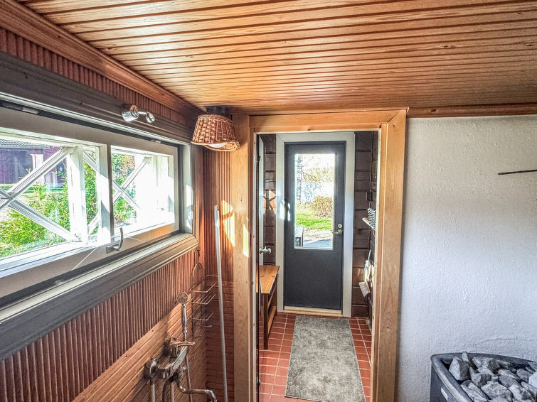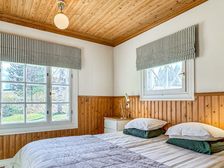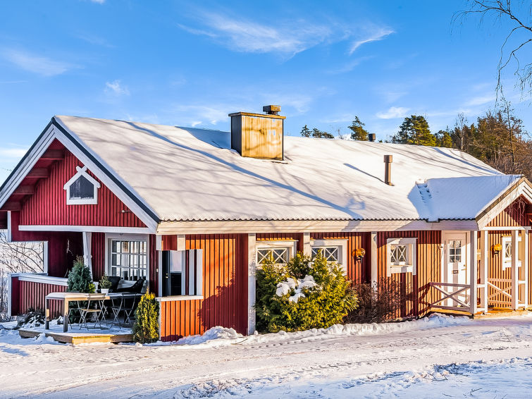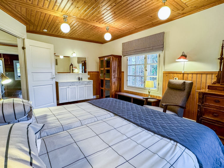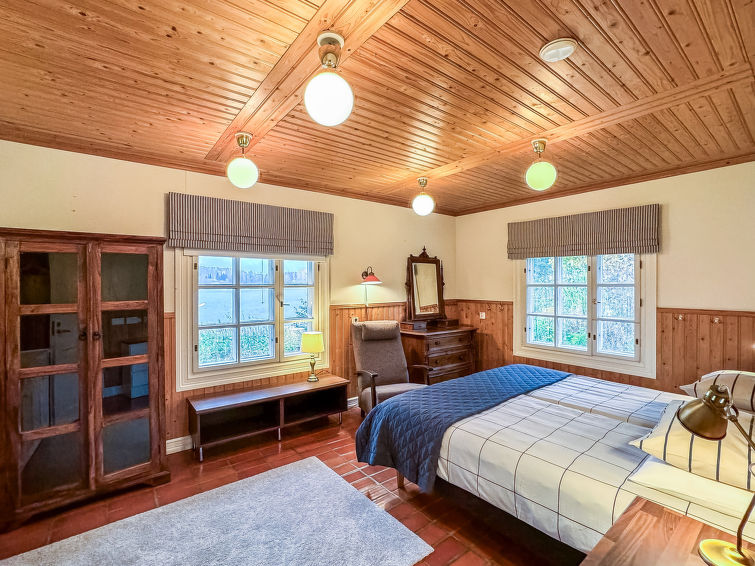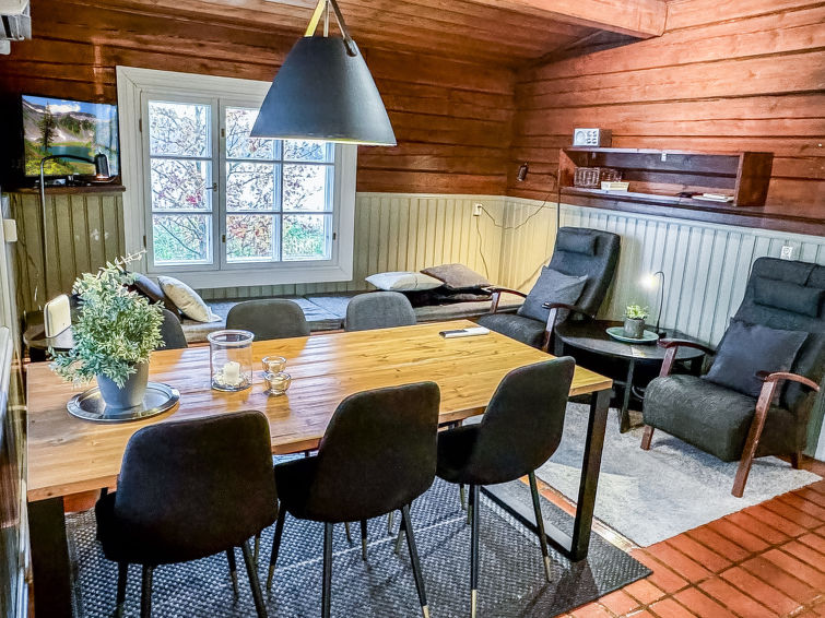 Log/wooden villa 1990, kitchen, living room with 2 extra beds, 2 bedrooms with 2 beds in each, sauna (with shower), shower room/WC, open veranda.