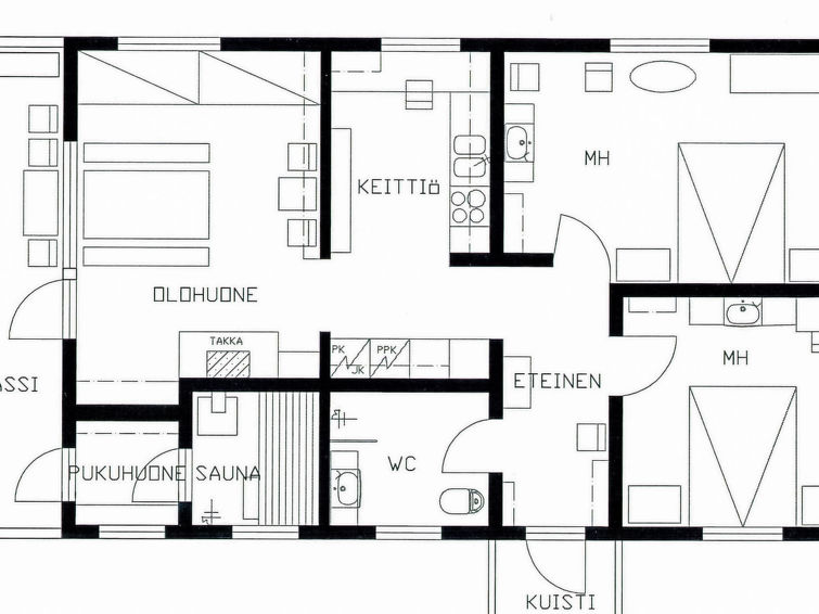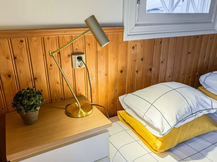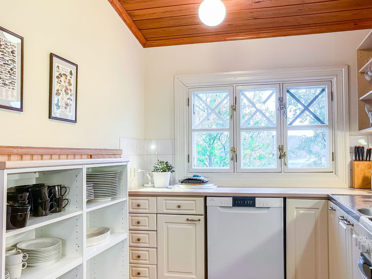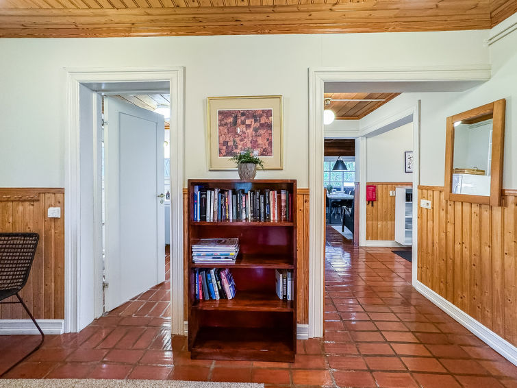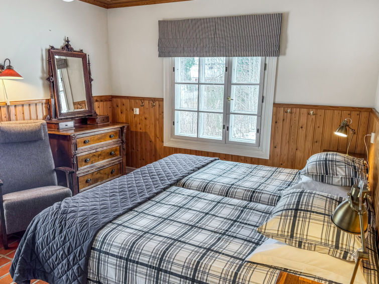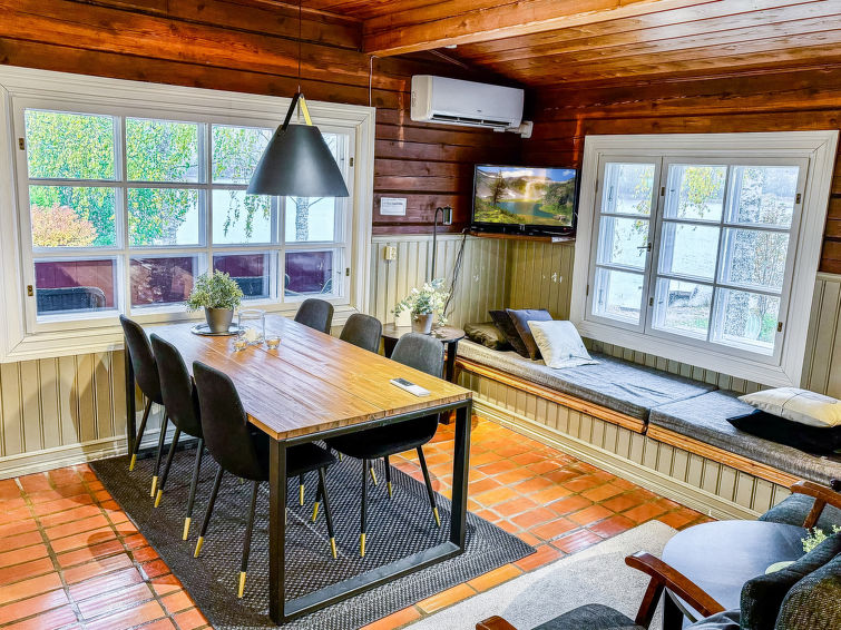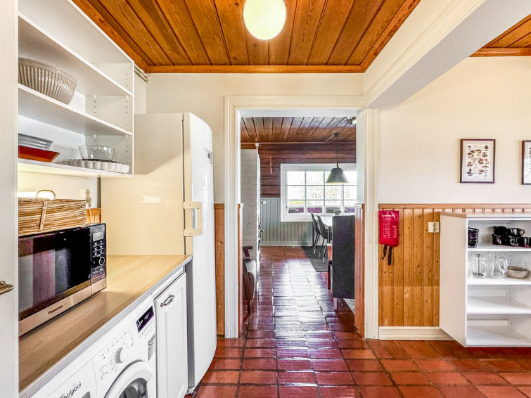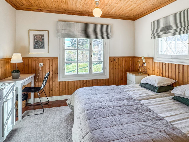 Log/wooden villa 1990, kitchen, living room with 2 extra beds, 2 bedrooms with 2 beds in each, sauna (with shower), shower room/WC, open veranda.