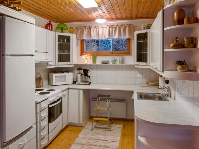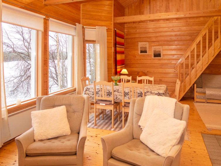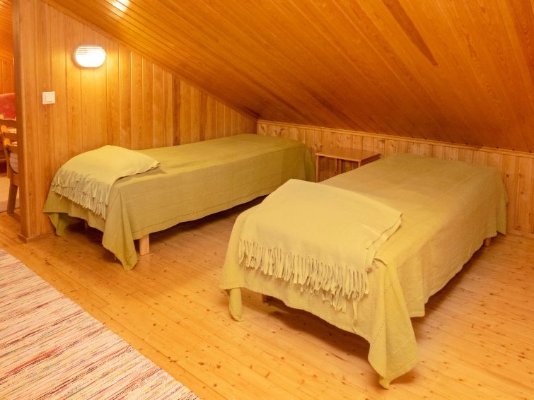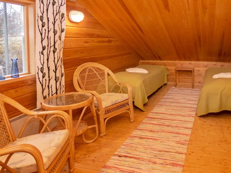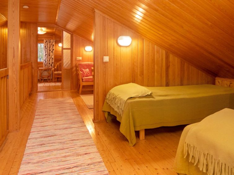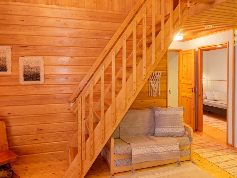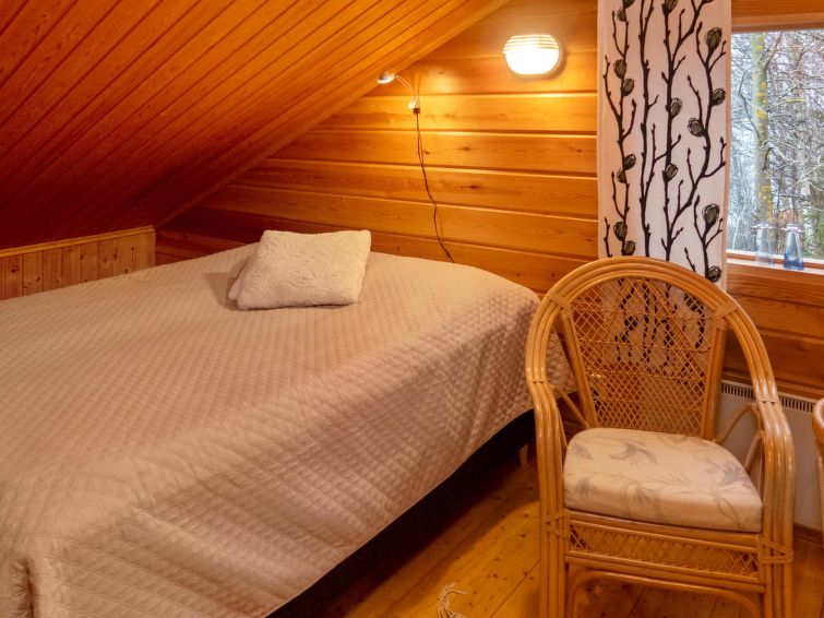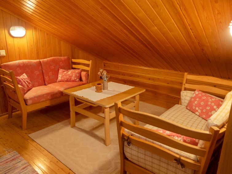 Log cottage built in 1991, bedroom 1 (downstairs): a bed, bedroom 2 (downstairs): doublebed, bedroom 3 (upstairs): double bed + 2 beds, alcove (upstairs): 2 beds, sofabed for 2. Combined kitchen/living room, electric sauna.