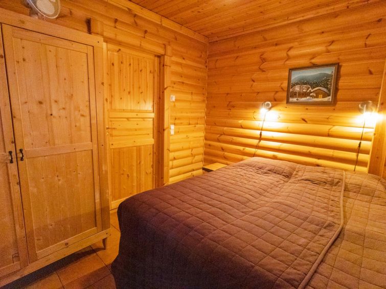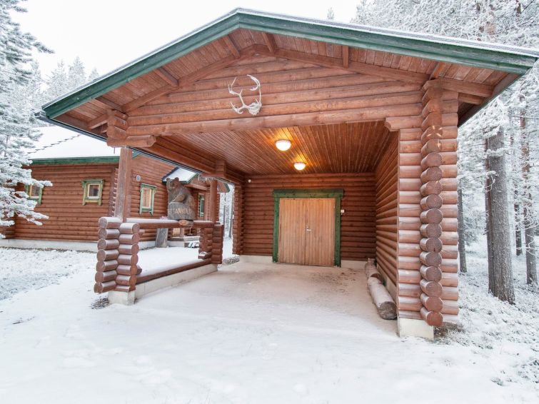 53 km north from Kemijärvi, round log cabin built in 2008. Living room/kitchen, bedroom with double bed, washroom, sauna (electric stove), toilet. Upstairs: open balcony with convertible sofa/bed for two persons and bedroom with two separate beds. There are open porches on each floor, car shelter.