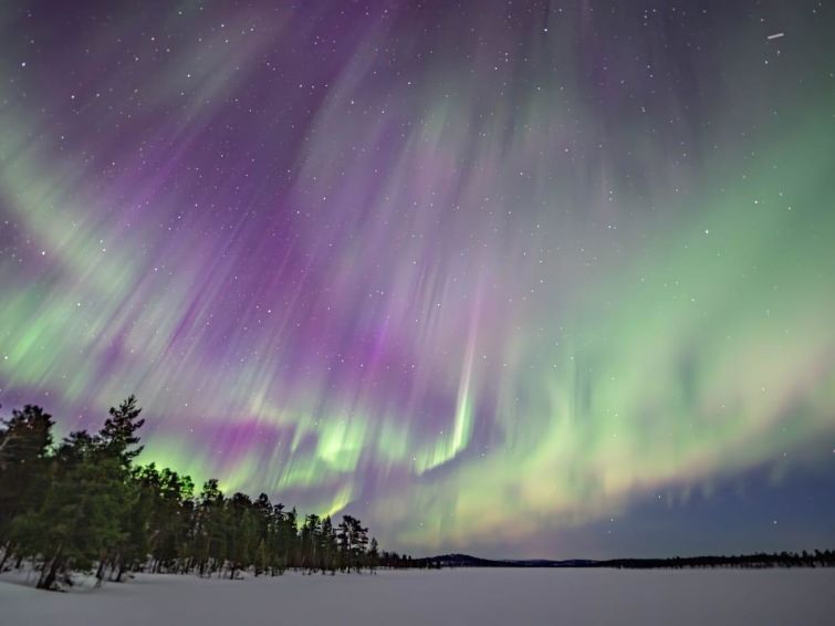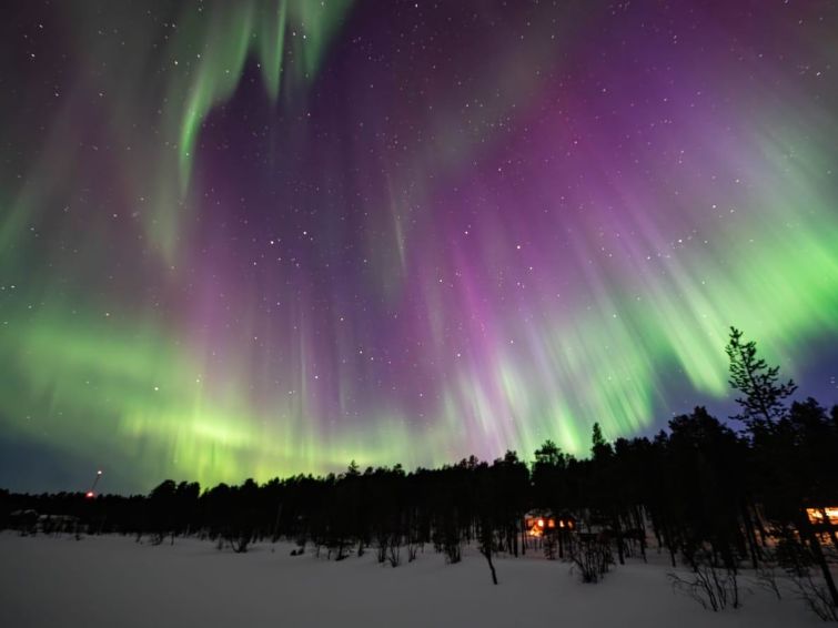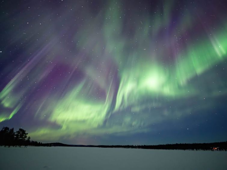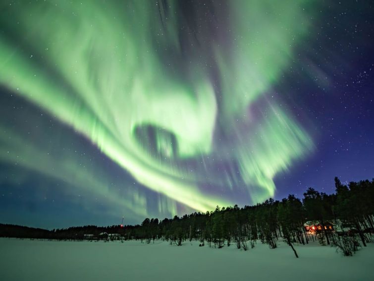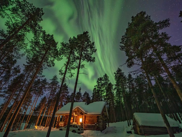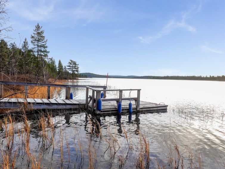 310 North of Rovaniemi, 37 km southwest of Inari, Lake Kuivajärvi 90 m (length of the lake 5,7 km and width 1,4 km, distance to the opposite shore about 400 m), shallow, sand/rocky bottom, a pier, own boat (+ long wooden boat), a quiet village road between the cabin and shore.