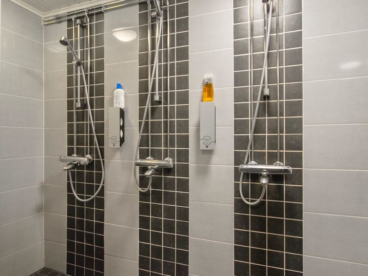 The bathroom includes 3 showers. A spacious sauna features an electric sauna stove.