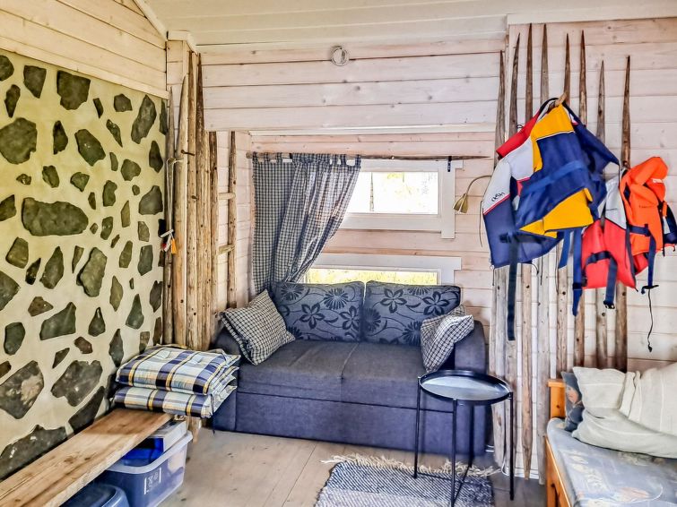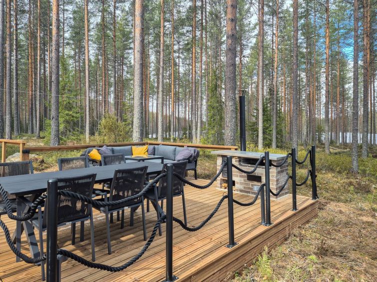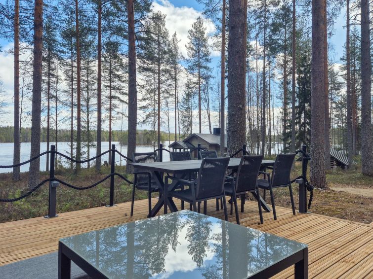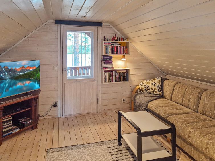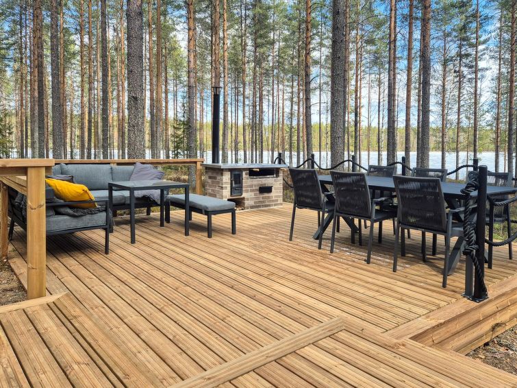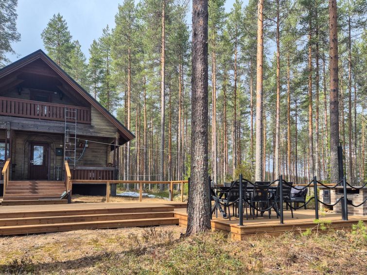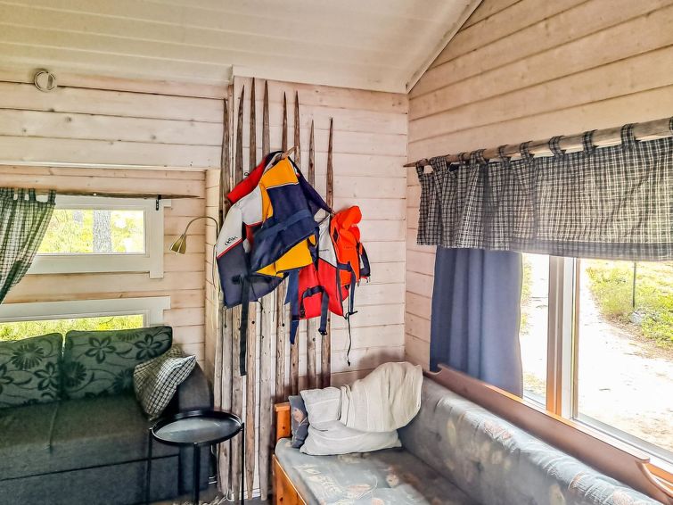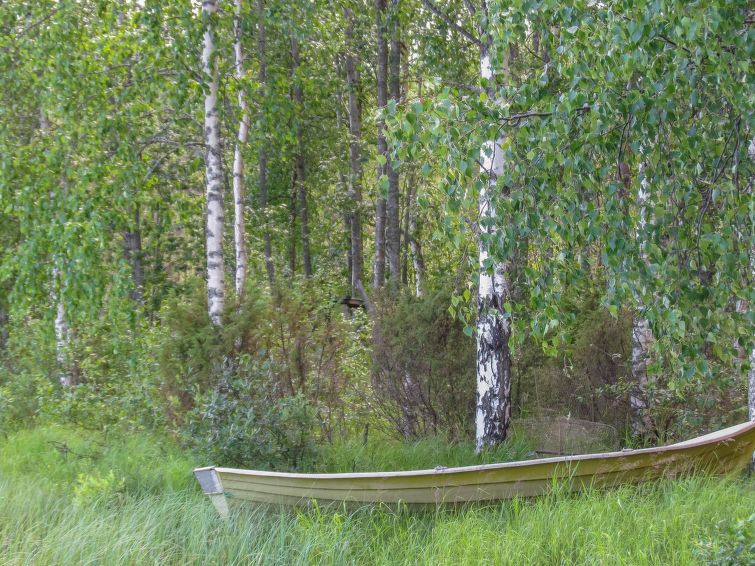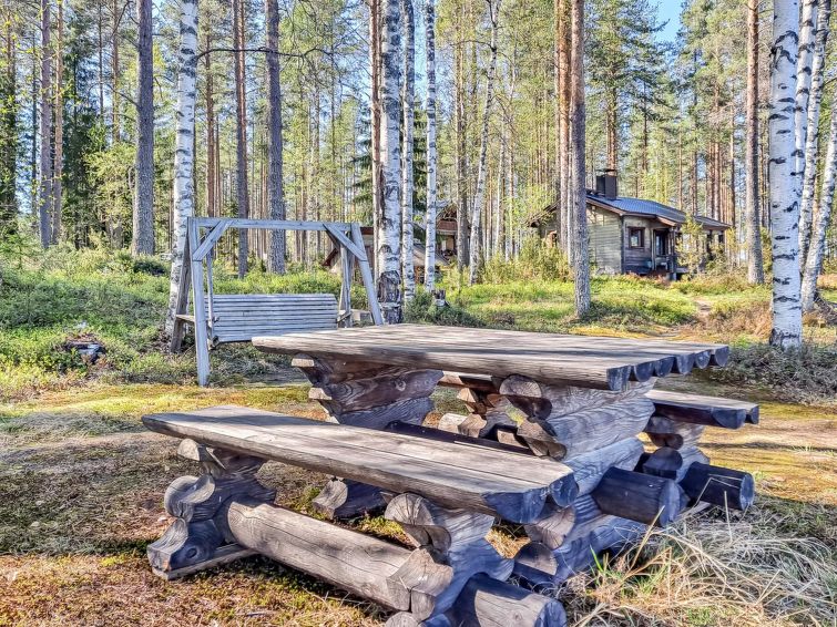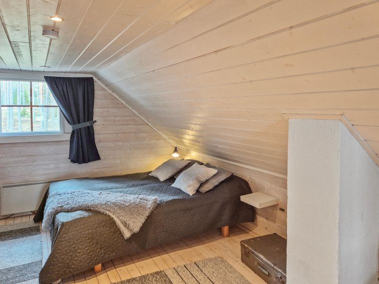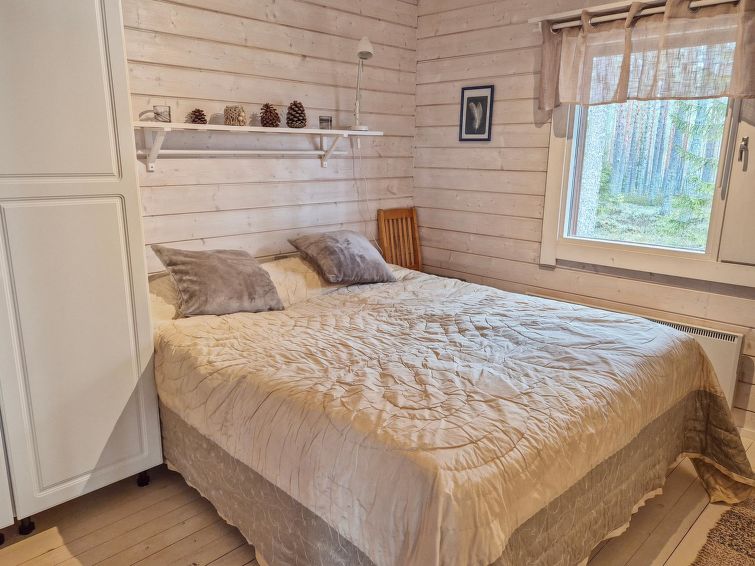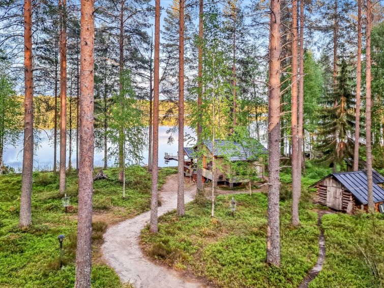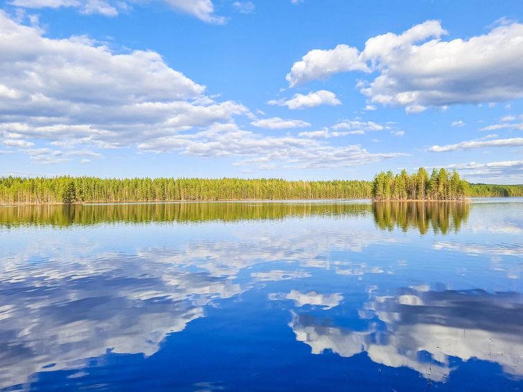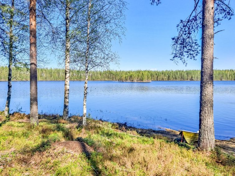 40 km south of Nurmes, L.Ylemmäisenjärvi 40 m (length 4 km, width 0.5 km), shallow, soft, sand/mud bottom, own boat. Log cottage 2007, living room/kitchen, bedroom double bed, bedroom 2 extra beds (convertible sofa/ bed), bedroom double bed and 1 bed, open porch. Shower and WC are in the main cottage.