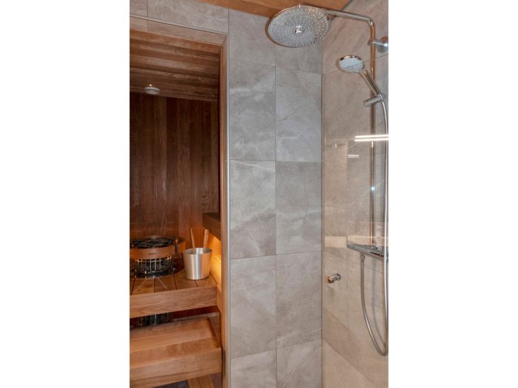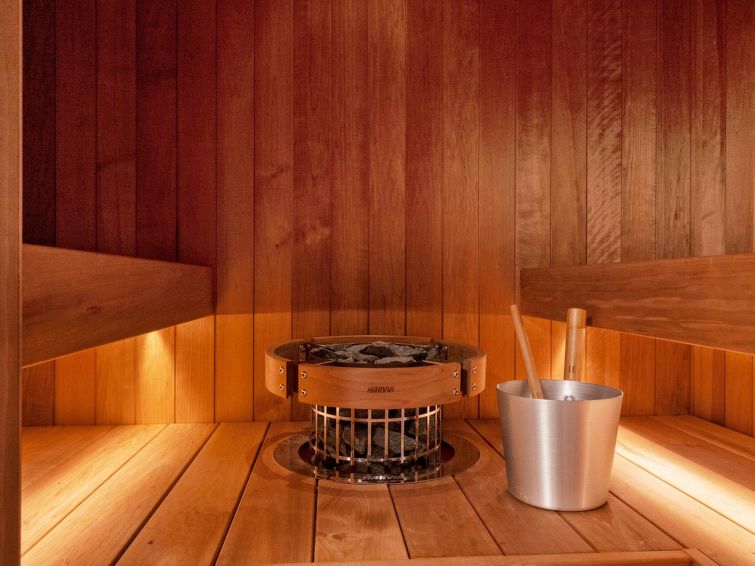 Sofa bed in the living room/kitchen, double bed in alcove, sauna and washroom/WC.