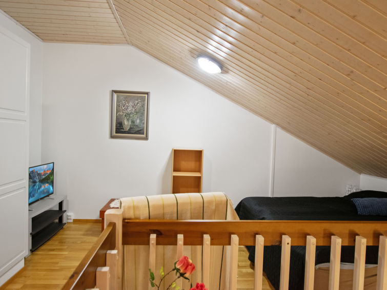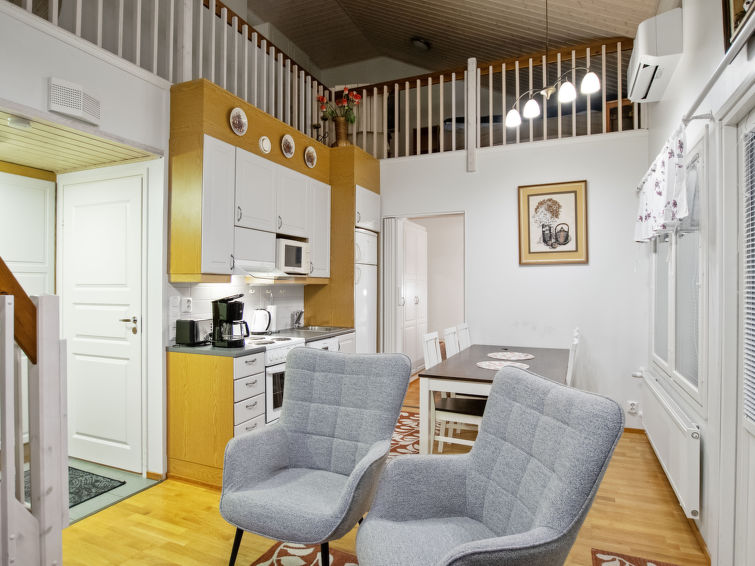 Apartment is built-up 2006 and it's area is 55 m² of which 15 m² on the loft. In ground floor there is a bedroom (folding door) with double bed, open kitchen/living room, balcony and electric heating sauna.
