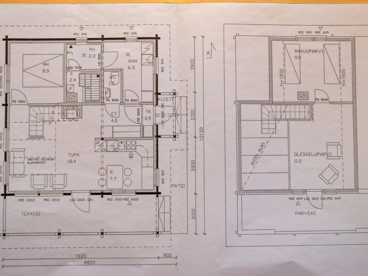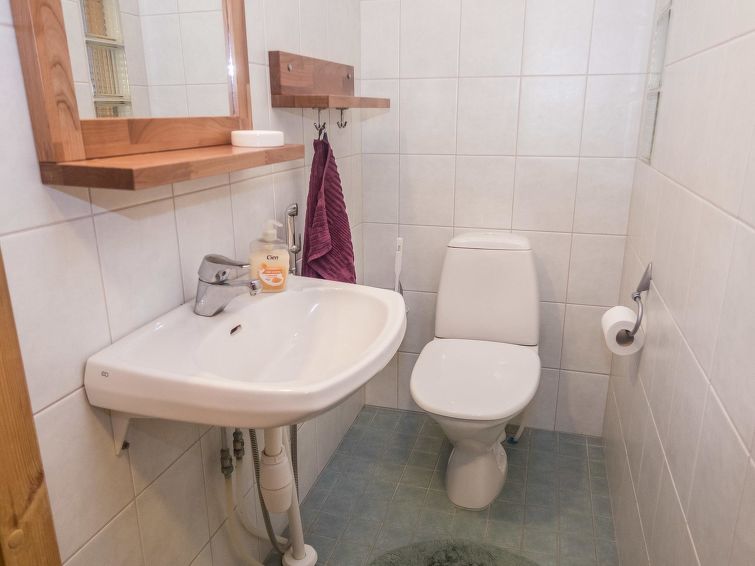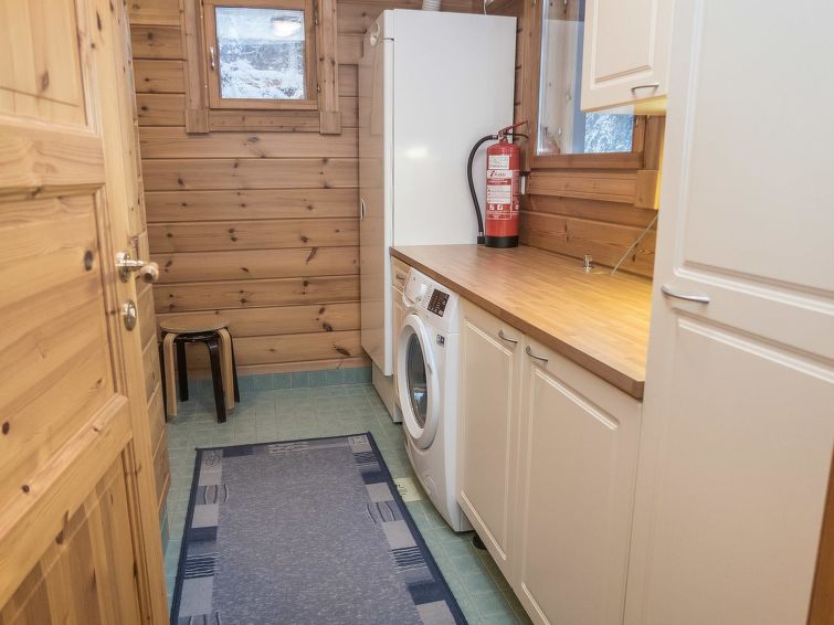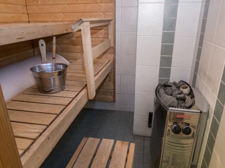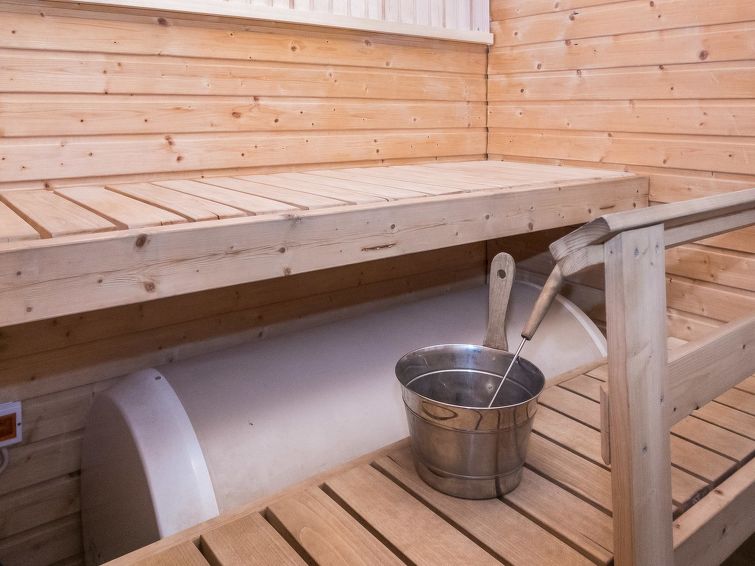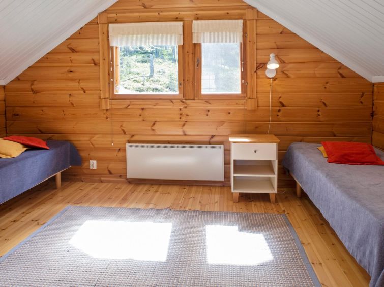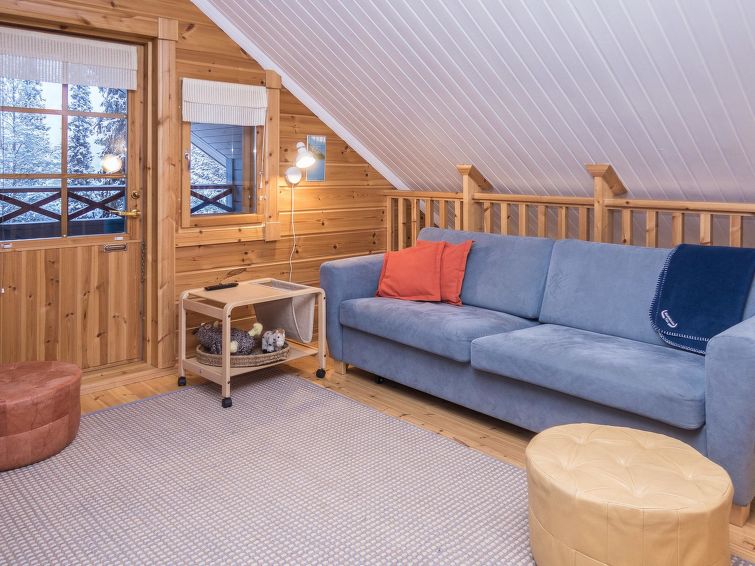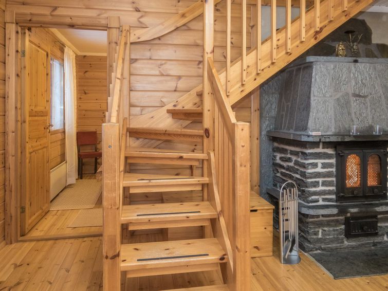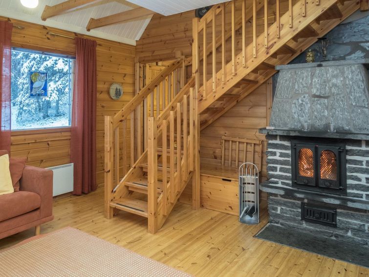 Log chalet 2004, living room/kitchen, bedroom double bed, utilities room/ dressing room, washroom, sauna (elec. stove), open porch, upstairs bedroom 2 beds (á 80 cm wide), recreation loft convertible sofa/ bed for two and balcony.