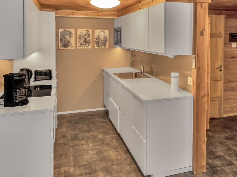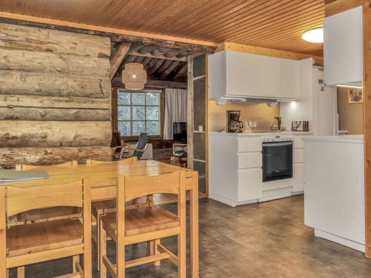 Apartment in kelo-log built semi-detached house. Living room with sofa bed, kitchen, two bedrooms, each with 2 single beds, second bedroom with work desk, loft with 2 single beds (maximum height of the loft 1.5 m, steep stairs), sauna, washroom and separate WC.