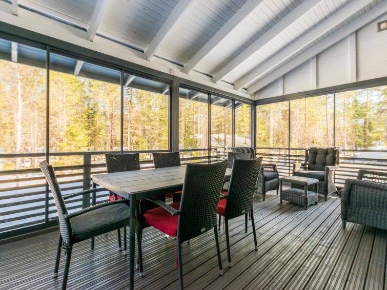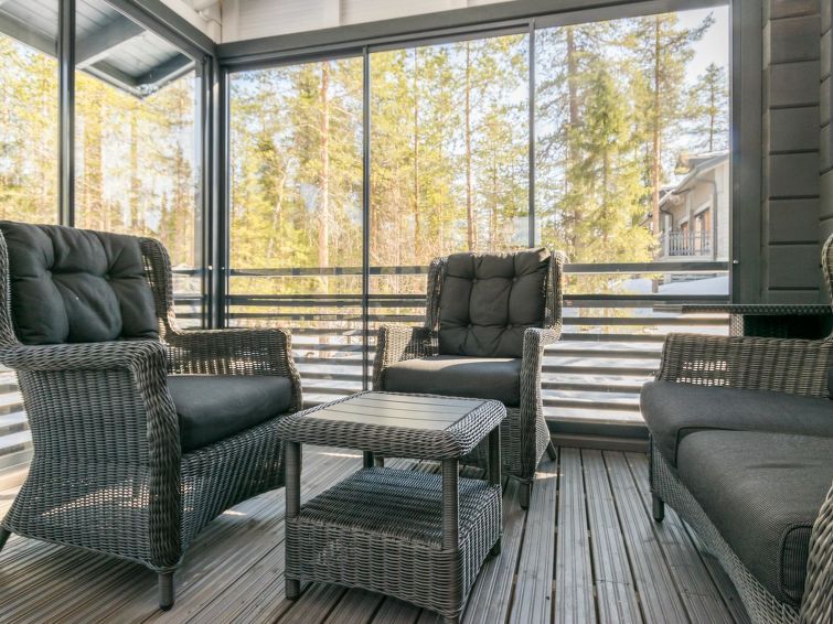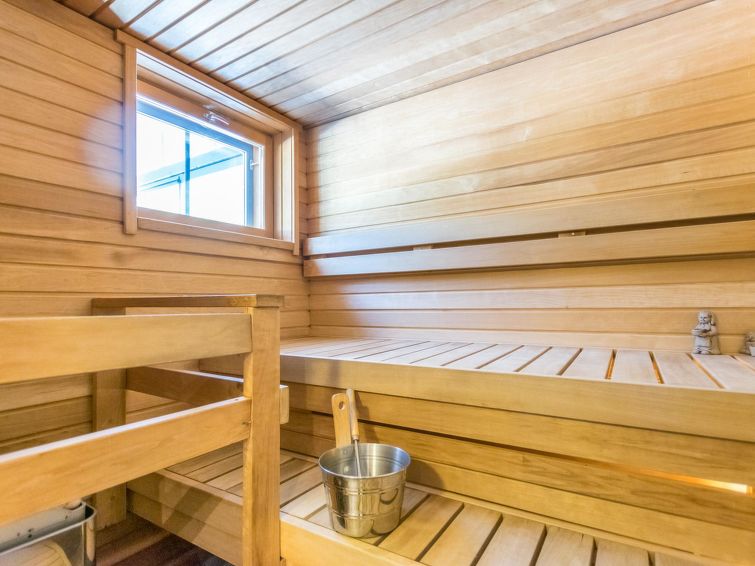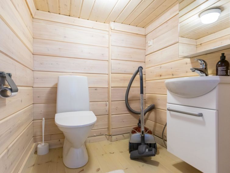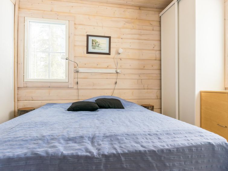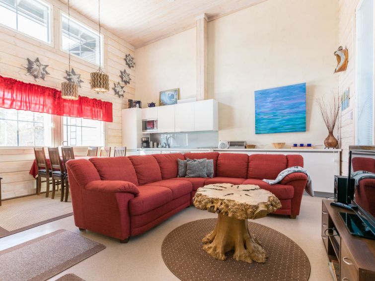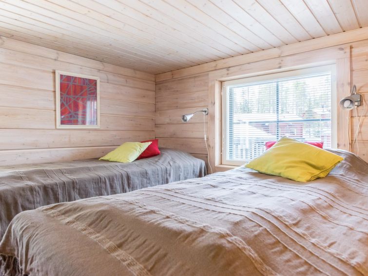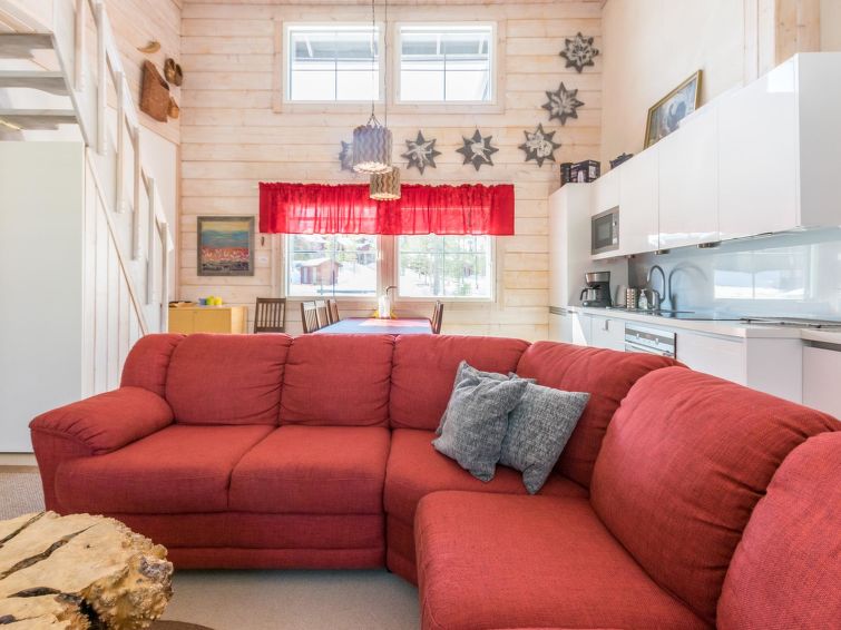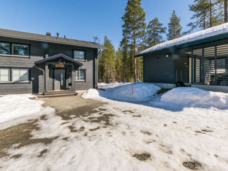 25 km north from Kuusamo, Western Ruka. Well-equipped semidetached log house, built in 2009, bedroom 1 (downstairs): double bed, loft: 4 beds, combined kitchen/livingroom, electric sauna. Downstairs 51 m² + loft 32 m² (height of the loft 160 cm, WC). New cottage area between Ruka fell and highway nr 5. Nearest ski lift Talvijärvi. To the skibus stop 200 m. A short walk (1 km) to the shop.