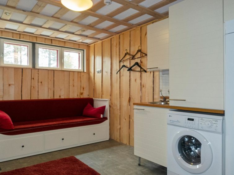 On the ground floor there is sauna, washroom, sauna room/utility room, spreadable sofa in sauna room and separate WC. In addition, spacious sleeping area with double bed. The sleeping area has no windows.