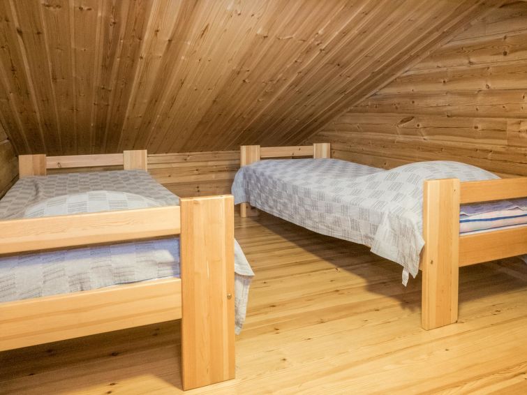 Log terraced house with three apartments, built in 1990, living room/kitchen, 2 bedrooms: 2 beds in each one (width 120 cm), sleeping loft with 4 beds, washroom, sauna (elec. stove), open porch.
