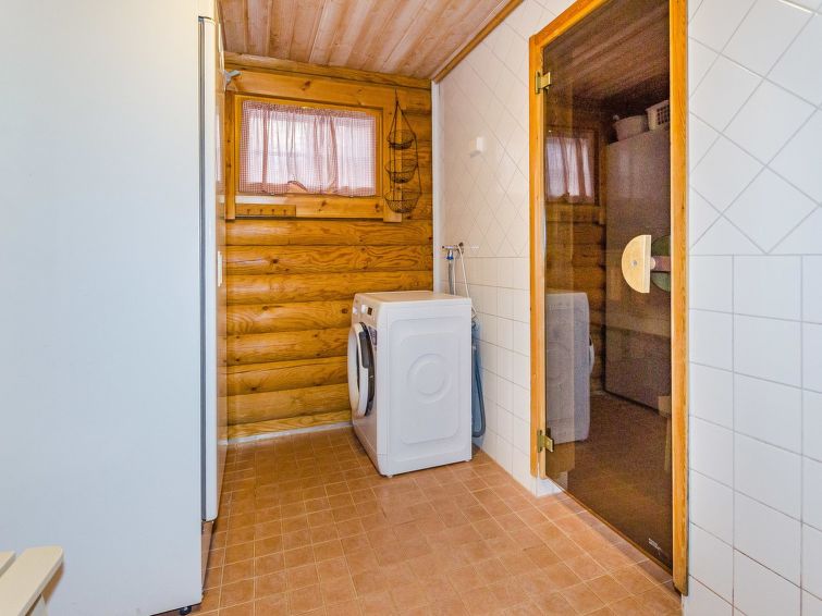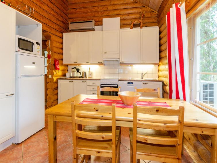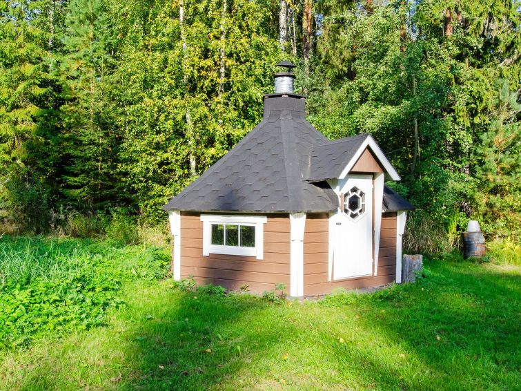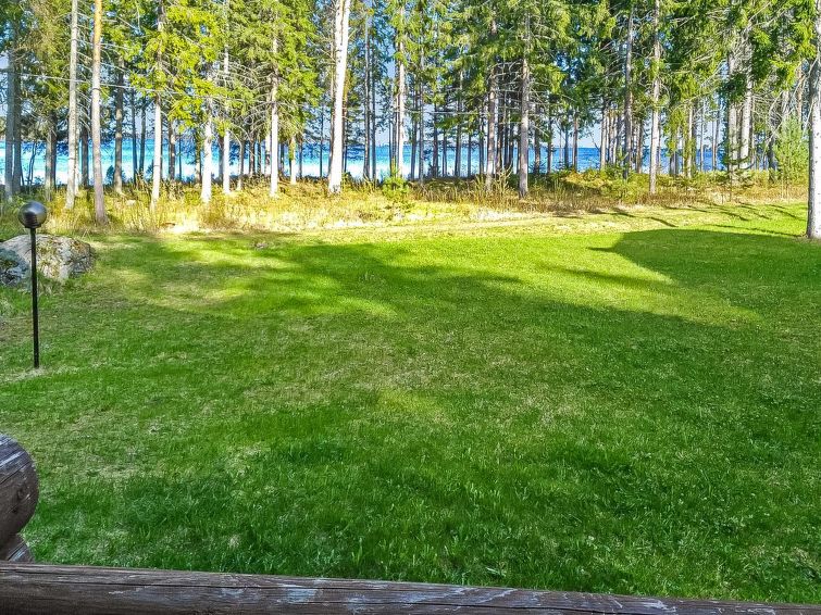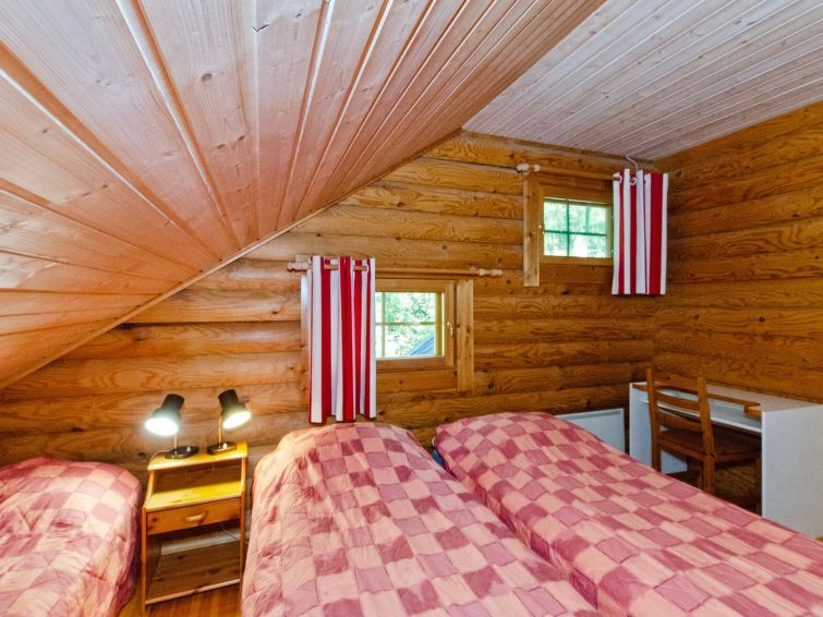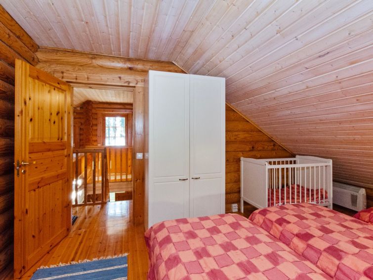 70 km from Joensuu to the North, 60 m to the Lake Pielinen (871,2 km2), shallow common beach with sand bottom (also lot of boats on the beach), own boat. Log cottage 2001, combined kitchen and living room with convertible sofa, bedroom with double bed, bedroom with convertible sofa, bedroom with two beds, washing room, sauna with electric stove, terrace, balcony.