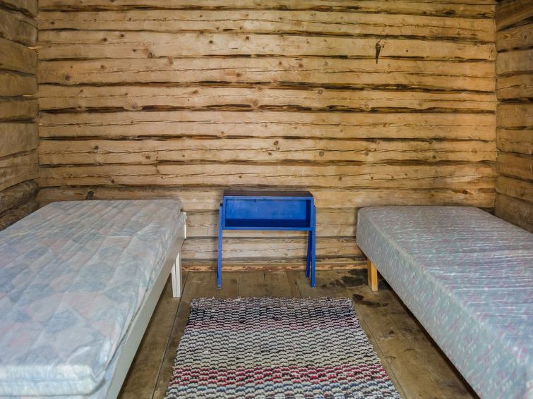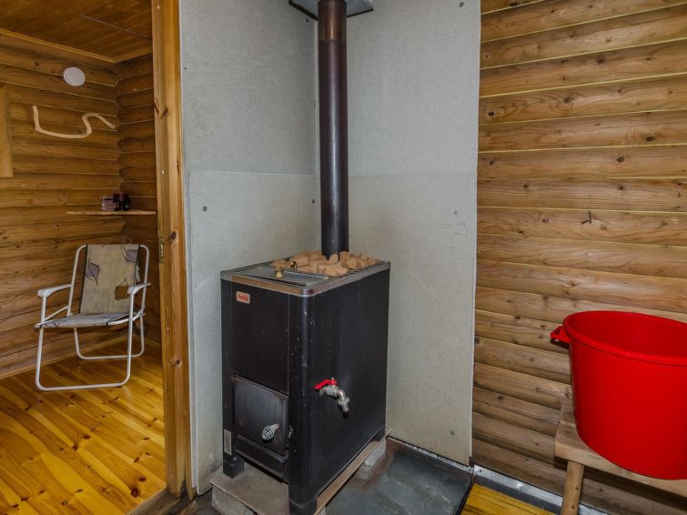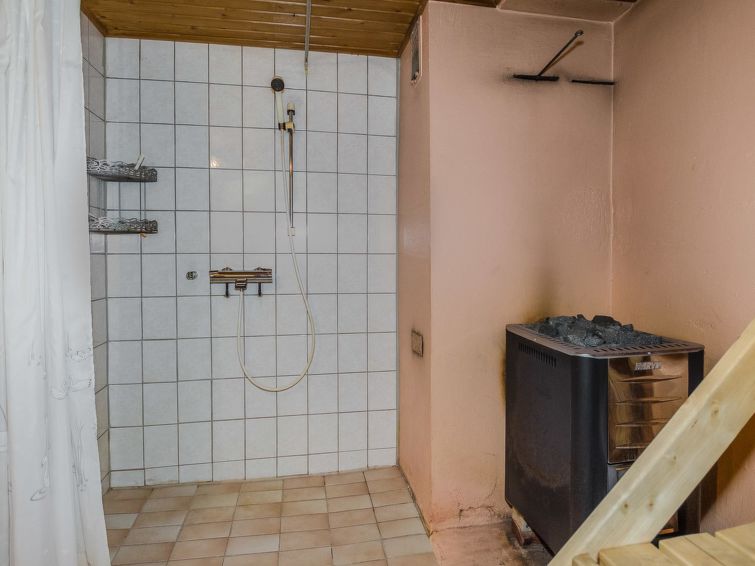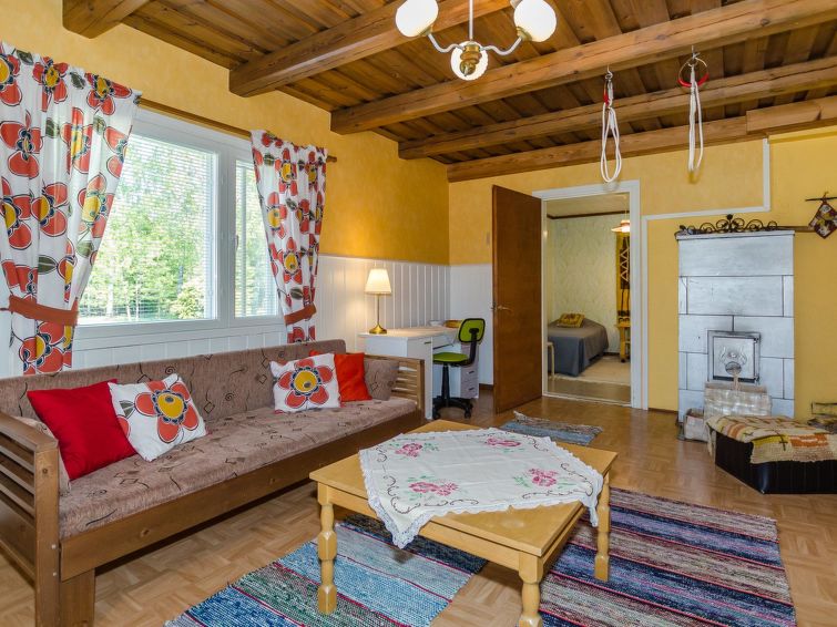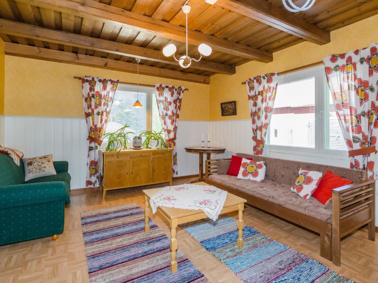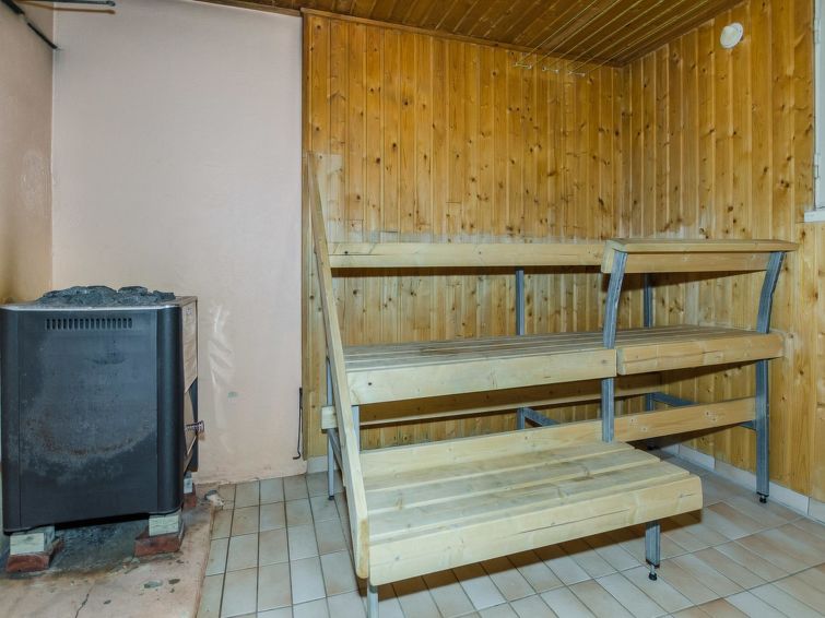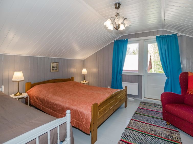 Living room/kitchen, bedroom with double bed, room with spreadable sofa bed, access to the bedroom with 2 beds from this room. Bedroom with bed, double bed and balcony on the upper floor. There is also a bed on the staircase on the upper floor. WC on both floors. On the upper floor wood-heated sauna, shower in steam room and dressing room. Washing machine in the basement. There are also entrance hall, porch and terrace.