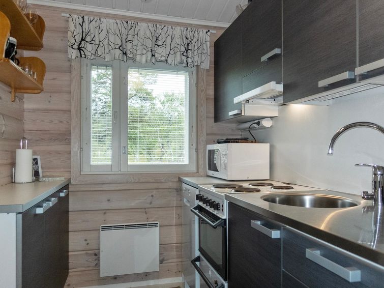 Pursu features 3 rooms and a kitchen. The main bedroom has a 160 cm double bed, the adjacent room has a sofa bed (160 cm) and a TV. The living room includes a sofa and a dining table. The kitchen is equipped with countertops and amenities such as a dishwasher. In addition, there is a sauna, a bathroom with WC, and a dressing room.