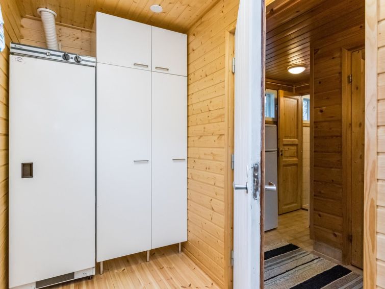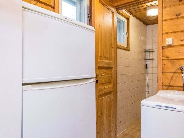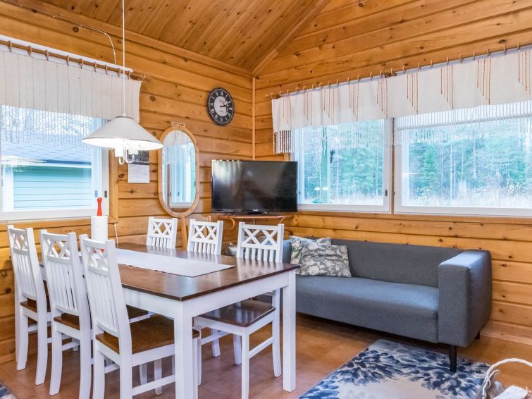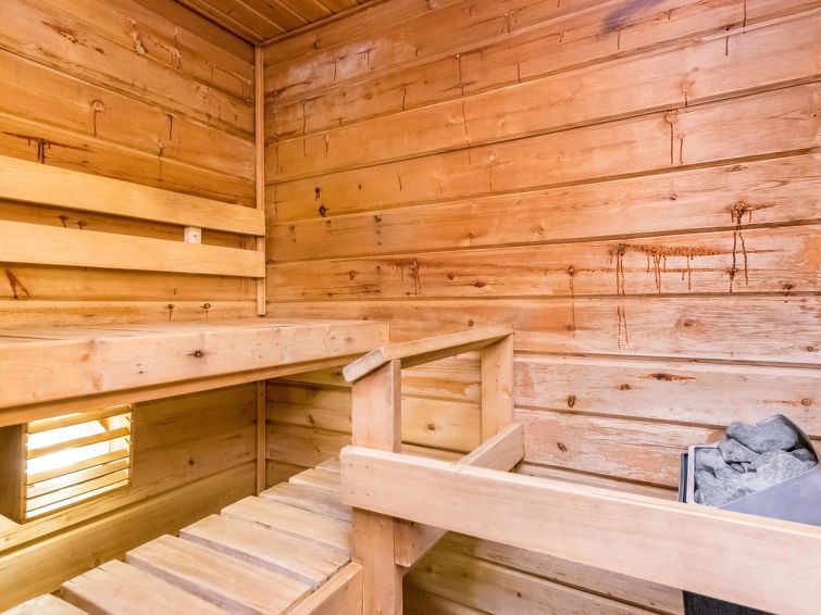 Log cabin with paneled interior built in 1990. Living room/kitchen, 2 bedrooms with double beds, sleeping loft (28m²) with 4 mattresses, sauna (electric stove), washroom and open porch.
