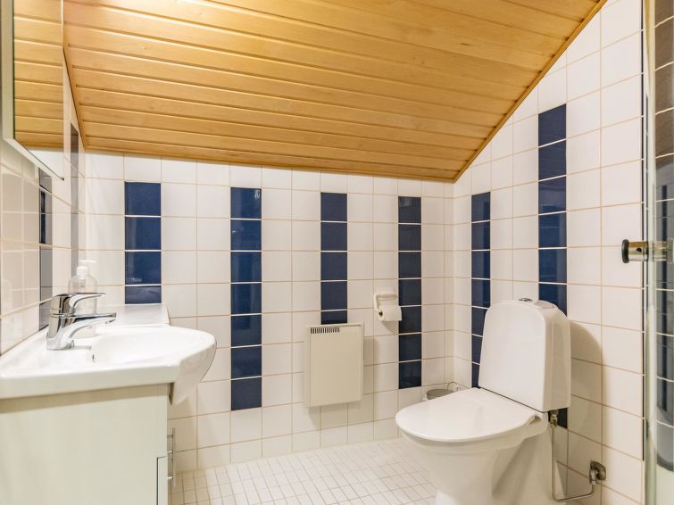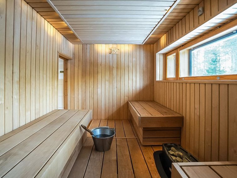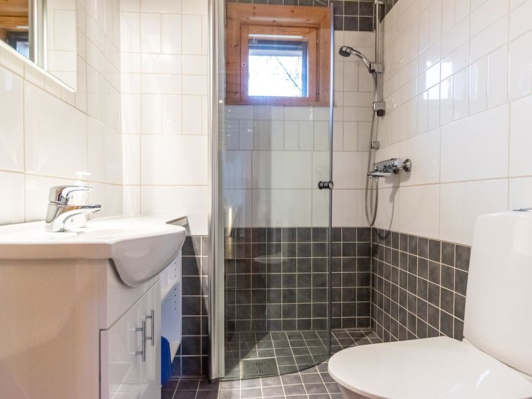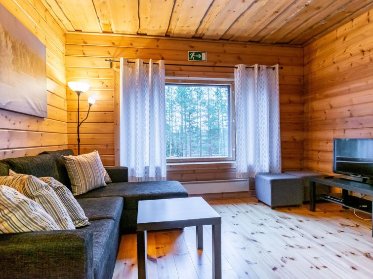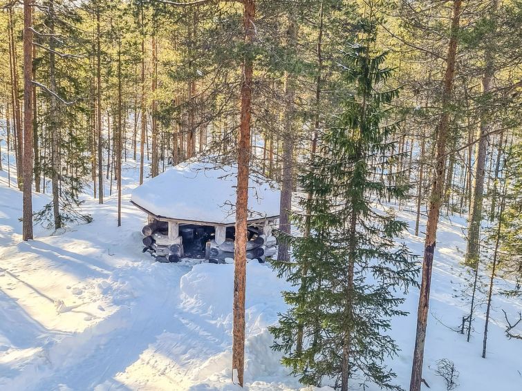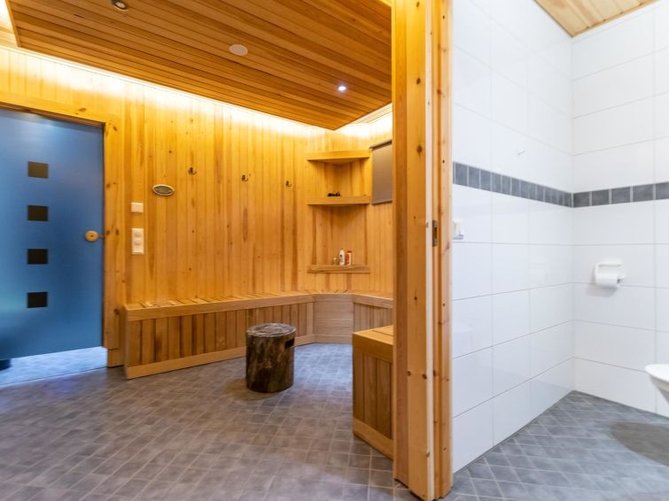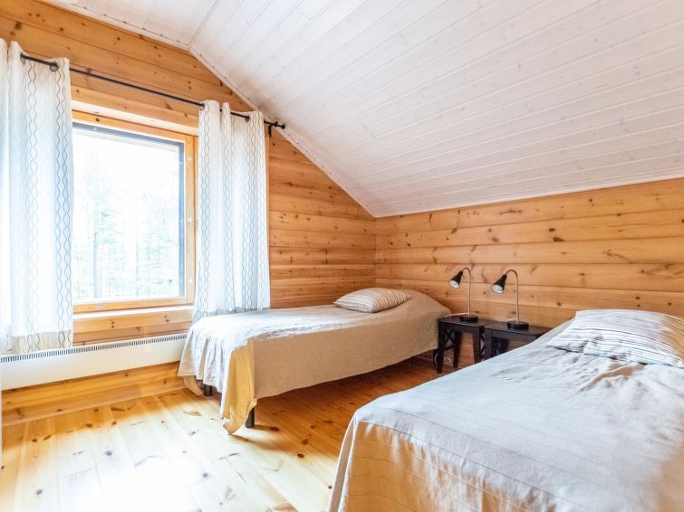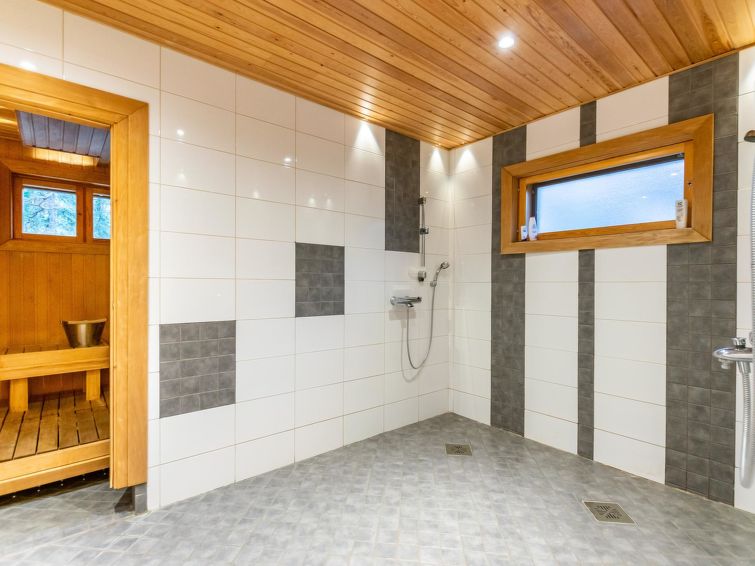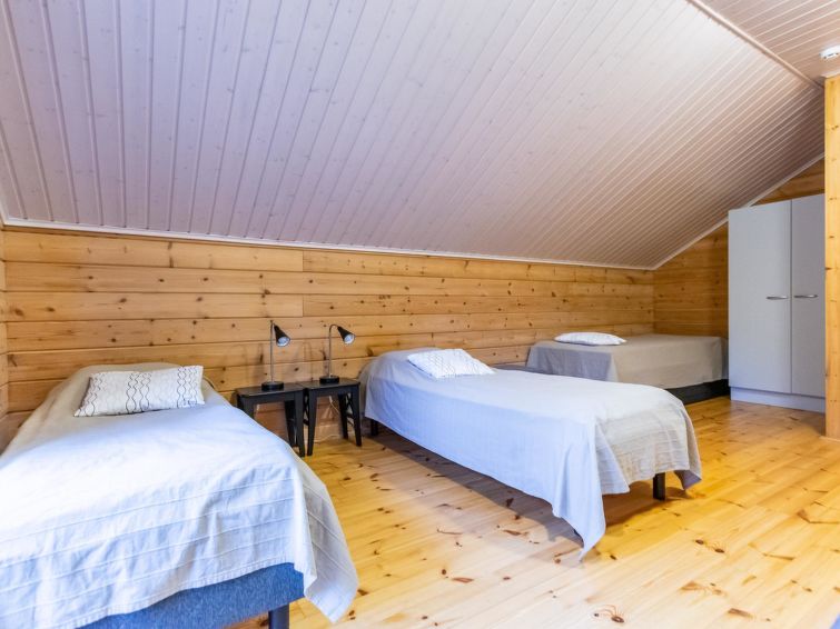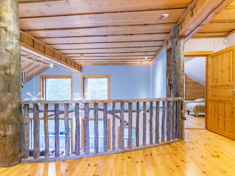 50 km north from Kemijärvi. 3 storey log cabin, built in 2011. In the middle floor there are two bedrooms, living room, kitchen, toilet with a shower and terrace. Upstairs one big bedroom (2 beds 80 x 200cm and one comfortable bed for 2 person), two smaller ones, TV room with a door and a convertible sofa/bed (140*200cm) and toilet with a shower. All bedrooms have two separate beds (80*200cm). Downstairs big living room with fireplace, sauna (electric stove), washroom (3 showers), dressing room, toilet and storage room with 2 drying cupboards. There is also a terrace in downstairs. Wifi 5 G