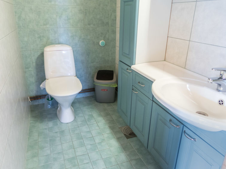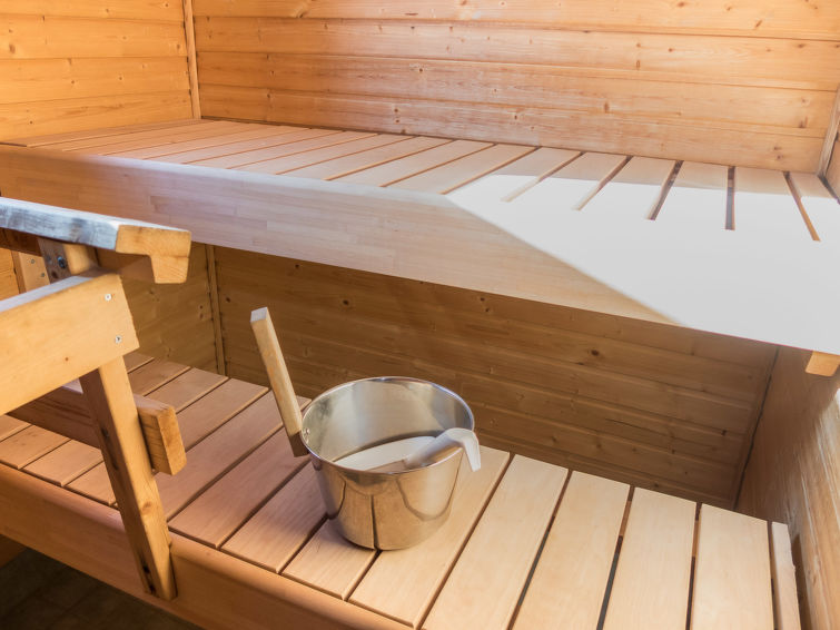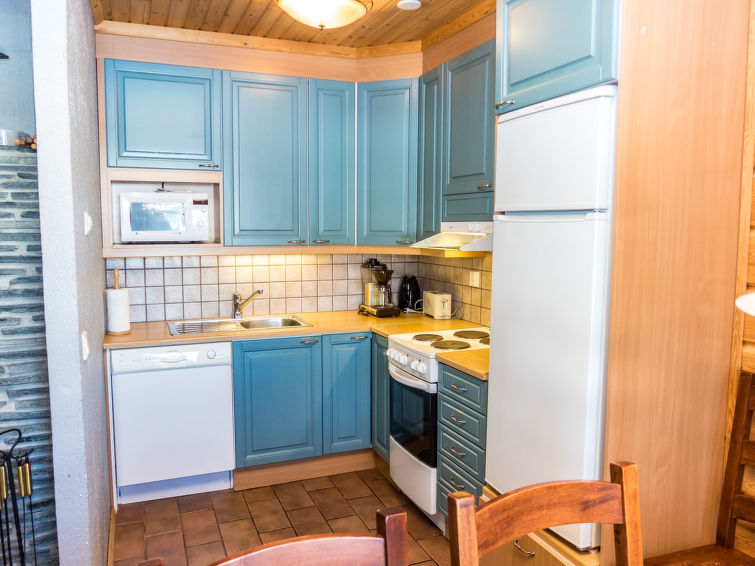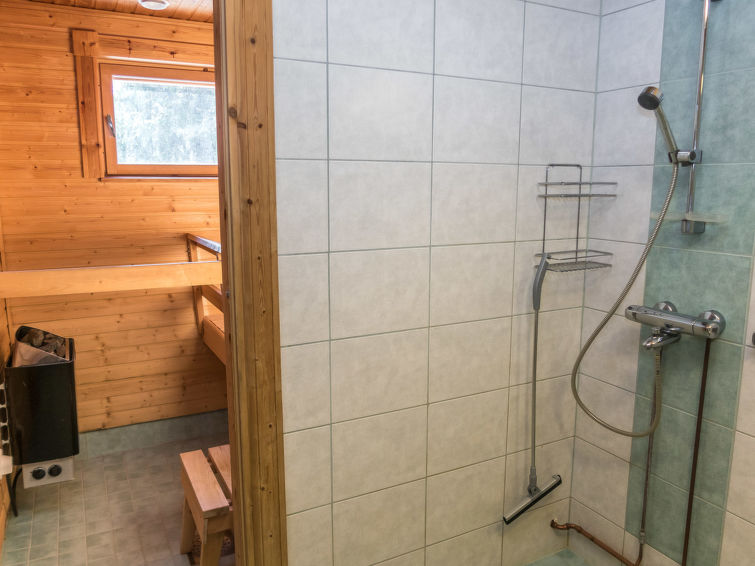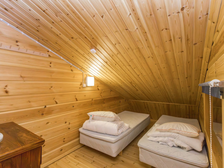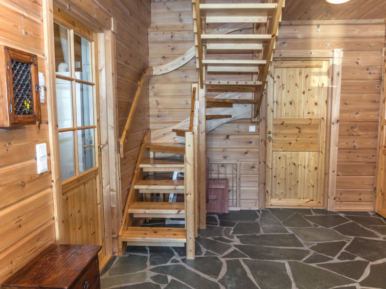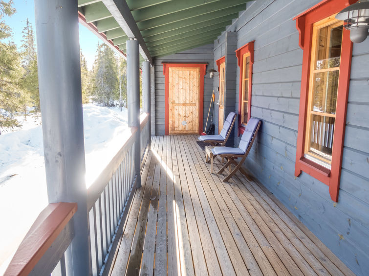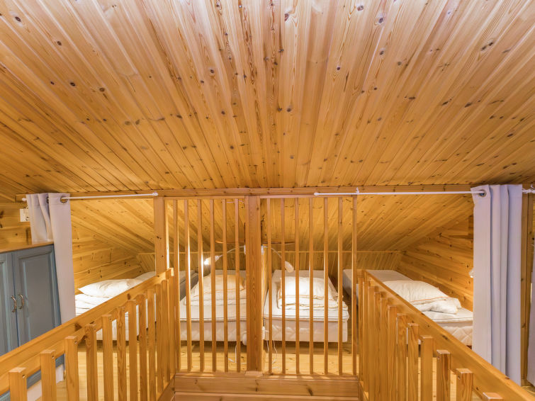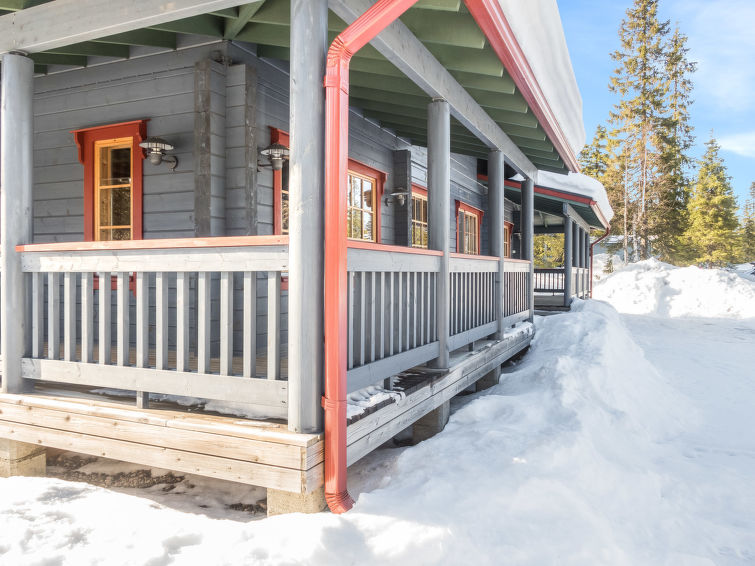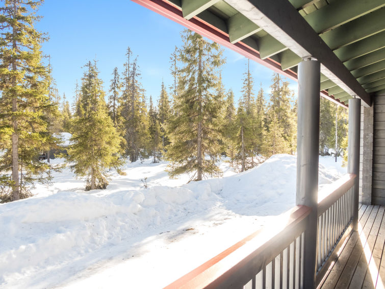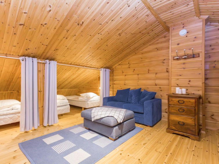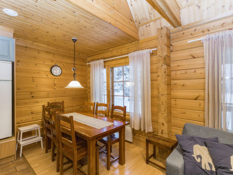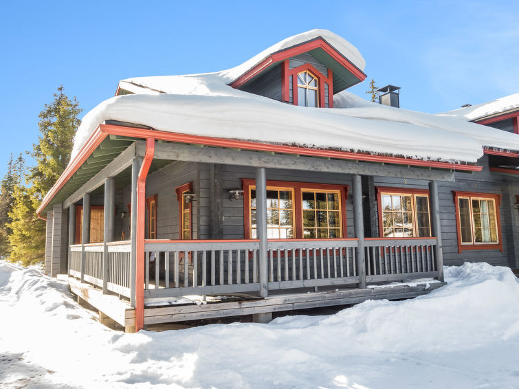 Kitchen and living room, bedroom with double bed, sauna/washroom/toilet, separate WC on the ground floor. Spacious loft with 8 beds and another TV. Storage with e.g. ski waxing table. Other distances: This semi-detached house is located in East-Ruka, the nearest ski lift (Masto slope) is 600 m away. Distance to the Skibus is about 150 m.