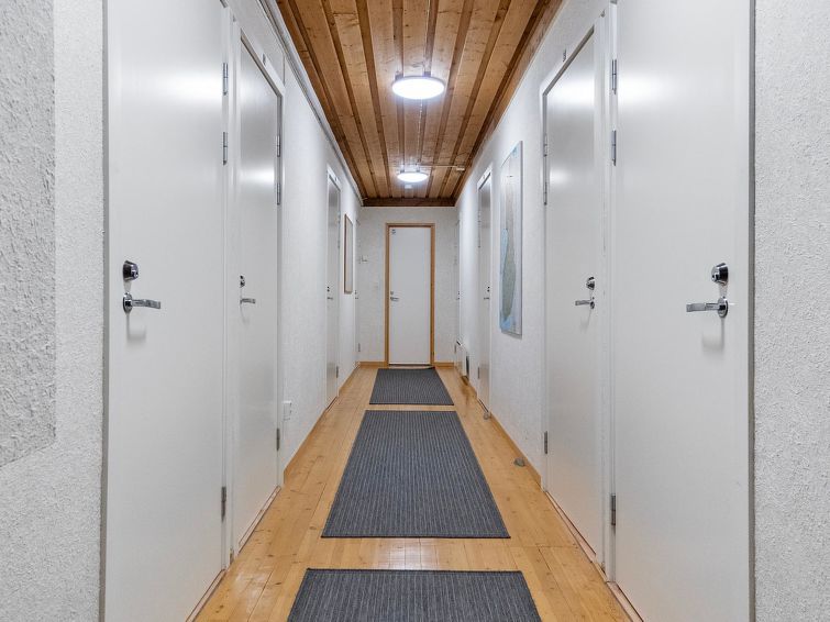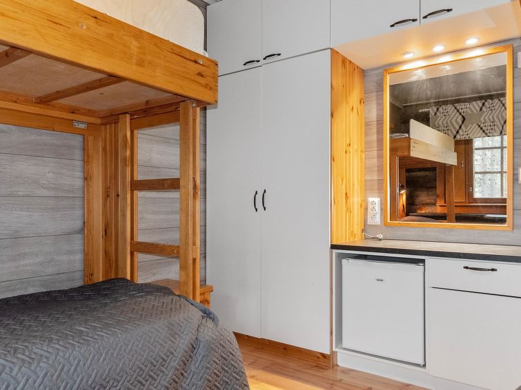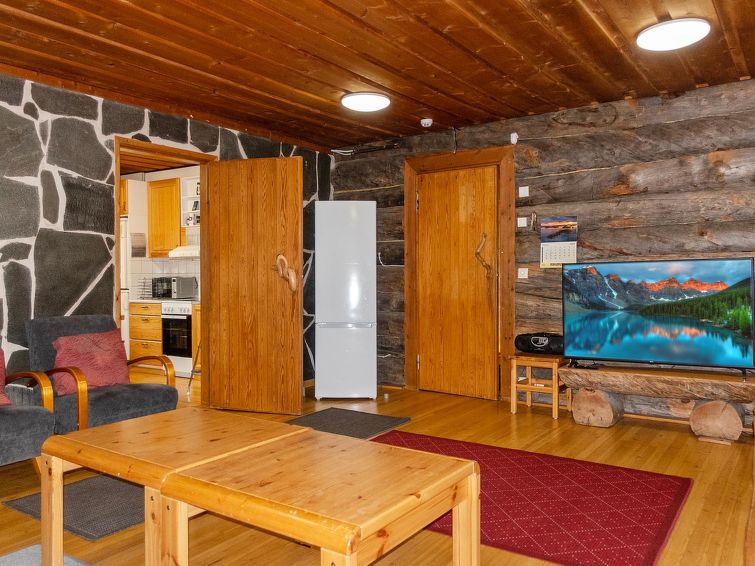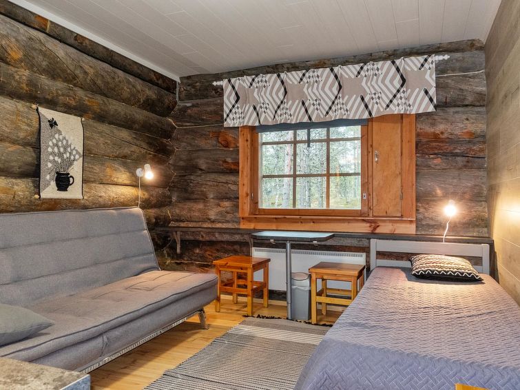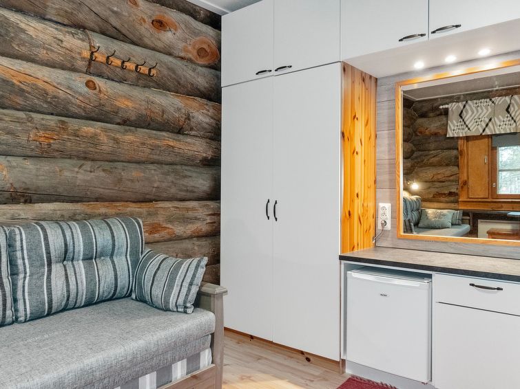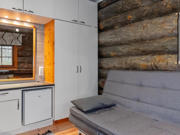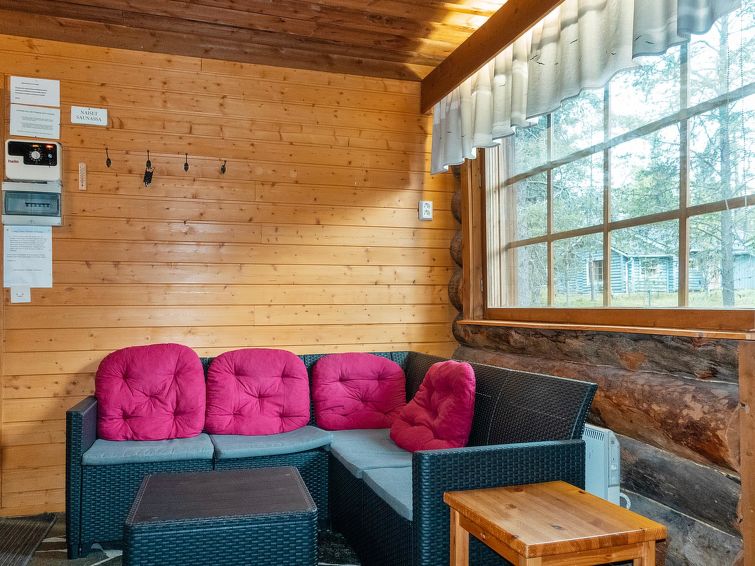 Outside, there is an outbuilding with a ski maintenance space and firewood storage. The parking places with wall outlets are also outside near the cabin. Raahenmaja's location near Urho Kekkonen National Park in the center of Saariselkä is excellent; ski trails, hiking trails, and snowmobile routes are right behind the cabin. Shops and bus stops are within a 10-min walk.