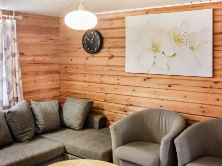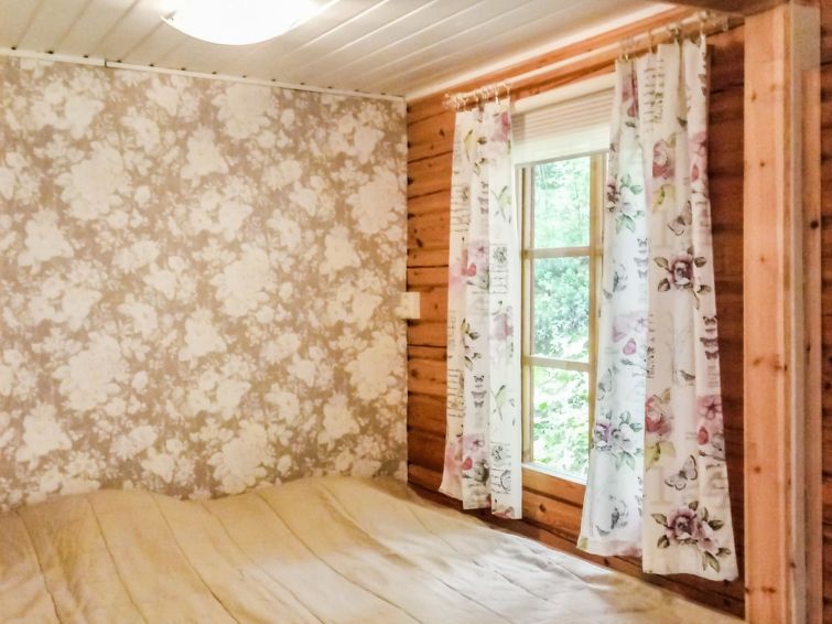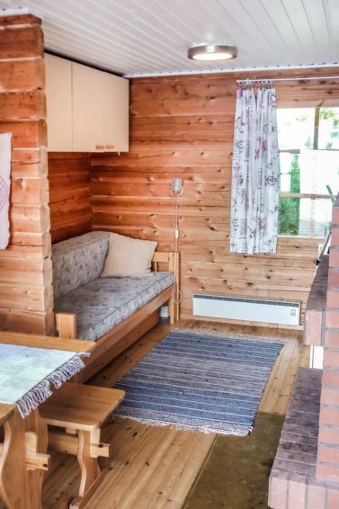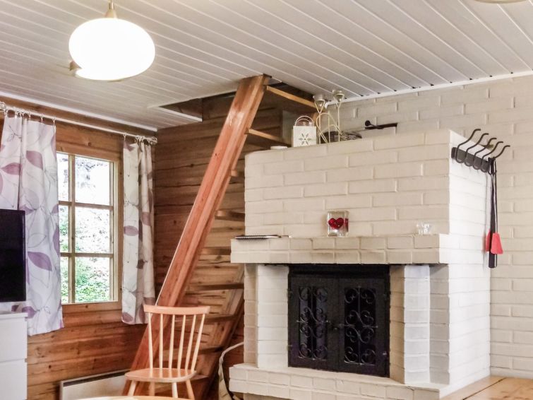 Log cabin, built 1988, located on a hillside plot. Kitchen, living room, bedrooms with double bed, sleeping loft (height on it's highest point 1,7 m, steep stairs) with double bed and 2 single beds, glassed-in porch.