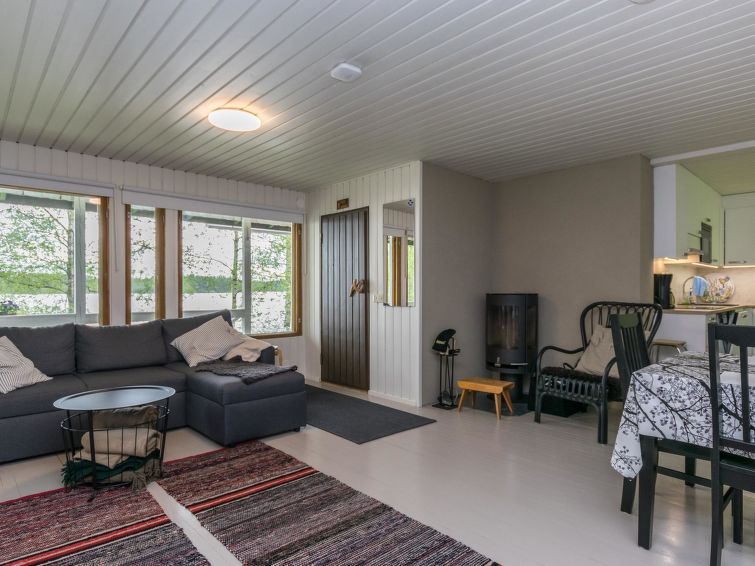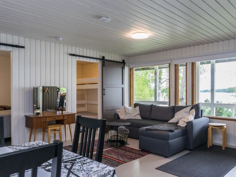Wooden cottage 1980, renovated in 2021, living room/ kitchen convertible sofa for 2 persons, 2 bedrooms; one with double bed, another with bunk bed. Sauna (wood stove) and washroom, toilet, covered porch.