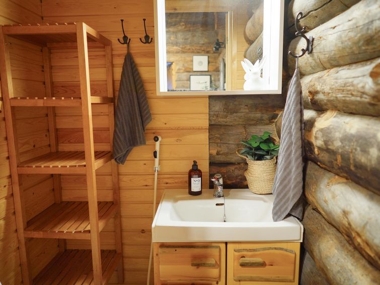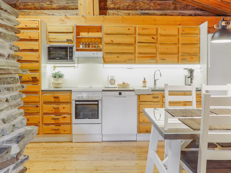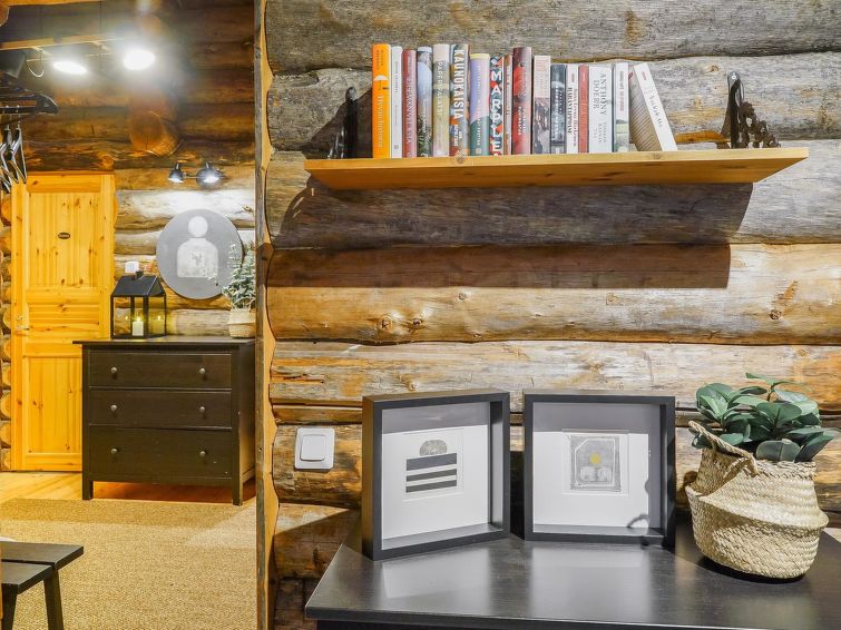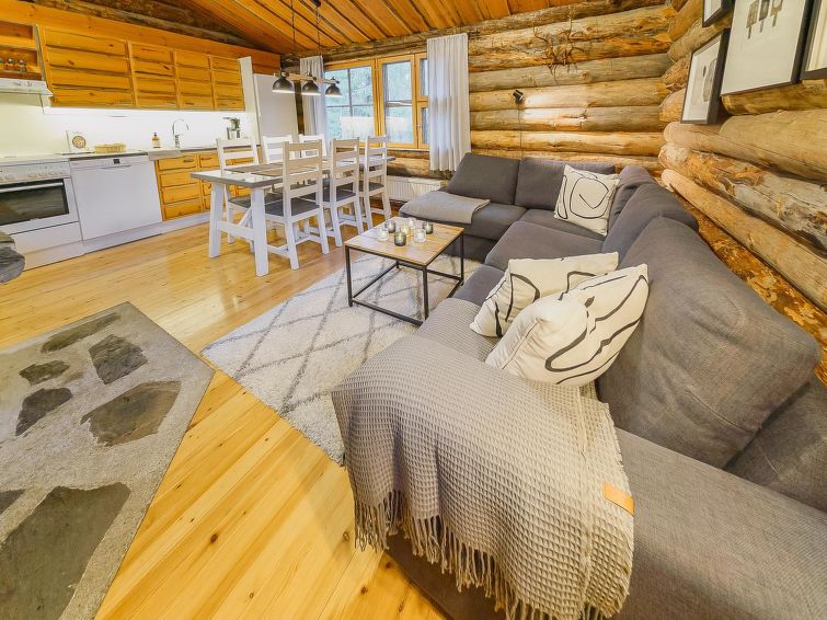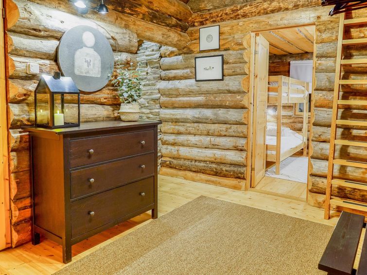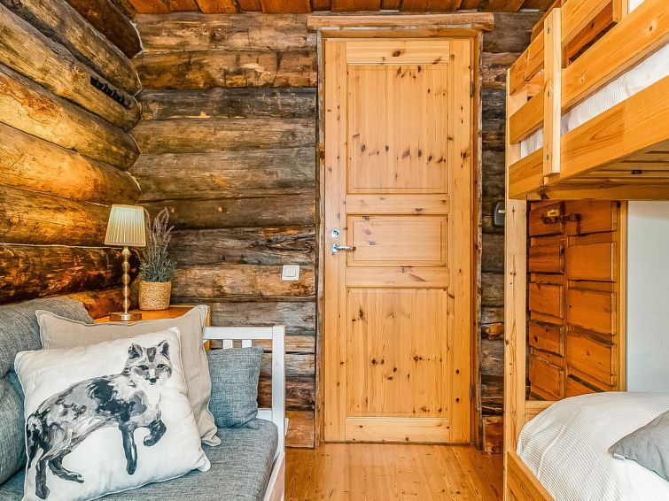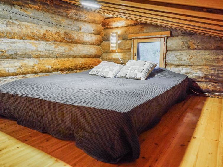 25 km to the north from Kuusamo, Ruka village 3 km. Lake Kesäjärvi 20 m. Apartment in semidetached kelo log house, built in 1991. Bedroom 1: 2 beds, bedroom 2: spreadable sofa bed and bunk bed, living room: spreadable sofa bed, shallow loft (7 m², steep stairs to the loft): mattresses, living room/kitchen, electric sauna.