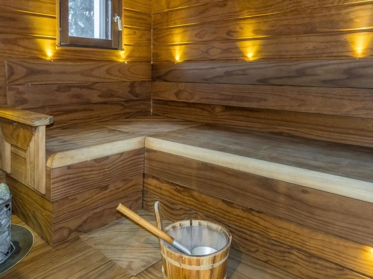On the ground floor, guests can enjoy a spacious open kitchen and living area with large windows overlooking the lake scenery. Two bedrooms offer different accommodation options, one with a double bed and the other with two separate beds. In addition, the ground floor includes a sauna, a bathroom, a utility room, and a separate WC.