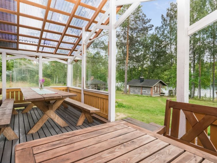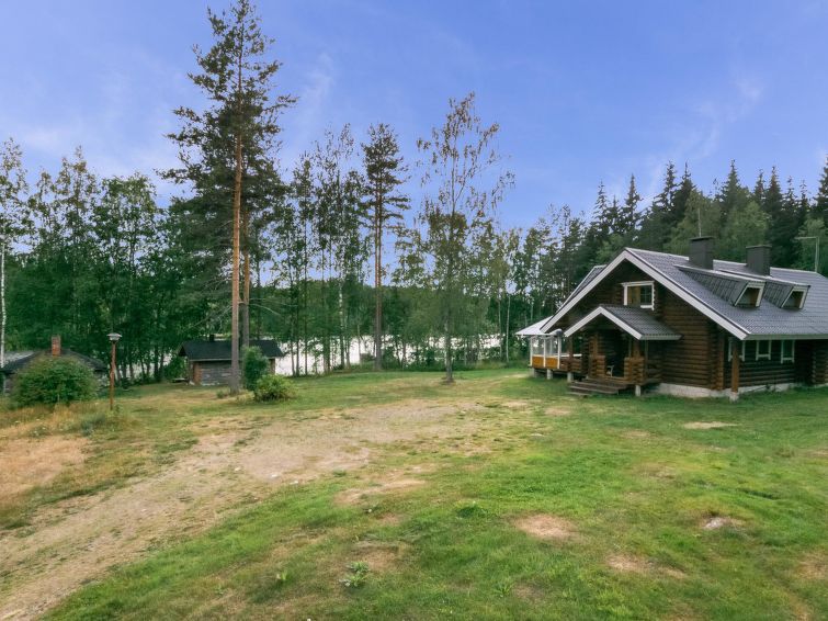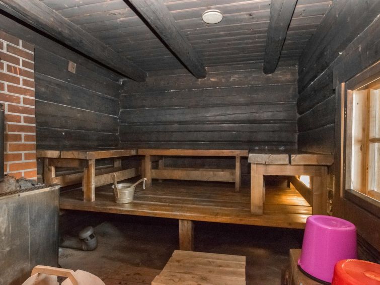 Separate sauna by the lake 15 m², electric lighting, dressing room. Carrying water and woodheated sauna stove, also in winter use. Peaceful location. Yard is wide and flat, suitable for families with children.