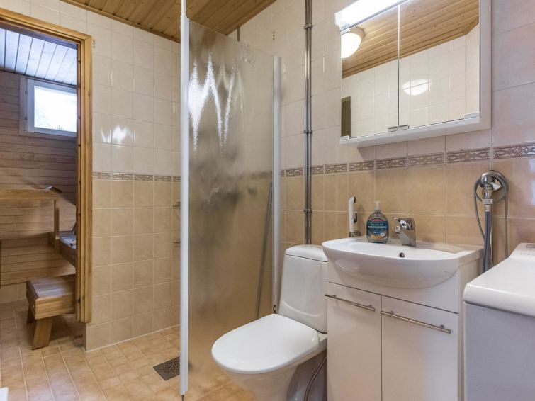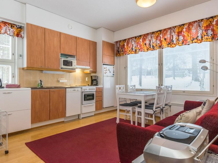 The 40-square-meter apartment has a kitchen/living room, a bedroom, an alcove, a washroom/toilet, a sauna and a small storage. Common ski maintenance room in Outapailakka-apartments premises.
