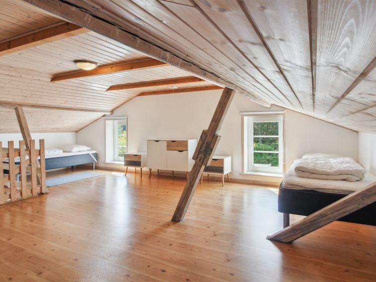 Enmannsbolig, bygget i 1850. 5 km fra sjøen. Privat: tomt 1'394 m2, velholdt hage, svømmebasseng (5 x 8 m, 40 m2, dybde 120- 120 cm dyp, Sesongåpent: 01.Mai. - 30.Sep.). Terrasse (25 m2), lekeplass (huske). I huset: badstu, vaskemaskin, tørketrommel. Bilporten. Daglivarehandel 100 m.