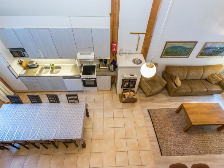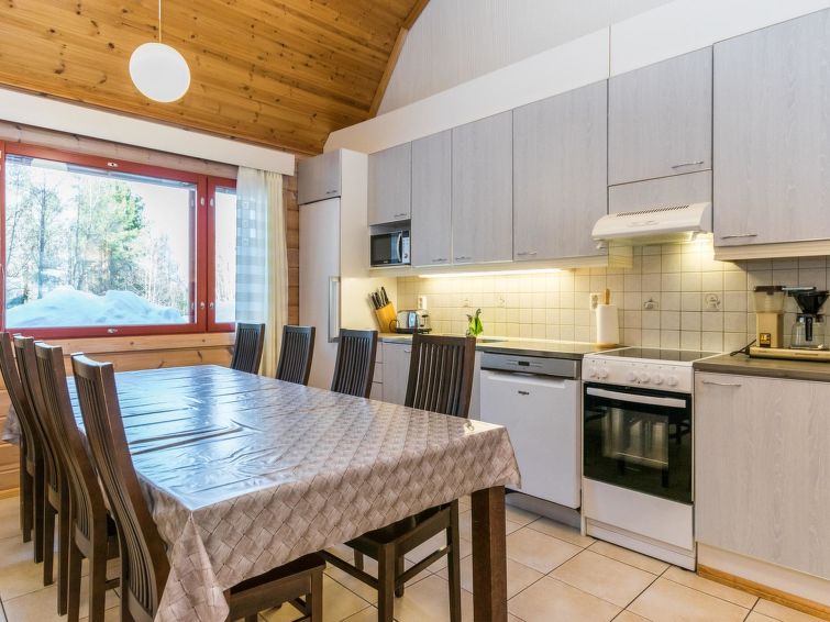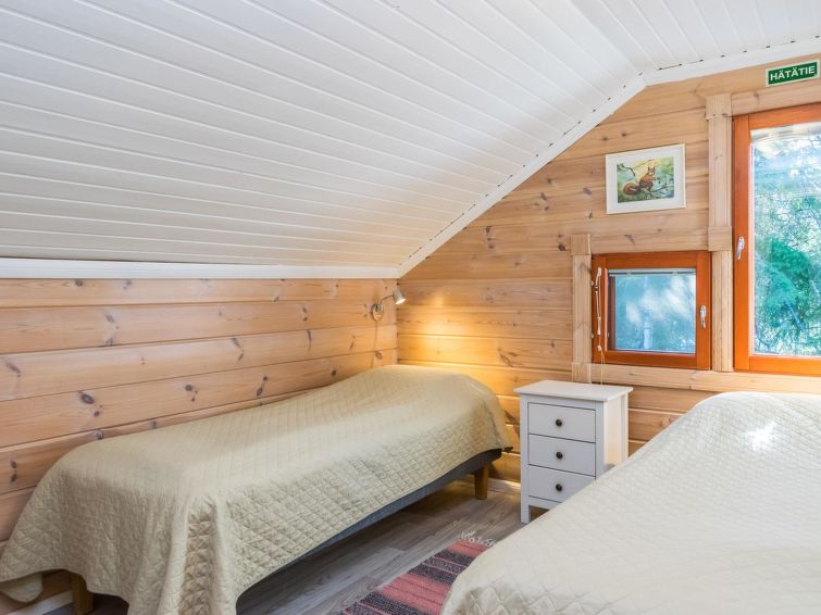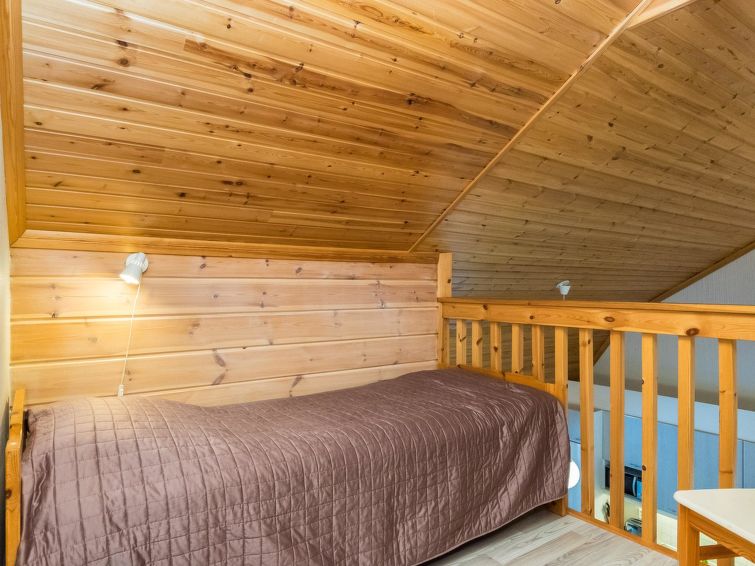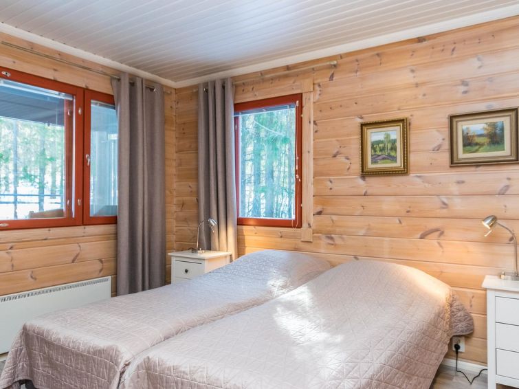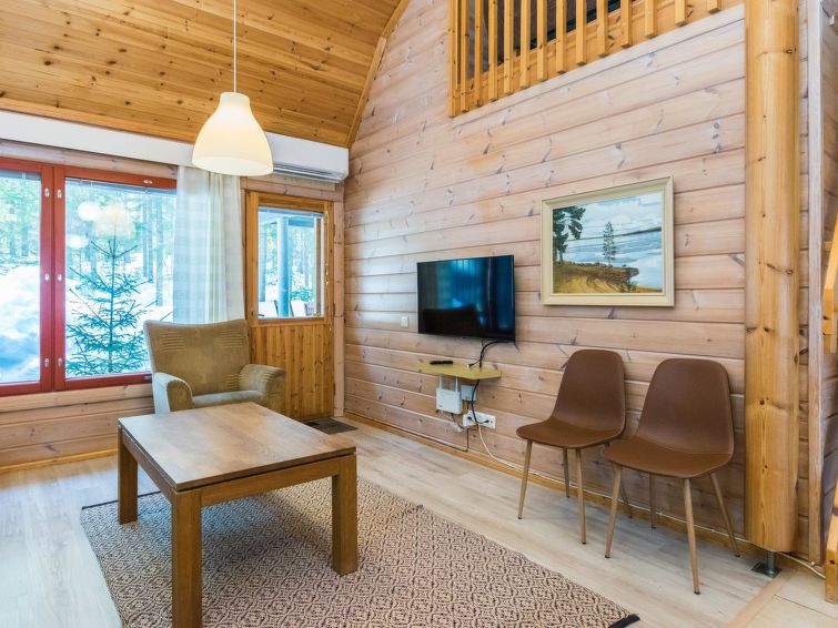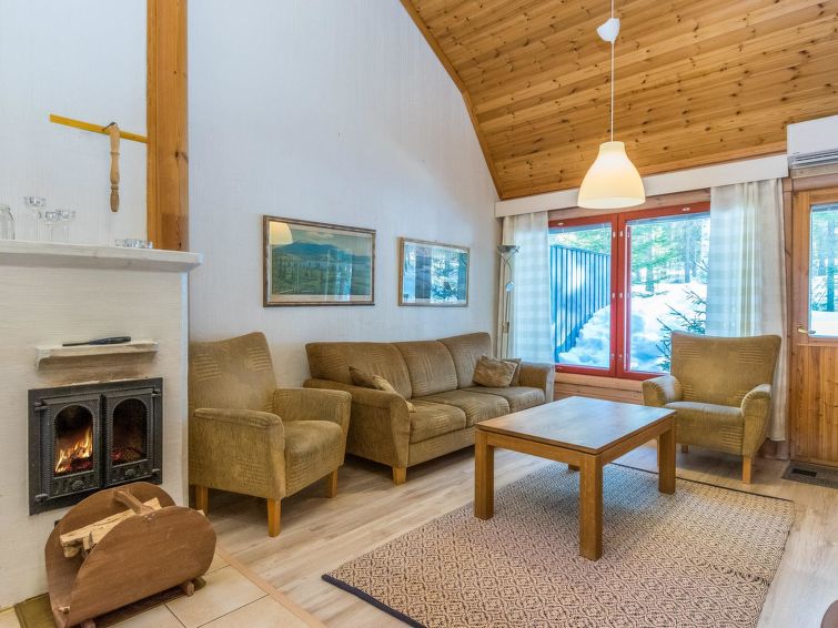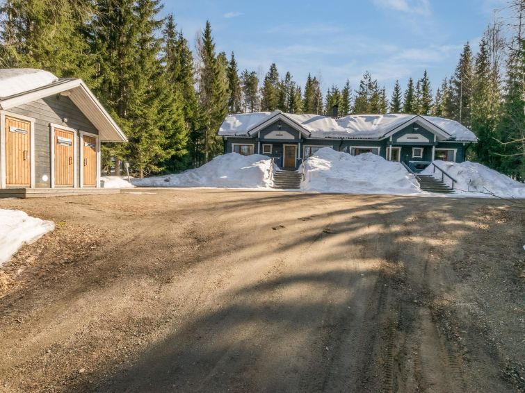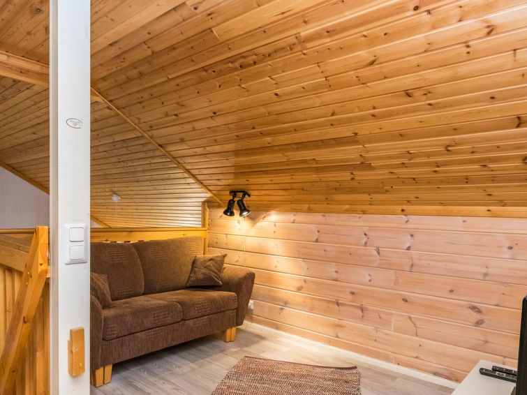 This apartment in log semi-detached house by Lake Nuasjärvi in Vuokatti was completed in 2000. Floor area 80 m², upstairs 30 m². On the ground floor there is combined living room & kitchen and two bedrooms, upstairs there is two bedrooms. All bedrooms with separate beds for two, loft with bed for one. Sauna (electric heating), washroom, 2 toilet. Terrace with the gas barbeque (use only on summertime). Separate store/ serviceroom for the skies. 2 x TV. Internet connection + russian TV chanels (Channel One Russian, NTV Mir ja Euronews) Kajaani 33 km, Sotkamo 8 km. Vuokatti ski slope 1,5 km, cross country track 100 m. Beach 200 m.
