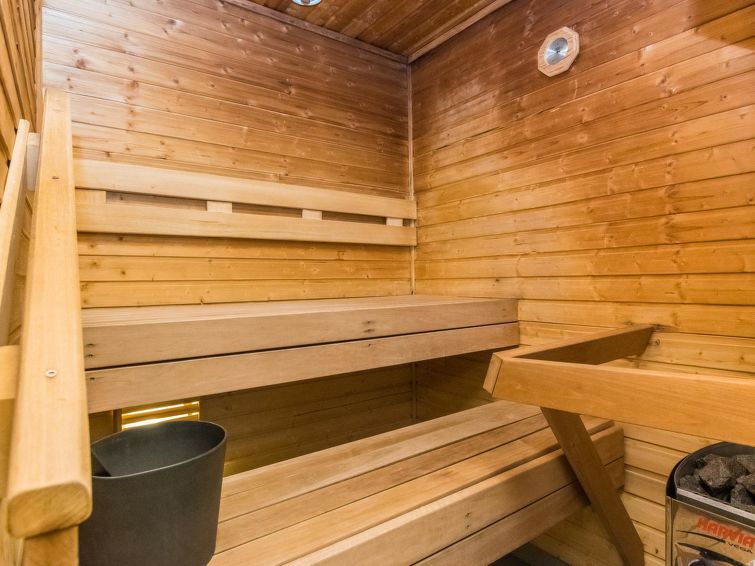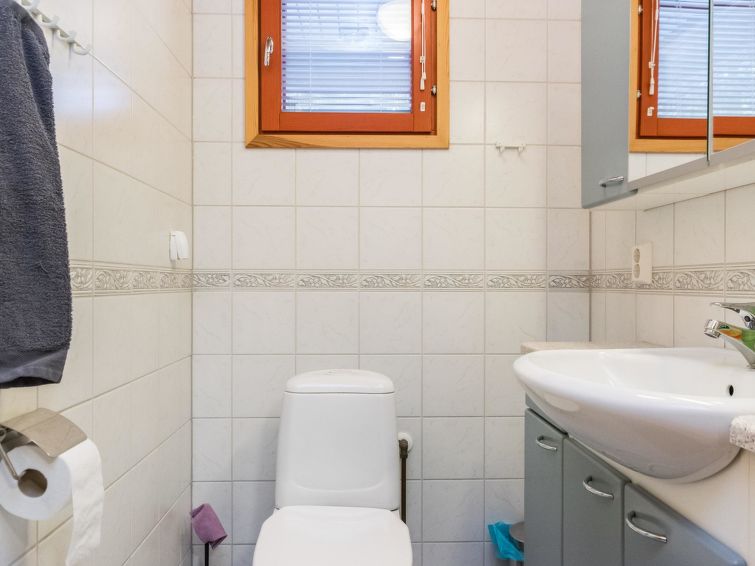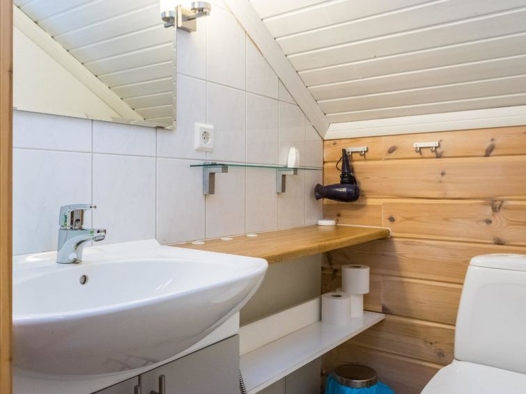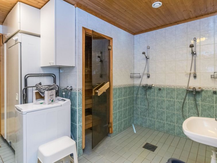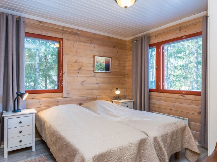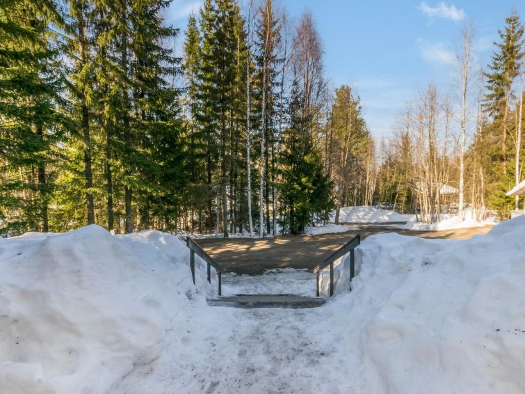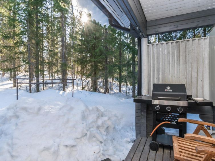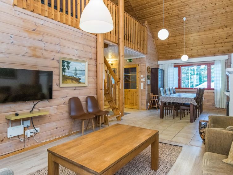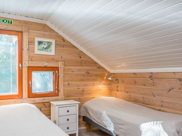 This apartment in log semi-detached house by Lake Nuasjärvi in Vuokatti was completed in 2000. Floor area 80 m², upstairs 30 m². On the ground floor there is combined living room & kitchen and two bedrooms, upstairs there is two bedrooms. All bedrooms with separate beds for two, loft with bed for one. Sauna (electric heating), washroom, 2 toilet. Terrace with the gas barbeque (use only on summertime). Separate store/ serviceroom for the skies. 2 x TV. Internet connection + russian TV chanels (Channel One Russian, NTV Mir ja Euronews) Kajaani 33 km, Sotkamo 8 km. Vuokatti ski slope 1,5 km, cross country track 100 m. Beach 200 m.