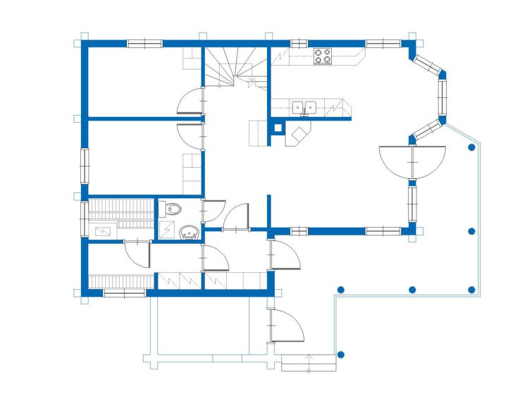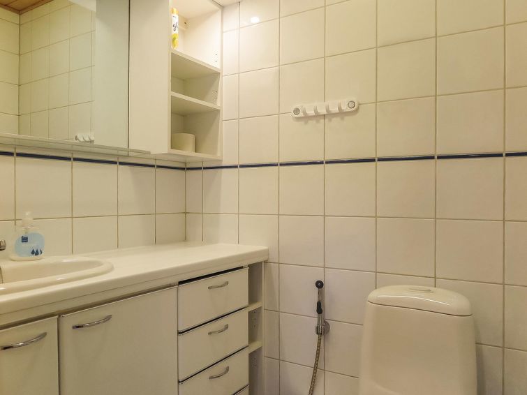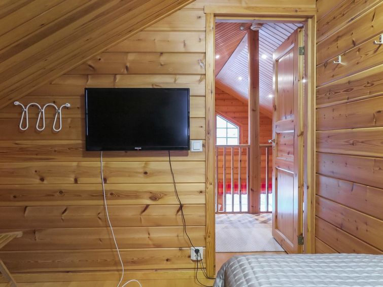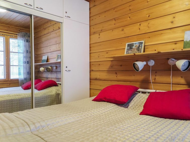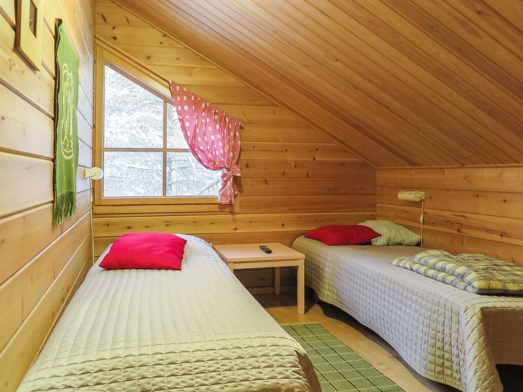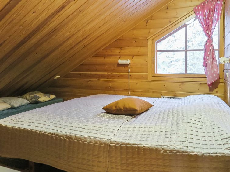 On the ground floor living area/kitchen, 2 bedrooms, each with 2 beds, sauna, washroom, separate WC and a covered porch. On the upper floor there are 2 bedrooms with sloped roofs, each with 2 beds, WC also on the upper floor.