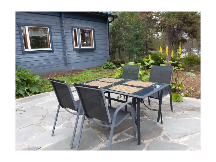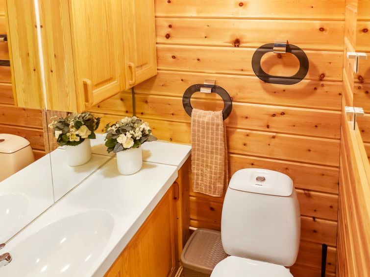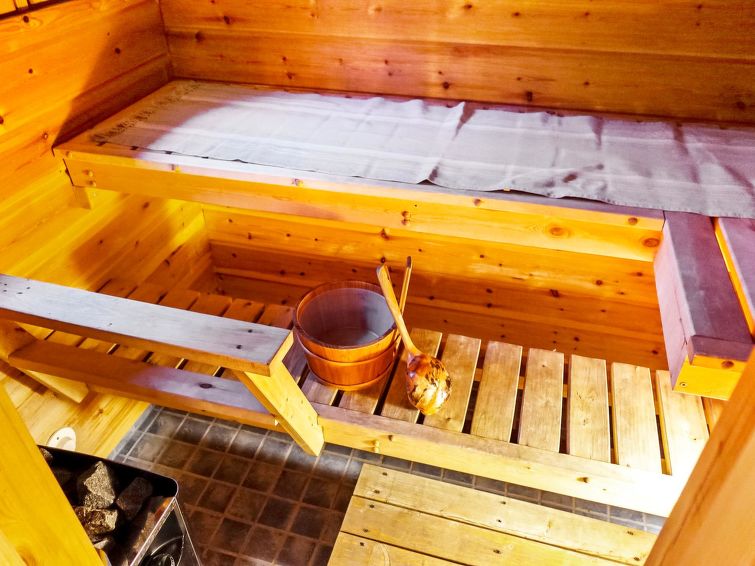 Planed log cabin, inner walls are log-paneled, built in 1973, extended in 1990. Living room with 2 sofa beds, kitchen, bedroom with 1 bed (width 140 cm), loft with 4 mattresses, steep stairs to the loft, sauna, washroom/WC, separate toilet, covered porch and patio. Separate storage.