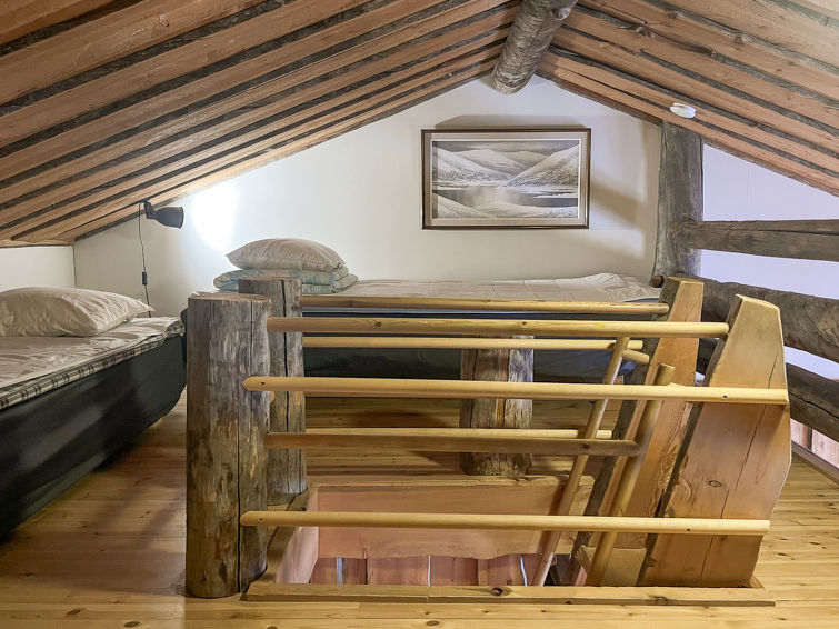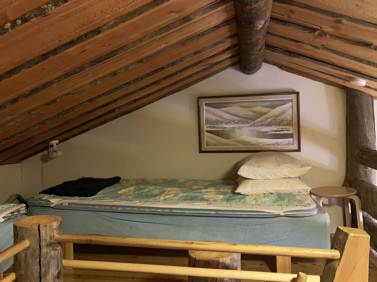 45 km north from Kemijärvi, located in Pyhätunturi ski resort, lake Pyhäjärvi 5 km. Silver log row house apartment built in 1990, with living room/kitchen, bedroom with 2 beds, 4 mattresses on the sleeping loft (to which steep stairs), washroom and sauna (elec. stove).