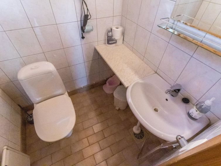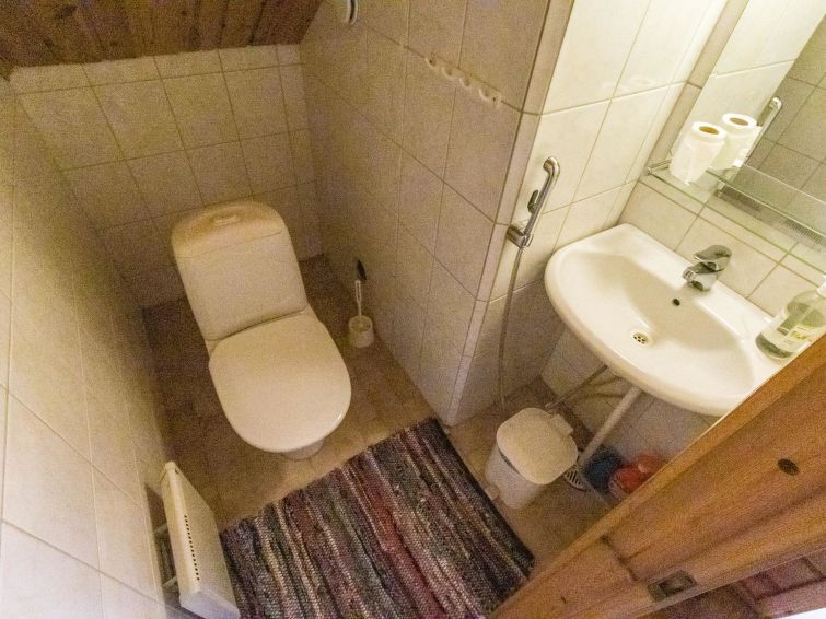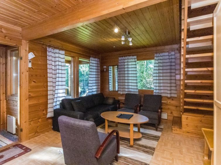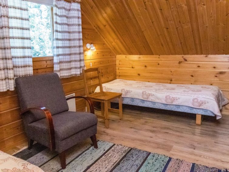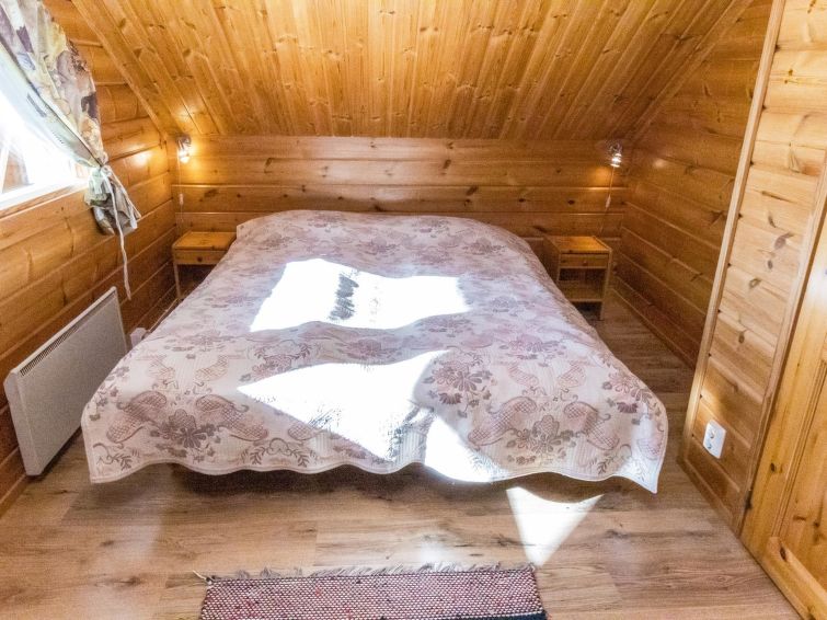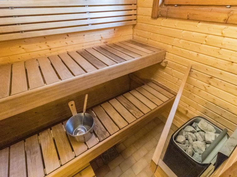 Log cabin 1999, living room/kitchen, downstairs: bedroom 2 beds, in upper floor bedroom 2+1 beds, bedrooms with 2 beds, Child safety gate downstairs and upstairs, washroom, sauna (electric sauna stove), terrace. Own grill in outdoor grill and own playhouse.