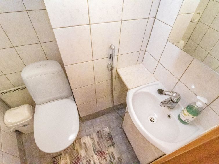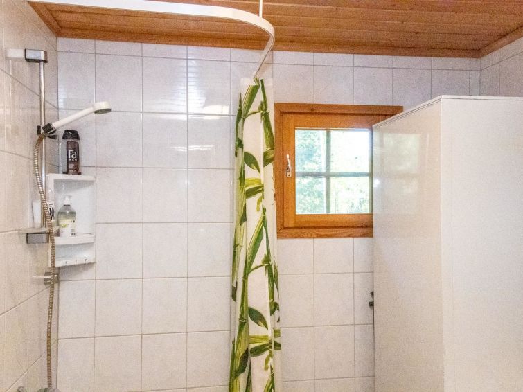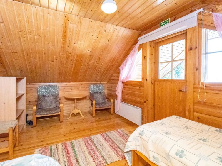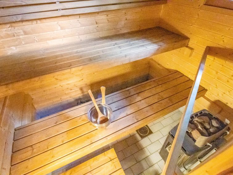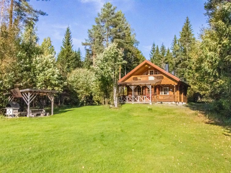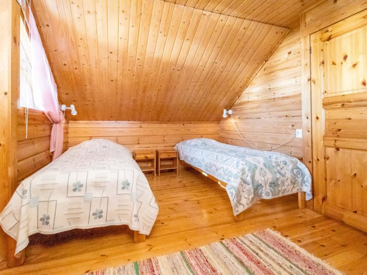 Log cabin 1998, living room/kitchen, bedroom 2 beds, in upper floor 2 bedrooms both with 2beds, Child safety gate in downstairs, washroom, sauna (electric sauna stove), open veranda. One WC in upper floor, another downstairs. Own grill in outdoor grill and own playhouse.