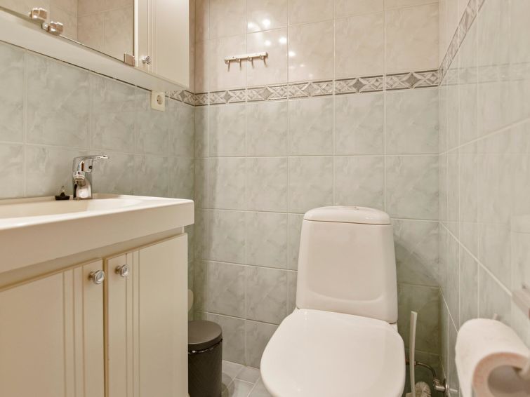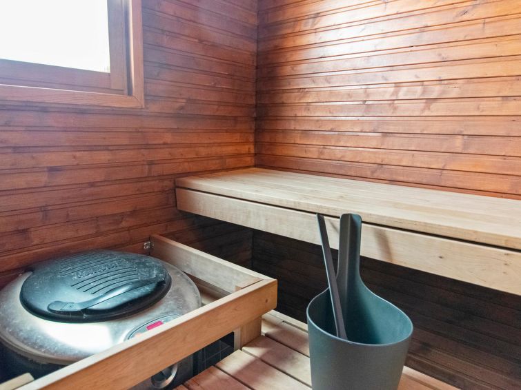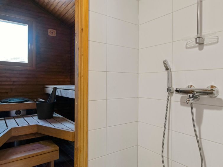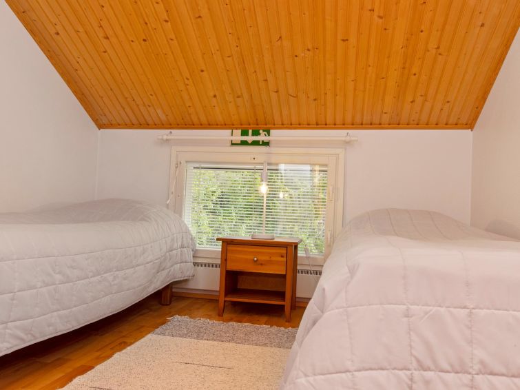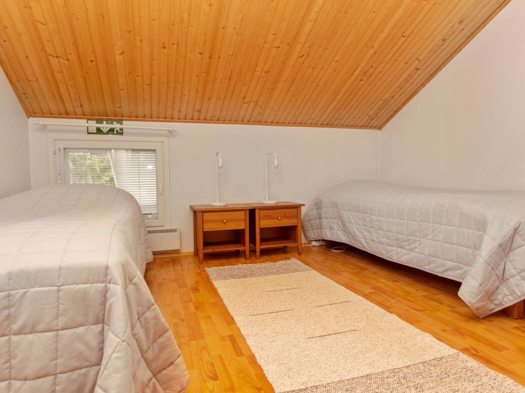 Living area is 72,5 m². On the ground floor there is combined living room & kitchen and one bedroom with twin bed. Upstairs there are two bedrooms, both with separate beds for two. Open loft with sofabed for 1-2 persons, toilet. Sauna (electric heating), washroom, shower and separate toilet.